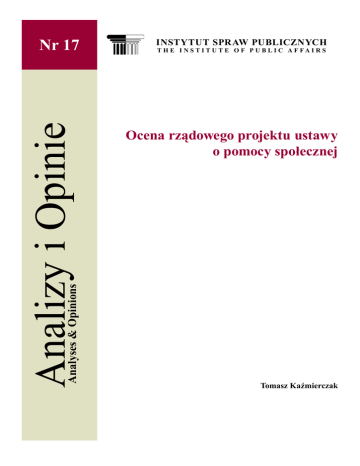 Analyses & Opinions Analizy i Opinie Nr 17 INSTYTUT SPRAW PUBLICZNYCH T H E I N S T I T U T E O F P U B L I C A F FA I R S Ocena rządowego projektu ustawy o pomocy społecznej Tomasz Kaźmierczak 2 Ocena rządowego projektu ustawy o pomocy społecznej Ocena rządowego projektu ustawy o pomocy społecznej Tomasz Kaźmierczak • Rząd powinien wycofać z Sejmu projekt ustawy o pomocy społecznej, nie spełnia on bowiem oczekiwań wiązanych z tą ważną ustawą. W proponowanym kształcie ustawa nie przyczyni się do reformy finansów publicznych, nie wprowadza też istotnych nowych regulacji i rozwiązań, nie proponuje rzeczywistej przebudowy systemu pomocy społecznej w Polsce. Projekt jest niespójny z przyjętymi wcześniej ustawami o organizacjach pożytku publicznego i wolontariacie oraz ustawą o zatrudnieniu socjalnym. Przyjęcie ustawy w obecnym kształcie może utrudnić i poważnie odwlec rzeczywistą reformę systemu polityki społecznej w Polsce. Rząd skierował do Sejmu projekt nowej ustawy o pomocy społecznej. Oceniając ten projekt trzeba uwzględnić szczególny kontekst, w jakim nowe przedłożenie rządowe się pojawiło. Po pierwsze, nowa ustawa przygotowywana jest jednocześnie z działaniami rządu zmierzającymi do reformy finansów publicznych. Należałoby zatem oczekiwać, że albo znajdą się w niej regulacje pozwalające osiągać cele pomocy społecznej w sposób bardziej efektywny, albo też takie, które ograniczą jej zakres. i wolontariacie, o zatrudnieniu socjalnym oraz trzy inne przygotowywane ustawy: o świadczeniach rodzinnych, promocji zatrudnienia i instytucjach rynku pracy oraz właśnie ustawa o pomocy społecznej. Można by oczekiwać, że w całym tym pakiecie ostatnia ustawa pełniłaby centralną rolę. Pojawia się zatem pytanie, w jakich relacjach do już przyjętych ustaw pozostaje złożony w Sejmie projekt ustawy. Czy rzeczywiście obserwujemy jakąś istotną zmianę, by nie powiedzieć jakościowy Innymi słowy, że projektowana ustawa będzie spójna z polityką społeczno-gospodarczą rządu. przełom, w podejściu do polityki społecznej? Po drugie, aktywność legislacyjna rządu w zakresie polityki społecznej oraz deklaracje przedstawicieli rządu wskazują, że mamy do czynienia z zamiarem wprowadzenia w życie nowej całościowej koncepcji regulacji tej sfery życia społecznego. Składają się nań m.in. przyjęte przez Sejm ustawy o organizacjach pożytku publicznego Instytut Spraw Publicznych Po trzecie, polityka społeczna w wielu krajach europejskich, ale nie tylko, znajduje się w fazie poszukiwania nowych rozwiązań po załamaniu się modelu polityki społecznej państwa opiekuńczego, którego istotą był szeroki zakres transferów socjalnych. Zmierzch redystrybucyjnej polityki społecznej wiąże się przede wszystkim z jej kosztami, których nawet najlepsze gospodarki Analizy i Opinie, 17 3 Ocena rządowego projektu ustawy o pomocy społecznej nie są w stanie udźwignąć. Nie bez znaczenia jest również jej destrukcyjny wpływ na kondycję moralną społeczeństwa i rozpowszechnianie się postawy „jazdy na gapę” – czerpania korzyści z dóbr, które powstały bez własnego udziału. W niektórych krajach poszukiwania te przybrały już formę wdrożonych reform (np. w Wielkiej Brytanii i w Stanach Zjednoczonych), w innych dyskusja trwa. W szczególności rozważany jest model tzw. aktywnej polityki społecznej, w którym wsparcie ze środków publicznych ma służyć aktywnemu uczestnictwu w życiu społecznym. Poszukiwania te odzwierciedlają także długofalowe plany Unii Europejskiej, czego najlepszym wyrazem jest Strategia Lizbońska. Pojawia się zatem pytanie, czy w projekcie nowej ustawy o pomocy społecznej owe współczesne poszukiwania i dylematy znalazły swoje odbicie? Czy stanowi ona polski wkład w toczącą się dyskusję nad nowym paradygmatem polityki społecznej? Oceniając rządowy projekt ustawy o pomocy społecznej trzeba uwzględnić powyższe pytania. Co nowego wnosi projekt rządowy do systemu pomocy społecznej? O mawiany projekt ustawy jest uderzająco podobny do ustawy obecnie obowiązujacej. Wiele zapisów pozostało bez zmian, wiele innych zostało nieco zmienionych (przy tym często nowa formuła jest gorsza od starej). W gruncie rzeczy „nowa” ustawa w niczym nie zmienia funkcjonującego systemu pomocy społecznej. Nie zmienia się ani podstawa ani charakter uprawnień obywateli. W zasadzie nie zmienia się katalog ustawowych świadczeń – form pomocy. Nie ulegają zmianie procedury. Nie zmieniają się zadania w zakresie pomocy społecznej, pewnym przesunięciom podlegają jedynie kompetencje władz samorządowych poszczególnych szczebli i administracji rządowej. Co zatem jest w projekcie nowego? • Proponuje się nowe kryterium dochodowe uprawniajace do świadczeń pieniężnych i rezygnuje z jego rewaloryzacji; uproszczeniu ulega katalog zasiłków. Analizy i Opinie, 17 • Wprowadza się trójskładową odpłatność za pobyt w domu pomocy społecznej - odpłatność ta ma obciążać w kolejności: pensjonariusza domu, jego rodzinę oraz, w ostateczności, gminę, z której pensjonariusz pochodzi, gdy jego własne środki są niewystarczające. • Wprowadza się nowe formy rodzinnej opieki zastępczej: wielodzietne rodziny zastępcze i specjalistyczne rodziny zastępcze. • Reguluje się kwestie pomocy uchodźcom. • Zmniejsza się zakres świadczeń finansowanych z budżetu państwa; w proponowanej wersji obejmuje on: zasiłki stałe, świadczenia dla uchodźców, zasiłki celowe z tytułu klęski żywiołowej, specjalistyczne usługi opiekuńcze dla osób z zaburzeniami psychicznymi, środowiskowe domy samopomocy. Najpopularniejszy typ zasiłku – zasiłek okresowy – staje się zadaniem własnym gminy, ale w okresie przejściowym (3 lata) dotowanym z budżetu państwa. Instytut Spraw Publicznych 4 Ocena rządowego projektu ustawy o pomocy społecznej 