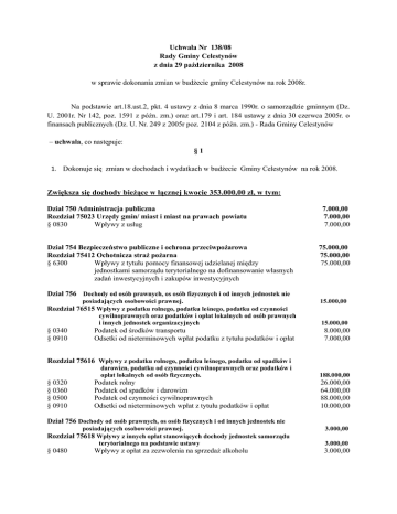 Uchwała Nr 138/08 Rady Gminy Celestynów z dnia 29 października 2008 w sprawie dokonania zmian w budŜecie gminy Celestynów na rok 2008r. Na podstawie art.18.ust.2, pkt. 4 ustawy z dnia 8 marca 1990r. o samorządzie gminnym (Dz. U. 2001r. Nr 142, poz. 1591 z późn. zm.) oraz art.179 i art. 184 ustawy z dnia 30 czerwca 2005r. o finansach publicznych (Dz. U. Nr. 249 z 2005r poz. 2104 z późn. zm.) - Rada Gminy Celestynów – uchwala, co następuje: §1 1. Dokonuje się zmian w dochodach i wydatkach w budŜecie Gminy Celestynów na rok 2008. Zwiększa się dochody bieŜące w łącznej kwocie 353.000,00 zł, w tym: Dział 750 Administracja publiczna Rozdział 75023 Urzędy gmin/ miast i miast na prawach powiatu § 0830 Wpływy z usług Dział 754 Bezpieczeństwo publiczne i ochrona przeciwpoŜarowa Rozdział 75412 Ochotnicza straŜ poŜarna § 6300 Wpływy z tytułu pomocy finansowej udzielanej między jednostkami samorządu terytorialnego na dofinansowanie własnych zadań inwestycyjnych i zakupów inwestycyjnych 7.000,00 7.000,00 7.000,00 75.000,00 75.000,00 75.000,00 Dział 756 Dochody od osób prawnych, os osób fizycznych i od innych jednostek nie posiadających osobowości prawnej. 15.000,00 Rozdział 76515 Wpływy z podatku rolnego, podatku leśnego, podatku od czynności § 0340 § 0910 cywilnoprawnych oraz podatków i opłat lokalnych od osób prawnych i innych jednostek organizacyjnych 15.000,00 Podatek od środków transportu Odsetki od nieterminowych wpłat podatku z tytułu podatków i opłat 8.000,00 7.000,00 Rozdział 75616 Wpływy z podatku rolnego, podatku leśnego, podatku od spadków i darowizn, podatku od czynności cywilnoprawnych oraz podatków i opłat lokalnych od osób fizycznych. § 0320 § 0360 § 0500 § 0910 Podatek rolny Podatek od spadków i darowizn Podatek od czynności cywilnoprawnych Odsetki od nieterminowych wpłat z tytułu podatków i opłat 188.000,00 26.000,00 64.000,00 88.000,00 10.000,00 Dział 756 Dochody od osób prawnych, os osób fizycznych i od innych jednostek nie posiadających osobowości prawnej. 3.000,00 Rozdział 75618 Wpływy z innych opłat stanowiących dochody jednostek samorządu terytorialnego na podstawie ustawy § 0480 Wpływy z opłat za zezwolenia na sprzedaŜ alkoholu 3.000,00 3.000,00 Dział 758 Rozliczenia róŜne Rozdział 75814 RóŜne rozliczenia finansowe § 0920 Pozostałe odsetki § 0970 Wpływy z róŜnych dochodów 65.000,00 65.000,00 20.000,00 45.000,00 Zwiększa się wydatki majątkowe w łącznej kwocie 160.000,00 zł, w tym: Dział 600 Transport i łączność Rozdział 60014 Drogi publiczne powiatowe § 6300 Dotacja celowa na pomoc finansową udzielana między jednostkami samorządu terytorialnego na dofinansowanie własnych zadań inwestycyjnych i zakupów inwestycyjnych 40.000,00 40.000,00 40.000,00 Dział 754 Bezpieczeństwo publiczne i ochrona przeciwpoŜarowa Rozdział 75412 Ochotnicza straŜ poŜarna § 6060 Wydatki na zakupy inwestycyjne jednostek budŜetowych 80.000,00 80.000,00 80.000,00 Dział 801 Oświata i wychowanie Rozdział 80801 Szkoły Podstawowe § 6050 Wydatki inwestycyjne jednostek budŜetowych 40.000,00 40.000,00 40.000,00 Zwiększa się wydatki bieŜące w kwocie 75.000,00 zł, w tym: Dział 600 Transport i łączność Rozdział 60016 Drogi publiczne gminne § 4210 Zakup materiałów i wyposaŜenia § 4300 Zakup usług pozostałych 25.000,00 25.000,00 15.000,00 10.000,00 Dział 750 Administracja publiczna Rozdział 75022 Rady gmin/ miast i miast na prawach powiatu § 3030 RóŜne wydatki na rzecz osób fizycznych § 4300 Zakup usług pozostałych 26.000,00 16.000,00 15.000,00 1.000,00 Rozdział 75023 Urzędy gmin/ miast i miast na prawach powiatu § 4300 Zakup usług pozostałych 10.000,00 10.000,00 Dział 754 Bezpieczeństwo publiczne i ochrona przeciwpoŜarowa Rozdział 75412 Ochotnicze straŜe poŜarne § 4300 Zakup u sług pozostałych 4.000,00 4.000,00 4.000,00 Dział 900 Gospodarka komunalna i ochrona środowiska Rozdział 90017 Zakłady gospodarki komunalnej § 2650 Dotacja przedmiotowa z budŜetu dla zakładu budŜetowego 20.000,00 20.000,00 20.000,00 §2 Dokonuje się zmian w uchwale budŜetowej w załączniku „Plan zadań inwestycyjnych i wydatków majątkowych realizowanych w 2008 roku przez Gminę Celestynów” - aktualny zał.1 stanowi integralną część do niniejszej uchwały . §3 Dokonuje się zmian w uchwale budŜetowej z załączniku „ Projekt plan przychodów i wydatków zakładu budŜetowego Gospodarki Komunalnej na 2008 rok”- aktualny zał. 2 stanowi integralną część do niniejszej uchwały. §4 1. Deficyt budŜetu Gminy stanowiący róŜnicę pomiędzy planem dochodów i wydatków wynosi 2.264.391,15 złotych, zostanie pokryty przychodami z: a) wolnych środków jako nadwyŜki środków pienięŜnych na rachunku bieŜącym budŜetu Gminy, wynikających z rozliczeń kredytów i poŜyczek z lat ubiegłych w kwocie 1 008 626,15 złotych, b) kredytów długoterminowych i poŜyczek w wysokości 1 255 765,00 złotych. 2. Przychody budŜetu w wysokości 4.094.914,15 złotych, rozchody w wysokości 1.830.523,00 złotych określa załącznik Nr 3 „ Plan przychody i rozchody budŜetu Gminy Celestynów w 2008 roku” stanowiący integralną część niniejszej uchwały. §5 Wykonanie uchwały powierza się Wójtowi Gminy Celestynów. §6 Uchwała wchodzi w Ŝycie z dniem podjęcia. Przewodniczący Rady Gminy /Bogdan Wójcik/ UZASADNIENIE Zwiększa się dochody w działach: - 750 rozdziale 75023 w § 0830 o kwotę 7.000,00 zł, - 756 rozdziale 75616 w § 0360 o kwotę 3.000,00 zł, - 756 rozdziale 75615 w § 0340 o kwotę 8.000,00 zł, - 756 rozdziale 75615 w § 0910 o kwotę 7.000,00 zł na poczet zwiększenia wydatków w dziale 600 rozdziale 60016 w § 4210 o kwotę 15.000,00 zł i w § 4300 o kwotę 10.000,00 zł z przeznaczeniem na bieŜące utrzymanie dróg w Pogorzeli. Zwiększa się dochody w dziale 754 rozdziale 75412 w § 6300 o kwotę 75.000,00 zł i 