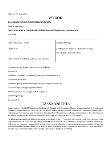Sygn. akt III AUa 58/15 WYROK W IMIENIU RZECZYPOSPOLITEJ POLSKIEJ Dnia 19 marca 2015 r. Sąd Apelacyjny w Lublinie III Wydział Pracy i Ubezpieczeń Społecznych w składzie: Przewodniczący - Sędzia SA Elżbieta Czaja Sędziowie: SA Małgorzata Rokicka – Radoniewicz (spr.) SO del. do SA Jacek Chaciński Protokolant: protokolant sądowy Joanna Malena po rozpoznaniu w dniu 19 marca 2015 r. w Lublinie sprawy L. I. przeciwko Zakładowi Ubezpieczeń Społecznych Oddziałowi w S. o wysokość emerytury na skutek apelacji Zakładu Ubezpieczeń Społecznych Oddziału w S. od wyroku Sądu Okręgowego w Siedlcach z dnia 12 grudnia 2014 r. sygn. akt IV U 450/14 oddala apelację. III AUa 58/15 UZASADNIENIE Organ rentowy - Zakład Ubezpieczeń Społecznych Oddział w S. decyzją z 28 lutego 2014 r. odmówił L. I. obliczenia emerytury na podstawie art. 26 w zw. z art. 55 ustawy o emeryturach i rentach z Funduszu Ubezpieczeń Społecznych, wskazując, że w związku z tym, że decyzją z dnia 29.08.2008 r. przyznano ubezpieczonemu prawo do emerytury nie spełnia on wymogów do obliczenia wysokości emerytury na podstawie art. 55 w/w ustawy. Od tej decyzji odwołanie do Sądu Okręgowego w Siedlcach złożył L. I. wnosząc o jej zmianę i obliczenie mu emerytury na podstawie art. 26 w zw. z art. 55 ustawy o emeryturach i rentach z FUS wskazując, że spełnia wszystkie warunki do obliczenia mu emerytury na podstawie art. 26 ustawy oraz że niniejsze prawo przysługuje mu niezależnie od tego czy wcześniej złożył wniosek o emeryturę w niższym wieku emerytalnym lub o emeryturę wcześniejszą i w tym względzie powołał się na orzeczenie Sądu Najwyższego z dnia 4 lipca 2013 r. II UZP 4/13. Sąd Okręgowy w Siedlcach wyrokiem z dnia 12 grudnia 2014 roku zmienił zaskarżoną decyzję w ten sposób, że ustalił L. I. prawo do obliczenia wysokości emerytury na podstawie art.26 w związku z art.55 ustawy z dnia 17 grudnia 1998 roku o emeryturach i rentach z Funduszu Ubezpieczeń Społecznych od dnia 1 stycznia 2014 roku. Sąd Okręgowy ustalił, że L. I. - urodzony (...), dnia10 kwietnia 2013 r. wystąpił o przyznanie mu prawa do emerytury. Decyzją z dnia 25.04.2013 r. organ rentowy przyznał ubezpieczonemu prawo do emerytury w powszechnym wieku emerytalnym od 24.04.2013 r. tj. od osiągnięcia wieku emerytalnego i wyliczył jej wysokość na podstawie art. 53 ustawy o emeryturach i rentach z FUS. Wcześniej na podstawie decyzji z dnia 29.08.2008 r. ubezpieczonemu organ rentowy przyznał prawo do emerytury wcześniejszej od dnia 1.08.2008 r. i wypłatę emerytury zawiesił z uwagi na kontunuowanie przez ubezpieczonego zatrudnienia w (...) Producent Sprężyn w S.. Stosunek pracy z (...) Producent Sprężyn w S. został rozwiązany między stronami z dniem 6 listopada 2008 r. Następnie L. I. od dnia 7 listopada 2008 r. został ponownie zatrudniony w (...) Producent Sprężyn w S.. Po uzyskaniu emerytury w powszechny wieku emerytalnym ubezpieczony w dalszym ciągu pozostaje w zatrudnieniu w wymienionym zakładzie pracy i składa co kwartał wnioski o doliczenie do stażu pracy kolejnych kwartałów zatrudnienia. Dnia 30 stycznia 2014 r. ubezpieczony złożył wniosek o przeliczenie emerytury według nowych zasad. Zaskarżoną decyzją organ rentowy odmówił mu prawa do ustalenia wysokości emerytury na podstawie art. 55 ustawy o emeryturach i rentach z FUS. Ubezpieczony ukończył 65 lat i 1 miesiąc w dniu 24 kwietnia 2013 r. i według stanu na datę wydania zaskarżonej decyzji udowodnił 46 lat, 4 miesiące i 15 dni okresów składkowych i nieskładkowych i w dalszym ciągu pozostaje w zatrudnieniu w (...) Producent Sprężyn w S.. Sąd Okręgowy orzekł, że zgodnie z art.55 ustawy z 17 grudnia 1998r. o emeryturach i rentach z Funduszu Ubezpieczeń Społecznych (j.t. Dz.U. z 2013 r. poz.1440 ze zm.) ubezpieczonemu spełniającemu warunki do uzyskania emerytury na podstawie art. 27, który kontynuował ubezpieczenia emerytalne i rentowe po osiągnięciu przewidzianego w tym przepisie wieku emerytalnego i wystąpił z wnioskiem o przyznanie emerytury po dniu 31 grudnia 2008r., może być obliczona emerytura na podstawie art.26, jeżeli jest wyższa od obliczonej zgodnie z art.53. Powołany w przytoczonym uregulowaniu przepis art.27 ustawy stanowi, że ubezpieczonym urodzonym przed dniem 1 stycznia 1949r. (tak jak ubezpieczony) przysługuje emerytura jeżeli osiągnęli określony w tym przepisie wiek emerytalny – w przypadku ubezpieczonego wiek 65 lat i 1 miesiąc (ust.3 pkt 2 przepisu) i mają okres składkowy i nieskładkowy wynoszący w przypadku mężczyzny co najmniej 25 lat. Ubezpieczony osiągnął wskazany wiek emerytalny w dniu 24 kwietnia 2013 r., posiada on ponad 25 letni okres składkowy i nieskładkowy, bowiem na datę wydania zaskarżonej decyzji ubezpieczony udowodnił 46 lat, 4 miesiące i 15 dni okresów składkowych i nieskładkowych. Tym samym uzasadnione jest stwierdzenie, że spełnia on warunki do uzyskania emerytury na podstawie art. 27 ustawy o emeryturach i rentach z Funduszu Ubezpieczeń Społecznych. Zgodnie z przepisem art.55 ustawy dalszym warunkiem do nabycia prawa do obliczenia emerytury na podstawie art.26 ustawy jest, aby osoba spełniająca warunki do emerytury na podstawie art.27, po osiągnięciu wskazanego wieku emerytalnego kontynuowała ubezpieczenia emerytalne i rentowe i z wnioskiem o przyznanie emerytury (obliczonej na podstawie art.26) wystąpiła po dniu 31 sierpnia 2008 r. Analiza poczynionych w sprawie ustaleń wskazuje, że ubezpieczony spełnia te warunki. Po osiągnięciu wieku emerytalnego 65 lat i 1 miesiąca ubezpieczony kontynuował ubezpieczenia emerytalne i rentowe, gdyż był zatrudniony od dnia 7 listopada 2008 r. do nadal w (...) Producent Sprężyn w S. i z tego tytułu podlegał obowiązkowo ubezpieczeniu emerytalnemu i rentowemu. Niesporne jest również, że z wnioskiem o przyznanie prawa do emerytury ubezpieczony wystąpi