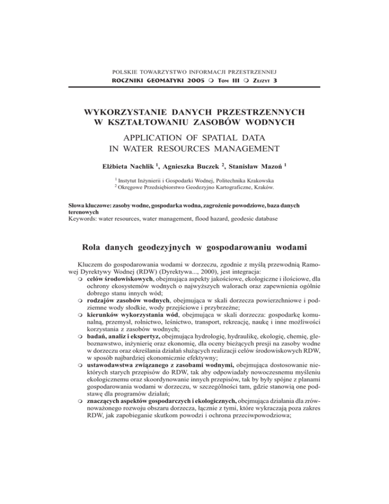 POLSKIE TOWARZYSTWO Wykorzystanie danych przestrzennych INFORMACJI w kszta³towaniuPRZESTRZENNEJ zasobów wodnych ROCZNIKI GEOMATYKI 2005 m TOM III m Z ESZYT 3 95 WYKORZYSTANIE DANYCH PRZESTRZENNYCH W KSZTA£TOWANIU ZASOBÓW WODNYCH APPLICATION OF SPATIAL DATA IN WATER RESOURCES MANAGEMENT El¿bieta Nachlik 1, Agnieszka Buczek 2, Stanis³aw Mazoñ 1 1 Instytut In¿ynierii i Gospodarki Wodnej, Politechnika Krakowska Przedsiêbiorstwo Geodezyjno Kartograficzne, Kraków. 2 Okrêgowe S³owa kluczowe: zasoby wodne, gospodarka wodna, zagro¿enie powodziowe, baza danych terenowych Keywords: water resources, water management, flood hazard, geodesic database Rola danych geodezyjnych w gospodarowaniu wodami Kluczem do gospodarowania wodami w dorzeczu, zgodnie z myl¹ przewodni¹ Ramowej Dyrektywy Wodnej (RDW) (Dyrektywa..., 2000), jest integracja: m celów rodowiskowych, obejmuj¹ca aspekty jakociowe, ekologiczne i ilociowe, dla ochrony ekosystemów wodnych o najwy¿szych walorach oraz zapewnienia ogólnie dobrego stanu innych wód; m rodzajów zasobów wodnych, obejmuj¹ca w skali dorzecza powierzchniowe i podziemne wody s³odkie, wody przejciowe i przybrze¿ne; m kierunków wykorzystania wód, obejmuj¹ca w skali dorzecza: gospodarkê komunaln¹, przemys³, rolnictwo, lenictwo, transport, rekreacjê, naukê i inne mo¿liwoci korzystania z zasobów wodnych; m badañ, analiz i ekspertyz, obejmuj¹ca hydrologiê, hydraulikê, ekologiê, chemiê, gleboznawstwo, in¿ynieriê oraz ekonomiê, dla oceny bie¿¹cych presji na zasoby wodne w dorzeczu oraz okrelania dzia³añ s³u¿¹cych realizacji celów rodowiskowych RDW, w sposób najbardziej ekonomicznie efektywny; m ustawodawstwa zwi¹zanego z zasobami wodnymi, obejmuj¹ca dostosowanie niektórych starych przepisów do RDW, tak aby odpowiada³y nowoczesnemu myleniu ekologicznemu oraz skoordynowanie innych przepisów, tak by by³y spójne z planami gospodarowania wodami w dorzeczu, w szczególnoci tam, gdzie stanowi¹ one podstawê dla programów dzia³añ; m znacz¹cych aspektów gospodarczych i ekologicznych, obejmuj¹ca dzia³ania dla zrównowa¿onego rozwoju obszaru dorzecza, ³¹cznie z tymi, które wykraczaj¹ poza zakres RDW, jak zapobieganie skutkom powodzi i ochrona przeciwpowodziowa; El¿bieta Nachlik, Agnieszka Buczek, Stanis³aw Mazoñ 96 mechanizmów, dzia³añ i instrumentów ekonomicznych i finansowych, obejmuj¹ca wspólne podejcie dotycz¹ce gospodarowania wodami zmierzaj¹ce do osi¹gniêcia celów rodowiskowych RDW, w tym m.in. ustalanie op³at za u¿ytkowanie wód; m spo³eczeñstwa oraz grup interesu ró¿nych rodzajów i poziomów zarz¹dzania, obejmuj¹ca dzia³ania zmierzaj¹ce do tworzenia warunków dla uspo³ecznienia procesu podejmowania decyzji, poprzez wdro¿enie przejrzystoci procedur postêpowania i szerokiego informowania opinii publicznej, przy opracowywaniu planów gospodarowania wodami w dorzeczu; m gospodarowania wodami w dorzeczach miêdzynarodowych, obejmuj¹ca dzia³ania koordynacyjne pomiêdzy aktualnymi i/lub przysz³ymi pañstwami cz³onkowskimi Unii Europejskiej. Spe³nienie powy¿szych za³o¿eñ wymaga integracji charakterystycznych dla zagadnieñ wodnych danych terenowych o ekosystemach wodnych w uk³adzie zlewniowym z danymi geodezyjnymi reprezentowanymi przez dane opisuj¹ce w uk³adzie administracyjnym u¿ytkowanie ziemi. Symbolicznie ilustruje to rysunek 1, gdzie na przyk³adzie zlewni Raby, pokam Rys. 1. Powi¹zanie uk³adu rzecznego i granic zlewni z podzia³em administracyjnym na przyk³adzie zlewni Raby Wykorzystanie danych przestrzennych w kszta³towaniu zasobów wodnych 97 zano powi¹zanie granic zlewni z podzia³em administracyjnym w uk³adzie powiatowym. Jest spraw¹ oczywist¹, ¿e dla wielu zagadnieñ z obszaru gospodarki wodnej, zakres tych powi¹zañ jest znacznie szerszy. Na przyk³ad, przedstawiony na tym rysunku uk³ad sieci rzecznej w rzeczywistoci jest znacznie bardziej rozbudowany, a tym samym charakter powi¹zañ z uk³adem administracyjnym jest determinowany rodzajem i skal¹ potrzeb. Na tym podstawowym za³o¿eniu rozwijana jest baza danych o terenie, stosownie do rodzaju szczegó³owego zadania gospodarki wodnej oraz do etapu w procesie jego realizacji. Zadania gospodarki wodnej ujête s¹ w grupy, ukierunkowane na osi¹gniêcie nastêpuj¹cych celów: m ochrony ekosystemów wodnych i ekosystemów l¹dowych z nimi zwi¹zanych, zgodnie z obowi¹zuj¹cym prawem oraz ze szczegó³owymi za³o¿eniami strategicznymi rozwoju regionalnego i lokalnego; m wykorzystania zasobów wodnych dla zabezpieczenia potrzeb w zakresie wody pitnej, przemys³owej i rolniczej oraz dla energetycznego, ¿eglugowego i rekreacyjnego wykorzystania wód; m przeciwdzia³ania naturalnym zagro¿eniom, czyli ograniczenie ryzyka powodziowego oraz skutków suszy. Realizacja powy¿szych grup zadañ wymaga zastosowania odpowiednich rodkóww i obejmuje nastêpuj¹ce etapy: planowanie; prace studialne obejmuj¹ce odpowiedni obszar problemowy i przestrzenny zlewni; projektowanie techniczne; przygotowanie inwestycji; realizacja przedsiêwziêcia (w tym inwestycji) oraz eksploatacja w okresie objêtym dzia³aniem. Realizacja tych etapów jest skoordynowana analiz¹ DPSIR (Driver Pressure State Impact Response), któr¹ Unia Europejska przyjê³a jako podstawê realizacji przedsiêwziêæ w dzia³aniach zintegrowanych wielodyscyplinarnie, prawnie i instytucjonalnie. Dla przyk³adu, w dziedzinie ochrony wód w polskiej nomenklaturze analiza ta obejmuje: czynnik sprawczy (rodzaj dzia³alnoci cz³owieka wywo³uj¹cej negatywny efekt rodowiskowy); presjê (oddzia³ywanie bezporedni skutek czynnika sprawczego); stan (ilociowy i jakociowy stan wód/warunki panuj¹ce w systemie wodnym); skutek (rodowiskowy efekt oddzia³ywania); rodki dzia³ania (rodki zaradcze podjête dla poprawy stanu, a obejmuj¹ce zmiany w dzia³alnoci cz³owieka). Ten typ analizy zosta³ dostosowany do wszystkich wymienionych wy¿ej celów gospodarki wodnej.