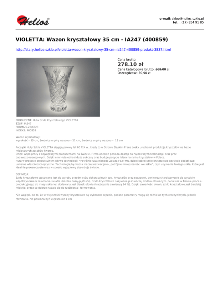 e-mail: [email protected] tel. : (17) 854 91 85 VIOLETTA: Wazon kryształowy 35 cm - IA247 (400859) http://stary.helios-szklo.pl/violetta-wazon-krysztalowy-35-cm--ia247-400859-produkt-3837.html Cena brutto: 278.10 zł Cena katalogowa brutto: 309.00 zł Oszczędzasz: 30,90 zł PRODUCENT: Huta Szkła Kryształowego VIOLETTA SZLIF: IA247 FORMA:S-23/K323 INDEKS: 400859 Wazon kryształowy: wysokość – 35 cm, średnica u góry wazonu – 21 cm, średnica u góry wazonu – 13 cm Początki Huty Szkła VIOLETTA sięgają połowy lat 60 XIX w., kiedy to w Stroniu Śląskim Franz Losky uruchomił produkcję kryształów na bazie miejscowych zasobów kwarcu. Dzięki współpracy z największymi producentami na świecie, Firma obecnie posiada dostęp do najnowszych technologii oraz prac badawczo-rozwojowych. Dzięki nim Huta odnosi duże sukcesy oraz buduje pozycje lidera na rynku kryształów w Polsce. Huta w procesie produkcyjnym używa technologii *Potrójnie Uwalnianego Żelaza Fe3+MR, dzięki której szkło kryształowe uzyskuje dodatkowe unikalne właściwości optyczne. Technologię tą można inaczej nazwać jako „potrójnie mniej szarości we szkle”, czyli uzyskanie takiego szkła, które jest idealnie przezroczyste oraz w sposób wyjątkowy absorbuje światło. DEFINICJA: Szkło kryształowe stosowane jest do wyrobu przedmiotów dekoracyjnych tzw. kryształów oraz soczewek, ponieważ charakteryzuje się wysokim współczynnikiem załamania światła i bardzo dużą gęstością. Szkło kryształowe nazywane jest inaczej szkłem ołowianym, ponieważ w trakcie procesu produkcyjnego do masy szklanej dodawany jest tlenek ołowiu (tradycyjnie zawierają 24 %). Dzięki zawartości ołowiu szkło kryształowe jest bardziej miękkie, przez co dobrze nadaje się do rzeźbienia i formowania. *Ze względu na to, że w większości wyroby kryształowe są wykonane ręcznie, podane parametry mogą się różnić od tych rzeczywistych. Jednak różnica ta, nie powinna być większa niż 1 cm