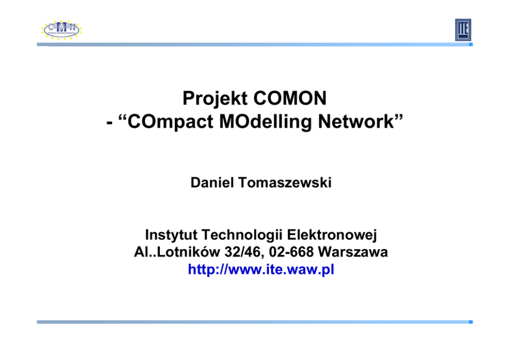 Projekt COMON - “COmpact MOdelling Network” Daniel Tomaszewski Instytut Technologii Elektronowej Al..Lotników 32/46, 02-668 Warszawa http://www.ite.waw.pl Opracowanie projektu Akcja: Marie Curie Industry-Academia Partnerships and Pathways (IAPP) - Projekty Marie Curie na współpracę przemysł-nauka Konkurs: PEOPLE-2007-3-1-IAPP Data ogł. konkursu: 28 lutego 2007 Data zamkn. konkursu: 31 maja 2007 Typ projektu: projekt instytucjonalny Identyfikator projektu: 218255 Zadania projektu Uzupełnienie brakujących ogniw w modelach typu „compact” Implementacja modeli w narzędziach do projektowania Ewaluacja modeli (testowanie, optymalizacja, porównywanie-„benchmarking”) Standaryzacja kodowania/implementacji poprzez wykorzystanie języków wyższego poziomu (Verilog-A) Opracowanie, standaryzacja i implementacja metod ekstracji parametrów modeli w narzędziach EDA (Electronic design automation) z uwzględnieniem statystycznych rozrzutów charakterystyk Udostępnienie kompletnych modeli dla projektowania w przemyśle (biblioteki) Zaprojektowanie testowych bloków/układów (wielobramkowe MOS, HV MOS, HEMT) Wytworzenie zaprojektowanych bloków/układów Weryfikacja modeli poprzez porównanie charakterystyk projektów i wytworzonych bloków/układów. Konsorcjum – skład 1. URV - Universitat Rovira i Virgili (Hiszpania) - koordynator 8. ITE - Instytut Technologii Elektronowej (Polska) 2. TUC - Telecommunications Systems Institute (Grecja) 9. Dolphin - Dolphin Integration SA (Francja) 3. UniK - Universitetsstudiene på Kjeller (Norwegia) 10. AdMOS - AdMOS GmbH Advanced Modeling Solutions (Niemcy) 4. EPFL - Ecole Polytechnique Fédérale de Lausanne (Szwajcaria) 11. Melexis – Melexis Ukraine (Ukraina) 5. ULP - Université de Strasbourg (Francja) 6. UCL - Université catholique de Louvain (Belgia) 7. TU Ilmenau - Technische Universität Ilmenau (Niemcy) 12. AIM-Software (Norwegia) 13. AMS – Austriamicrosystems AG (Austria) 14. Infineon - Infineon Technologies AG (Niemcy) 15. RFMD – RFMD Ltd. (W.Brytania) Podsumowanie Nasze zadania Udział w opracowaniu metod charakteryzacji (DC, AC) nowoczesnych wielobramkowych tranzystorów MOS z uwzględnieniem rozrzutów charakterystyk elektrycznych wynikających z losowych zmian w procesach technologicznych Udział w opracowaniu i implementacji zautomatyzowanych procedur ekstrakcji parametrów przyrządów półprzewodnikowych MOS COMON http://iccdcs.uib.es/comon/ ITE http://www.ite.waw.pl D.Tomaszewski [email protected]