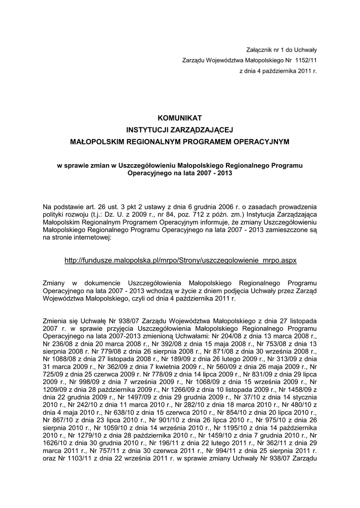 Załącznik nr 1 do Uchwały Zarządu Województwa Małopolskiego Nr 1152/11 z dnia 4 października 2011 r. KOMUNIKAT INSTYTUCJI ZARZĄDZAJĄCEJ MAŁOPOLSKIM REGIONALNYM PROGRAMEM OPERACYJNYM w sprawie zmian w Uszczegółowieniu Małopolskiego Regionalnego Programu Operacyjnego na lata 2007 - 2013 Na podstawie art. 26 ust. 3 pkt 2 ustawy z dnia 6 grudnia 2006 r. o zasadach prowadzenia polityki rozwoju (t.j.: Dz. U. z 2009 r., nr 84, poz. 712 z późn. zm.) Instytucja Zarządzająca Małopolskim Regionalnym Programem Operacyjnym informuje, że zmiany Uszczegółowieniu Małopolskiego Regionalnego Programu Operacyjnego na lata 2007 - 2013 zamieszczone są na stronie internetowej: http://fundusze.malopolska.pl/mrpo/Strony/uszczegolowienie_mrpo.aspx Zmiany w dokumencie Uszczegółowienia Małopolskiego Regionalnego Programu Operacyjnego na lata 2007 - 2013 wchodzą w życie z dniem podjęcia Uchwały przez Zarząd Województwa Małopolskiego, czyli od dnia 4 października 2011 r. Zmienia się Uchwałę Nr 938/07 Zarządu Województwa Małopolskiego z dnia 27 listopada 2007 r. w sprawie przyjęcia Uszczegółowienia Małopolskiego Regionalnego Programu Operacyjnego na lata 2007-2013 zmienioną Uchwałami: Nr 204/08 z dnia 13 marca 2008 r., Nr 236/08 z dnia 20 marca 2008 r., Nr 392/08 z dnia 15 maja 2008 r., Nr 753/08 z dnia 13 sierpnia 2008 r. Nr 779/08 z dnia 26 sierpnia 2008 r., Nr 871/08 z dnia 30 września 2008 r., Nr 1088/08 z dnia 27 listopada 2008 r., Nr 189/09 z dnia 26 lutego 2009 r., Nr 313/09 z dnia 31 marca 2009 r., Nr 362/09 z dnia 7 kwietnia 2009 r., Nr 560/09 z dnia 26 maja 2009 r., Nr 725/09 z dnia 25 czerwca 2009 r. Nr 778/09 z dnia 14 lipca 2009 r., Nr 831/09 z dnia 29 lipca 2009 r., Nr 998/09 z dnia 7 września 2009 r., Nr 1068/09 z dnia 15 września 2009 r., Nr 1209/09 z dnia 28 października 2009 r., Nr 1266/09 z dnia 10 listopada 2009 r., Nr 1458/09 z dnia 22 grudnia 2009 r., Nr 1497/09 z dnia 29 grudnia 2009 r., Nr 37/10 z dnia 14 stycznia 2010 r., Nr 242/10 z dnia 11 marca 2010 r., Nr 282/10 z dnia 18 marca 2010 r., Nr 480/10 z dnia 4 maja 2010 r., Nr 638/10 z dnia 15 czerwca 2010 r., Nr 854/10 z dnia 20 lipca 2010 r., Nr 867/10 z dnia 23 lipca 2010 r., Nr 901/10 z dnia 26 lipca 2010 r., Nr 975/10 z dnia 26 sierpnia 2010 r., Nr 1059/10 z dnia 14 września 2010 r., Nr 1195/10 z dnia 14 października 2010 r., Nr 1279/10 z dnia 28 października 2010 r., Nr 1459/10 z dnia 7 grudnia 2010 r., Nr 1626/10 z dnia 30 grudnia 2010 r., Nr 196/11 z dnia 22 lutego 2011 r., Nr 362/11 z dnia 29 marca 2011 r., Nr 757/11 z dnia 30 czerwca 2011 r., Nr 994/11 z dnia 25 sierpnia 2011 r. oraz Nr 1103/11 z dnia 22 września 2011 r. w sprawie zmiany Uchwały Nr 938/07 Zarządu Województwa Małopolskiego z dnia 27 listopada 2007 roku w sprawie przyjęcia Uszczegółowienia Małopolskiego Regionalnego Programu Operacyjnego na lata 2007 2013, w ten sposób, że w Załączniku ww. Uchwały dla fragmentu dotyczącego: 1. w ramach osi 2 MRPO, nastąpiła realokacja środków w pomiędzy Schematem 2.2 A oraz Schematem 2.1 A (średnie) do Schematu 2.1 A (małe), w konsekwencji które całkowita alokacja dla małych przedsiębiorstw w ramach tego schematu wynosi 74 512 916 EUR, 2. w ramach osi 7 MRPO, z Działania 7.4 na rzecz Działania 7.2 przeniesiono kwotę w wysokości 3 389 720 EUR, otrzymując tym samym kwoty ostateczne na Działaniu 7.2 w wysokości 33 165 682 EUR (w tym 30 683 468 EUR na konkurs) oraz Działaniu 7.4 – 18 713 283 EUR; 3. w Załączniku 5. Lista kluczowych projektów w ramach Programu Operacyjnego: usunięto projekt indywidualny pod nazwą Budowa wielofunkcyjnej hali widowiskowo sportowej wraz z infrastrukturą towarzyszącą, zwiększono alokację na projekt Centrum Urazowe Medycyny Ratunkowej i Katastrof w Szpitalu Uniwersyteckim w Krakowie - Etap I do kwoty 15 030 737 EUR, dotychczasowy projekt rezerwowy w ramach Działania 5.2 pod nazwą Modernizacja obiektu Pałac „Pod Krzysztofory”- głównej siedziby Muzeum Historycznego Miasta Krakowa, został przesunięty na listę projektów podstawowych, zaś na jego realizację przeznaczono kwotę 4 000 000 EUR, co po przeliczeniu wg stosowanego dla projektów indywidualnych kursu stanowi kwotę 16 586 000 PLN, zmniejszono wysokości dofinansowania dla projektu Zbiornik Joniny na potoku Wolninka w gminie Ryglice planowanego do realizacji w ramach Działania 7.4 o kwotę 3 388 481 EUR, co spowodowało obniżenie przyznanego dofinansowania do kwoty 2 028 706 EUR.