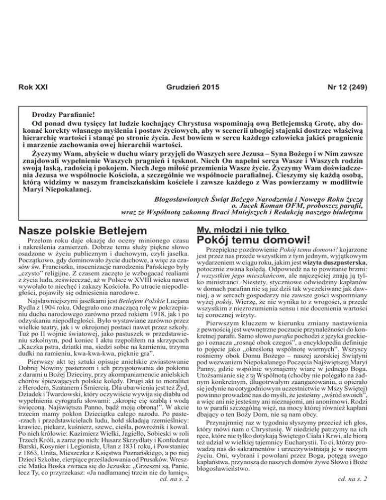 Nasza Wspólnota, Nr 12 (249), grudzień 2015 Rok XXI 1 Grudzień 2015 Nr 12 (249) Drodzy Parafianie! Od ponad dwu tysięcy lat ludzie kochający Chrystusa wspominają ową Betlejemską Grotę, aby dokonać korekty własnego myślenia i postaw życiowych, aby w scenerii ubogiej stajenki dostrzec właściwą hierarchię wartości i stanąć po stronie życia. Jest bowiem w sercu każdego człowieka jakieś pragnienie i marzenie zachowania owej hierarchii wartości. Życzymy Wam, abyście w duchu wiary przyjęli do Waszych serc Jezusa – Syna Bożego i w Nim zawsze znajdowali wypełnienie Waszych pragnień i tęsknot. Niech On napełni serca Wasze i Waszych rodzin swoją łaską, radością i pokojem. Niech Jego miłość przemienia Wasze życie. Życzymy Wam doświadczenia Jezusa we wspólnocie Kościoła, a szczególnie we wspólnocie parafialnej. Cieszymy się każdą osobą, którą widzimy w naszym franciszkańskim kościele i zawsze każdego z Was powierzamy w modlitwie Maryi Niepokalanej. Błogosławionych Świąt Bożego Narodzenia i Nowego Roku życzą o. Jacek Koman OFM, proboszcz parafii, wraz ze Wspólnotą zakonną Braci Mniejszych i Redakcją naszego biuletynu Nasze polskie Betlejem Przełom roku daje okazję do oceny minionego czasu i nakreślenia zamierzeń. Dobrze temu służy piękne słowo osadzone w życiu publicznym i duchowym, czyli jasełka. Początkowo, gdy dominowało życie duchowe, a więc za czasów św. Franciszka, inscenizacje narodzenia Pańskiego były „czysto” religijne. Z czasem zaczęto je wzbogacać realiami z życia ludu, zeświecczać, aż w Polsce w XVIII wieku nawet wywołało to niechęć i zakazy Kościoła. Po utracie niepodległości, pojawiły się odniesienia narodowe. Najsławniejszymi jasełkami jest Betlejem Polskie Lucjana Rydla z 1904 roku. Odegrało ono znaczącą rolę w pokrzepianiu ducha narodowego zarówno przed rokiem 1918, jak i po odzyskaniu niepodległości. Było wystawiane zarówno przez wielkie teatry, jak i w okrojonej postaci nawet przez szkoły. Tuż po II wojnie światowej, jako pastuszek w przedstawieniu szkolnym, pod koniec I aktu rzępoliłem na skrzypcach „Kaczka pstra, dziatki ma, siedzi sobie na kamieniu, trzyma dudki na ramieniu, kwa-kwa-kwa, pięknie gra”. Pierwszy akt tej sztuki opisuje anielskie zwiastowanie Dobrej Nowiny pasterzom i ich przygotowania do pokłonu z darami u Bożej Dzieciny, przy akompaniamencie anielskich chórów śpiewających polskie kolędy. Drugi akt to moralitet z Herodem, Szatanem i Śmiercią. Dla ubarwienia jest też Żyd, Dziadek i Twardowski, który oczywiście wywija się diabłu od wypełnienia cyrografu słowami: „skropię cię szablą i wodą święconą. Najświętsza Panno, bądź moją obroną!”. W akcie trzecim mamy pokłon Dzieciątku całego narodu. Po paste-rzach i przedstawicielach ludu, hołd składają rzemieślnicy: krawiec, piekarz, kuśnierz, szewc, cieśla, powroźnik i kowal. Po nich królowie: Kazimierz Wielki, Jagiełło, Sobieski w roli Trzech Króli, a zaraz po nich: Husarz Skrzydlaty i Konfederat Barski, Kosynier i Legionista, Ułan z 1831 roku, i Powstaniec z 1863, Unita, Mieszczka z Księstwa Poznańskiego, a po niej Dzieci Szkolne, cierpiące prześladowania od Prusaków. Wreszcie Matka Boska zwraca się do Jezuska: „Grzeszni są, Panie, lecz Ty, co przyrzekasz: «Ja nadłamanej trzcin nie do łamię». cd. na s. 2 My, młodzi i nie tylko Pokój temu domowi! Przepiękne pozdrowienie Pokój temu domowi! kojarzone jest przez nas przede wszystkim z tym jednym, wyjątkowym wydarzeniem w ciągu roku, jakim jest wizyta duszpasterska, potocznie zwana kolędą. Odpowiedź na to powitanie brzmi: I wszystkim jego mieszkańcom, ale najczęściej znają ją tylko ministranci. Niestety, styczniowe odwiedziny kapłanów w domach parafian nie są już dziś tak wyczekiwane jak dawniej, a w sercach gospodarzy nie zawsze gości wspomniany wyżej pokój. Wierzę, że nie wynika to z wrogości, a przede wszystkim z niezrozumienia sensu i nie docenienia wartości tej corocznej wizyty. Pierwszym kluczem w kierunku zmiany nastawienia z pewnością jest wewnętrzne poczucie przynależności do konkretnej parafii. Samo słowo parafia pochodzi z języka greckiego i oznacza „rosnąć obok czegoś”, a encyklopedia definiuje to pojęcie jako „określoną wspólnotę wiernych”. Wszyscy rośniemy obok Domu Bożego – naszej azorskiej Świątyni pod wezwaniem Niepokalanego Poczęcia Najświętszej Maryi Panny, gdzie wspólnie wyznajemy wiarę w jednego Boga. Utożsamianie się z tą Wspólnotą (choćby nie polegało na żadnym konkretnym, długotrwałym zaangażowaniu, a opierało się jedynie na cotygodniowym uczestnictwie w Mszy Świętej) powinno prowadzić nas do myśli, że jesteśmy „wśród swoich”, a więc ani nie jesteśmy ani nieznajomi, ani anonimowi. Rodzi to w parafii szczególną więź, na mocy której również kapłani dbający o ten Boży Dom, nie są nam obcy. Przynajmniej raz w tygodniu słyszymy przecież ich głos, który mówi nam o Chrystusie. W niedzielę patrzymy na ich ręce, które nie tylko dotykają Świętego Ciała i Krwi, ale biorą też udział w wielkiej tajemnicy Eucharystii. To ci, którzy prowadzą nas do sakramentów i urzeczywistniają je w naszym życiu. Oni, wybrani i powołani przez Boga, potęgą swego kapłaństwa, przynoszą do naszych domów żywe Słowo i Boże błogosławieństwo. cd. na s. 2 Nasza Wspólnota, Nr 12 (249), grudzień 2015 2 Informacje duszpasterskie 1.01 - Pierwszy piątek 2016 roku. Uroczystość Świętej Bożej Rodzicielki. Msze św. jak w każdą niedzielę, o godz. 19. nabożeństwo do Najświętszego Serca Pana Jezusa. 2.01. – Sobota: o godz. 18:30 Msza św. w intencji Róż Żywego Różańca i zmiana tajemnic różańcowych. W tym dniu rozpoczynamy Wizytę Duszpasterską Rodzin naszej parafii od ul. Radzikowskiego. 6.01. – Środa: Uroczystość Objawienia Pańskiego (Trzech Króli). Msz