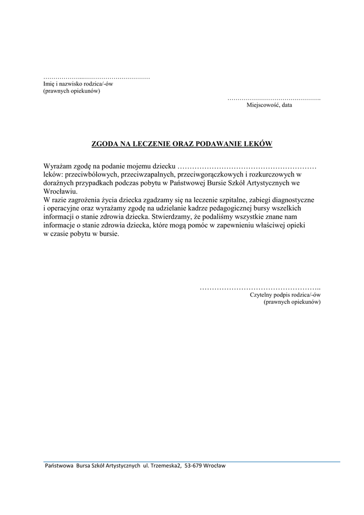 ………………..…………………………… Imi i nazwisko rodzica/-ów (prawnych opiekunów) ………………………………………. Miejscowo , data ZGODA NA LECZENIE ORAZ PODAWANIE LEKÓW Wyra am zgod na podanie mojemu dziecku ………………………………………………… leków: przeciwbólowych, przeciwzapalnych, przeciwgor czkowych i rozkurczowych w dora nych przypadkach podczas pobytu w Pa stwowej Bursie Szkół Artystycznych we Wrocławiu. W razie zagro enia ycia dziecka zgadzamy si na leczenie szpitalne, zabiegi diagnostyczne i operacyjne oraz wyra amy zgod na udzielanie kadrze pedagogicznej bursy wszelkich informacji o stanie zdrowia dziecka. Stwierdzamy, e podali my wszystkie znane nam informacje o stanie zdrowia dziecka, które mog pomóc w zapewnieniu wła ciwej opieki w czasie pobytu w bursie. ………………………………………….. Czytelny podpis rodzica/-ów (prawnych opiekunów) 2 5 " $ / 8* 9:&;<= 7