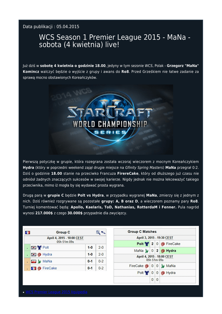 Data publikacji : 05.04.2015 WCS Season 1 Premier League 2015 - MaNa sobota (4 kwietnia) live! Już dziś w sobotę 4 kwietnia o godzinie 18.00, jedyny w tym sezonie WCS, Polak - Grzegorz "MaNa" Komincz walczyć będzie o wyjście z grupy i awans do Ro8. Przed Grześkiem nie łatwe zadanie za sprawą mocno obstawionych Koreańczyków. Pierwszą potyczkę w grupie, która rozegrana została wczoraj wieczorem z mocnym Koreańczykiem Hydra (który w poprzedni weekend zajął drugie miejsce na Gfinity Spring Masters) MaNa przegrał 0:2. Dziś o godzinie 18.00 stanie na przeciwko Francuza FirereCake, który od dłuższego już czasu nie odniósł żadnych znaczących sukcesów w swojej karierze. Nigdy jednak nie można lekceważyć takiego przeciwnika, mimo iż mogła by się wydawać prosta wygrana. Drugą parą w grupie C będzie Polt vs Hydra, w przypadku wygranej MaNa, zmierzy się z jednym z nich. Dziś również rozgrywane są pozostałe grupy: A, B oraz D, a wieczorem poznamy pary Ro8. Turniej komentować będą: Apollo, Kaelaris, ToD, Nathanias, RotterdaM i Fenner. Pula nagród wynosi 217.000$ z czego 30.000$ przypadnie dla zwycięzcy. ● WCS Premier League 2015 liquipedia ● Stream ESL ● Stream polski ● Vody ● Strona ESL AKTUALIZACJA Niestety po dość zbliżonych grach z FireCake, ostatecznie MaNa przegrał 1:2 i został wyeliminowany z turnieju. Mimo wszystko i tak należą się gratulacje dla Grześka, który jako jedyny z Polaków zakwalikifował się i zaszedł tak daleko w WCS. Rozpoczyna się ostatni dzień rozgrywek, który zakończy się wielkim finałem przewidzianym na godzinę 20.40. W turnieju pozostało już tylko 8 graczy w tym 3 Korańczyków - Hydra, Polt i ForGG. Pary finałowe wyglądają następująco: Autor: Fanek Liczba wyświetleń strony: 1202 Data publikacji : 05.04.2015 Data modyfikacji : 05.04.2015 Tagi: eSport, mana, WCS Komentarz (0) Brak komentarzy dodaj komentarz dodaj komentarz Pozostałe nowości DreamHack Open: Valencia 2016 - Nerchio w półfinale - live! DreamHack Valencia to jedno z największych e-sportowych wydarzeń w Europie - dlatego nie mogło zabraknąć na nim StarCrafta II! W czasie rozgrywek 96 graczy będzie konkurować o 50 000 USD oraz 5 000 punktów WCS.Data publikacji: 16.07.20161 Aktualizacja 3.4 – Duże zmiany w rankingu StarCrafta II Na oficjalnym blogu Blizzarda pojawił się nowy wpis dotyczący tym razem zmian w rankingach: Ranking StarCrafta II jest areną dla niezwykle zaciętej rywalizacji. Do walki rusza wielu uczestników, ale tylko nieliczni awansują do ścisłej czołówki.Data publikacji: 03.07.20160 Rozpoczęcie trzeciego sezonu rankingowego 2016 Trzeci sezon tegorocznych rozgrywek ligowych w StarCrafta II uważamy za otwarty! Zresetowano pulę punktów premiowych oraz rankingi i przyznano nagrody za sezon drugi roku 2016.Data publikacji: 26.06.20160 Filmowy „Warcraft” już wkrótce w księgarniach! Powieść „Warcraft”, której wydanie zbiega się z polską premierą filmu „Warcraft. Początek” w reżyserii Duncana Jonesa, do księgarń trafi już 15 czerwca. Na kartach książki czytelnicy wkroczą w nowy wymiar emocji towarzyszących bohaterom fikcyjnych światów Azeroth i Draenor. Za sprawą Christie Golden, pisarki od lat cenionej przez fanów świata Warcraft, konflikt ludzi i orków nabierze jeszcze większej intensywności.Data publikacji: 13.06.20160 Blokada obecnego sezonu i darmowa zmiana nazwy postaci Jak czytamy na oficjalnym blogu Blizzarda: Obecny sezon rankingowy zbliża się ku końcowi i wkrótce zamknięte zostaną wszystkie ligi i dywizje. Kilka dni przed rozpoczęciem nowego sezonu, darmowa zmiana nazwy postaci w StarCraft II zostanie ponownie dodana do wszystkich kont, dla których funkcja ta nie jest obecnie dostępna.Data publikacji: 12.06.20160 Wszystkie nowości