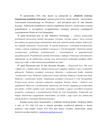 W październiku 2016 roku ukazał się podręcznik pt. „Hodowla zwierząt. Organizacja produkcji zwierzęcej” napisany przez liczny zespół autorski – pracowników Uniwersytetu Przyrodniczego we Wrocławiu – pod kierunkiem prof. dr. hab. Mariana Kuczaja”. Podręcznik kompleksowo omawia zagadnienia hodowli i użytkowania zwierząt gospodarskich ze szczególnym uwzględnieniem wymogów prawnych wynikających z przynależności Polski do Unii Europejskiej. W opinii Recenzenta prof. dr. hab. Bolesława Nowickiego … „Autorzy podręcznika przedstawili nowoczesne metody utrzymania, żywienia, rozrodu, opasu i tuczu zwierząt prowadzące do genetycznego doskonalenia stad oraz omówili metody selekcji, doboru par do rozpłodu, kojarzenia i krzyżowania. W sposób przejrzysty i zrozumiały przedstawiono wiedzę z zakresu organizacji produkcji zwierzęcej w Unii Europejskiej. Omówiono metody rozwiązywania problemów zootechnicznych i weterynaryjnych w gospodarstwach specjalistycznych. Przedstawiono sposoby korzystania z unijnego i krajowego ustawodawstwa odnoszącego się do użytkowania zwierząt oraz nowoczesnych technologii produkcji mleka, mięsa, jaj i wełny, a także obrotu tymi produktami na rynku”. W opinii Recenzenta prof. dr. hab. Ryszarda Skrzypka… „Podręcznik liczy 560 stron i składa się z siedmiu dobrze zbilansowanych pod względem objętości części (rozdziałów głównych): Podstawy produkcji zwierzęcej, Hodowla i użytkowanie bydła, Hodowla i użytkowanie owiec, Hodowla i użytkowanie trzody chlewnej, Hodowla i użytkowanie koni, Hodowla i użytkowanie drobiu, Organizacja produkcji zwierzęcej w Unii Europejskiej. W pierwszych sześciu częściach połączono umiejętne historię chowu i hodowli oraz zagadnienia klasyczne z problematyką najnowszą, jak również sięgającą przewidywalnej przyszłości. Z kolei ostatnia część wprowadza czytelnika w gąszcz wszystkich żywotnych przepisów, związanych z przynależnością Polski do Unii Europejskiej. Podręcznik jest bogato ilustrowany oryginalnymi materiałami, zaś każda z jego części jest zakończona spisem fachowo i starannie dobranej literatury. Książkę można nabyć bezpośrednio w Zakładzie Hodowli Bydła i Produkcji Mleka w pok. nr 313 i/lub 318 oraz w ramach sprzedaży wysyłkowej (płatność w formie przelewu: cena książki wynosi 55,0 PLN plus koszty wysyłki). Zamówienia: należy kierować na adres mailowy: [email protected] .