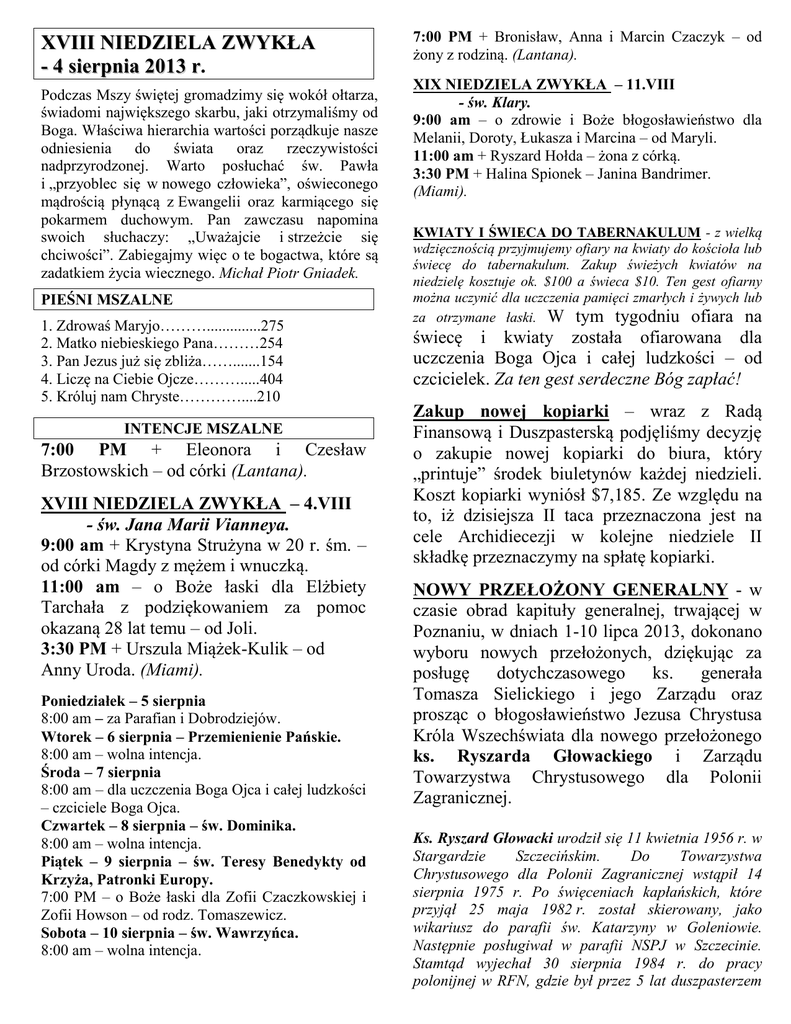 XVIII NIEDZIELA ZWYKŁA - 4 sierpnia 2013 r. Podczas Mszy świętej gromadzimy się wokół ołtarza, świadomi największego skarbu, jaki otrzymaliśmy od Boga. Właściwa hierarchia wartości porządkuje nasze odniesienia do świata oraz rzeczywistości nadprzyrodzonej. Warto posłuchać św. Pawła i „przyoblec się w nowego człowieka”, oświeconego mądrością płynącą z Ewangelii oraz karmiącego się pokarmem duchowym. Pan zawczasu napomina swoich słuchaczy: „Uważajcie i strzeżcie się chciwości”. Zabiegajmy więc o te bogactwa, które są zadatkiem życia wiecznego. Michał Piotr Gniadek. PIEŚNI MSZALNE 1. Zdrowaś Maryjo………..............275 2. Matko niebieskiego Pana………254 3. Pan Jezus już się zbliża…….......154 4. Liczę na Ciebie Ojcze……….....404 5. Króluj nam Chryste…………....210 INTENCJE MSZALNE 7:00 PM + Eleonora i Czesław Brzostowskich – od córki (Lantana). XVIII NIEDZIELA ZWYKŁA – 4.VIII - św. Jana Marii Vianneya. 9:00 am + Krystyna Strużyna w 20 r. śm. – od córki Magdy z mężem i wnuczką. 11:00 am – o Boże łaski dla Elżbiety Tarchała z podziękowaniem za pomoc okazaną 28 lat temu – od Joli. 3:30 PM + Urszula Miążek-Kulik – od Anny Uroda. (Miami). Poniedziałek – 5 sierpnia 8:00 am – za Parafian i Dobrodziejów. Wtorek – 6 sierpnia – Przemienienie Pańskie. 8:00 am – wolna intencja. Środa – 7 sierpnia 8:00 am – dla uczczenia Boga Ojca i całej ludzkości – czciciele Boga Ojca. Czwartek – 8 sierpnia – św. Dominika. 8:00 am – wolna intencja. Piątek – 9 sierpnia – św. Teresy Benedykty od Krzyża, Patronki Europy. 7:00 PM – o Boże łaski dla Zofii Czaczkowskiej i Zofii Howson – od rodz. Tomaszewicz. Sobota – 10 sierpnia – św. Wawrzyńca. 8:00 am – wolna intencja. 7:00 PM + Bronisław, Anna i Marcin Czaczyk – od żony z rodziną. (Lantana). XIX NIEDZIELA ZWYKŁA – 11.VIII - św. Klary. 9:00 am – o zdrowie i Boże błogosławieństwo dla Melanii, Doroty, Łukasza i Marcina – od Maryli. 11:00 am + Ryszard Hołda – żona z córką. 3:30 PM + Halina Spionek – Janina Bandrimer. (Miami). KWIATY I ŚWIECA DO TABERNAKULUM - z wielką wdzięcznością przyjmujemy ofiary na kwiaty do kościoła lub świecę do tabernakulum. Zakup świeżych kwiatów na niedzielę kosztuje ok. $100 a świeca $10. Ten gest ofiarny można uczynić dla uczczenia pamięci zmarłych i żywych lub za otrzymane łaski. W tym tygodniu ofiara na świecę i kwiaty została ofiarowana dla uczczenia Boga Ojca i całej ludzkości – od czcicielek. Za ten gest serdeczne Bóg zapłać! Zakup nowej kopiarki – wraz z Radą Finansową i Duszpasterską podjęliśmy decyzję o zakupie nowej kopiarki do biura, który „printuje” środek biuletynów każdej niedzieli. Koszt kopiarki wyniósł $7,185. Ze względu na to, iż dzisiejsza II taca przeznaczona jest na cele Archidiecezji w kolejne niedziele II składkę przeznaczymy na spłatę kopiarki. NOWY PRZEŁOŻONY GENERALNY - w czasie obrad kapituły generalnej, trwającej w Poznaniu, w dniach 1-10 lipca 2013, dokonano wyboru nowych przełożonych, dziękując za posługę dotychczasowego ks. generała Tomasza Sielickiego i jego Zarządu oraz prosząc o błogosławieństwo Jezusa Chrystusa Króla Wszechświata dla nowego przełożonego ks. Ryszarda Głowackiego i Zarządu Towarzystwa Chrystusowego dla Polonii Zagranicznej. Ks. Ryszard Głowacki urodził się 11 kwietnia 1956 r. w Stargardzie Szczecińskim. Do Towarzystwa Chrystusowego dla Polonii Zagranicznej wstąpił 14 sierpnia 1975 r. Po święceniach kapłańskich, które przyjął 25 maja 1982 r. został skierowany, jako wikariusz do parafii św. Katarzyny w Goleniowie. Następnie posługiwał w parafii NSPJ w Szczecinie. Stamtąd wyjechał 30 sierpnia 1984 r. do pracy polonijnej w RFN, gdzie był przez 5 lat duszpasterzem w Köln. W 1990 r. został mianowany prowincjałem chrystusowców prowincji niemiecko-holenderskowłoskiej. Funkcję prowincjała pełnił przez dwie kadencje do 16 października 2002 r. Następnie został proboszczem polonijnej parafii w Braunsweigu. Podczas XI Kapituły Generalnej Towarzystwa Chrystusowego w 2007 r. został wybrany radnym generalnym w Radzie Generalnej zgromadzenia i łączył tę funkcję z duszpasterstwem w Braunsweigu. Dnia 4 lipca 2013 r. XII Kapituła Generalna wybrała go nowym przełożonym generalnym Towarzystwa Chrystusowego. Po wyborze nowy przełożony generalny w kaplicy Domu Głównego Towarzystwa Chrystusowego w Poznaniu złożył wyznanie wiary oraz przysięgę wierności. Po czym wszyscy odśpiewali dziękczynne Te Deum. PROWINCJAŁ - Przełożonym Prowincji Północnoamerykańskiej, został mianowany na kolejną II kadencję ks. Paweł Bandurski, członkami Rady Prowincji zostali: ks. Zygmunt Ostrowski, ks. Andrzej Totzke z dniem 1 sierpnia 2013 r. PODZIĘKOWANIE – pragnę z serca podziękować za ofiarowane obrusy do kościoła przez państwa Elżbietę i Michała Hołda. Dziękuję panom Januszowi Wielga i Czesławowi Malinowskiemu za prace w ostatnim tygodniu przy kościele. Bóg zapłać i Szczęść Boże! KAWIARENKA - Zgłoszenia dyżurów proszę kierować do Państwa Ewy i Irka Otfinowskich, tel. (954) 422-5434 – dziękuję za pomoc! W ostatnim tygodniu w kawiarence posługiwały: Hanna, Krzysztof i Jacek Kopczyńscy. Dochód wyniósł $193. Bóg zapłać i Szczęść Boże! POLSKA SZKOŁA - Zapisy uczniów do polskiej szkoły na rok szkolny 2013/2014 odbywają się w bibliotece parafialnej po Mszy Świętej od godz.10-tej do 11-tej. Na czas letni życzę wszystkim nauczycielkom, dzieciom i młodzieży, dobrej pogody, wspaniałych przygód, bezpiecznych i długich wakacji! Kolejne Dni Światowe Młodych w 2016 r., w Krakowie - Prośmy o wstawiennictwo Maryi, światło Ducha Świętego dla drogi, która nas zaprowadzi na te nowe radosne święto wiary i miłości Chrystusa" - powiedział papież Franciszek, wywołując a