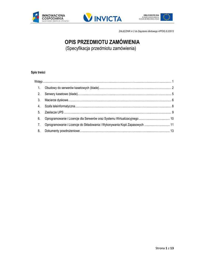 ZAŁĄCZNIK nr 2 do Zapytania ofertowego 4/POIG.8.2/2013 OPIS PRZEDMIOTU ZAMÓWIENIA (Specyfikacja przedmiotu zamówienia) Spis treści Wstęp .................................................................................................................................................................. 1 1. Obudowy do serwerów kasetowych (blade) ........................................................................................... 2 2. Serwery kasetowe (blade)...................................................................................................................... 5 3. Macierze dyskowe.................................................................................................................................. 6 4. Szafa teleinformatyczna ......................................................................................................................... 8 5. Zasilacze UPS ....................................................................................................................................... 9 6. Oprogramowanie i Licencje dla Serwerów oraz Systemu Wirtualizacyjnego ....................................... 10 7. Oprogramowanie i Licencje do Składowania i Wykonywania Kopii Zapasowych ................................ 11 8. Dokumenty powdroŜeniowe ................................................................................................................. 13 Strona 1 z 13 Wstęp: W związku z realizacją w ramach projektu „System B2B automatyzujący wymianę informacji pomiędzy INVICTA Sp. z o.o. a partnerami w zakresie usług medycznych”(Umowa UDA-POIG.08.02.00-22-037/12-00) współfinansowanego w ramach Programu Operacyjnego Innowacyjna Gospodarka lata 2007-2013 (8 Oś priorytetowa: Społeczeństwo informacyjne - zwiększanie innowacyjności gospodarki, Działanie 8.2: Wspieranie wdraŜania elektronicznego biznesu typu B2B), Invicta Sp z o.o. zaprasza do złoŜenia oferty na realizację zadania pt.: „Zakup kompletnej Platformy Sprzętowej B2B”. Realizacja zadania określonego wyŜej polegać będzie na : A. Dostarczeniu wymienionych niŜej urządzeń o parametrach, wyposaŜeniu innych cechach nie niŜszych niŜ określone w punktach w dalszej części specyfikacji, tj.: 1. Obudowy do serwerów kasetowych (blade) - 2 sztuki 2. Serwery kasetowe (blade) – 4 sztuki 3. Macierze dyskowe – 2 sztuki 4. Szafa teleinformatyczna – 1 sztuka 5. Zasilacze UPS – 2 sztuki B. Dostarczeniu oprogramowania i licencji dla serwerów oraz systemu wirtualizacyjnego zgodnie z punktem 6 niniejszej specyfikacji. C. Wykonaniu: • • • • • • • • • • • • • Instalacji urządzeń i oprogramowania w miejscach wskazanych przez Zamawiającego; Konfiguracji systemu; Przetestowaniu urządzeń i systemu; MontaŜu switchy, konfiguracji, testów komunikacji pomiędzy lokalizacjami; Kompletnego montaŜu i podłączenia macierzy i serwerów blade (w dwóch serwerowniach); Konfiguracji macierzy i serwerów (iSCIS, RAID, LUNy itp.); Ustawieniu i testów replikacji, snapshot'ów; Instalacji i konfiguracji środowiska wirtualnego; Instalacji maszyn wirtualnych, wykonaniu testów mechanizmów HA; Wykonaniu testów przełączenia na serwerownię zapasową i powrotu; Przygotowaniu procedur przełączenia do serwerowni zapasowej i odwrotnie; Instalacji, konfiguracji i wykonaniu testów systemu do realizacji kopii zapasowych; Wykonaniu wyŜej wymienionych i innych czynności pozwalających na skuteczne uruchomienie dostarczonych urządzeń i oprogramowania. D. Przeszkoleniu personelu Zamawiającego w stopniu umoŜliwiającym samodzielną prace z systemem, potwierdzone odpowiednimi certyfikatami. E. Dostarczenie kompletnej dokumentacji poinstalacyjnej i powdroŜeniowej świadczącej o skutecznym działaniu urządzeń i systemu, a takŜe wymaganych instrukcji w języku polskim. F. Dostarczenie gwarancji oraz warunków udzielania wsparcia technicznego w okresie gwarancyjnym i pogwarancyjnym zgodnie z wymaganiami określonymi niŜej w specyfikacji. Strona 2 z 13 1. Obudowy do serwerów kasetowych (blade) Zamawiający wymaga dostarczenia i wdroŜenia 2 szt. obudowy do serwerów kasetowych (blade) o następujących minimalnych parametrach i minimalnym wyposaŜeniu: Obudowy do serwerów kasetowych (blade) Typ obudowy • Do montaŜu w szafie 19” z wymaganym zestawem montaŜowym Liczba montowanych serwerów i modułów • MoŜliwość zamontowania w ramach jednej obudowy min. 14 serwerów o róŜnym typie architektury procesorów (zarówno w technologii x86 jak i w architekturze RISC) Sposób wyprowadzeń sygnałów LAN Obie obudowy muszą być wyposaŜone w przełączniki Ethernet o następujących parametrach: • KaŜda Obudowa musi być wyposaŜona w minimum dwa przełączniki Ethernet z portami zewnętrznymi obsługującymi 10 Gbit/s, • KaŜdy przełącznik musi posiadać min. 4 porty zewnętrzne 10/100/1000BASE-T • KaŜdy przełącznik musi być wyposaŜony w minimum 4 portów zewnętrznych obsługują- • • • Sposób wyprowadzeń sygnałów Fibre Channel • • • Zasilanie i chłodzenie • • • • cych standard 10Gb SFP+ oraz odpowiednią liczbę portów wewnętrznych dla pełnego obłoŜenia serwerów w obudowie blade. Interfejsy portów wewnętrznych do serwerów mogą być 1 Gbit/s. Przełączniki muszą umoŜliwiać pracę w stosie. Wymagane jest skonfigurowanie stosu dwóch przełączników w obrębie obudowy blade. Jeśli w serwerze znajdują się dodatkowe karty LAN (oprócz wymaganych 2 portów 10Gb), naleŜy uwzględnić odpowiednie moduły LAN w celu wyprowadzenia dodatkowych portów na zewnątrz obudowy. Dodatkowo naleŜy uwzględnić dwie sztuki wkładek SFP Single-Mode WDM z nadawaniem o długości fali 1310nm i zasięgiem nominalnym min 10KM do realizacji komunikacji między lokalizacjami. Konfiguracja powinna umoŜliwiać komunikację IP pomiędzy lokalizacjami dla sieci LAN oraz repliki macierzy po sieci IP. Obudowa m