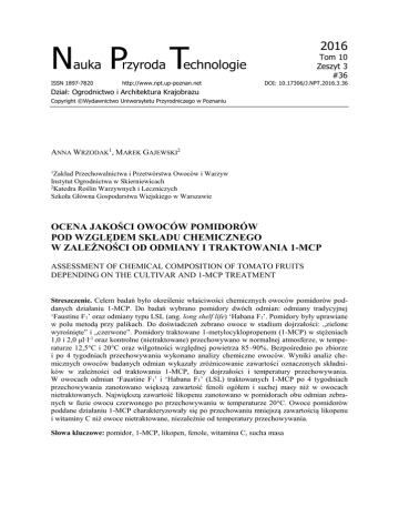 N auka ISSN 1897-7820 P rzyroda T 2016 echnologie http://www.npt.up-poznan.net Tom 10 Zeszyt 3 #36 DOI: 10.17306/J.NPT.2016.3.36 Dział: Ogrodnictwo i Architektura Krajobrazu Copyright ©Wydawnictwo Uniwersytetu Przyrodniczego w Poznaniu ANNA WRZODAK1, MAREK GAJEWSKI2 1 Zakład Przechowalnictwa i Przetwórstwa Owoców i Warzyw Instytut Ogrodnictwa w Skierniewicach 2 Katedra Roślin Warzywnych i Leczniczych Szkoła Główna Gospodarstwa Wiejskiego w Warszawie OCENA JAKOŚCI OWOCÓW POMIDORÓW POD WZGLĘDEM SKŁADU CHEMICZNEGO W ZALEŻNOŚCI OD ODMIANY I TRAKTOWANIA 1-MCP ASSESSMENT OF CHEMICAL COMPOSITION OF TOMATO FRUITS DEPENDING ON THE CULTIVAR AND 1-MCP TREATMENT Streszczenie. Celem badań było określenie właściwości chemicznych owoców pomidorów poddanych działaniu 1-MCP. Do badań wybrano pomidory dwóch odmian: odmiany tradycyjnej ‘Faustine F1’ oraz odmiany typu LSL (ang. long shelf life) ‘Habana F1’. Pomidory były uprawiane w polu metodą przy palikach. Do doświadczeń zebrano owoce w stadium dojrzałości: „zielone wyrośnięte” i „czerwone”. Pomidory traktowane 1-metylocyklopropenem (1-MCP) w stężeniach 1,0 i 2,0 μl·l-1 oraz kontrolne (nietraktowane) przechowywano w normalnej atmosferze, w temperaturze 12,5°C i 20°C oraz wilgotności względnej powietrza 85–90%. Bezpośrednio po zbiorze i po 4 tygodniach przechowywania wykonano analizy chemiczne owoców. Wyniki analiz chemicznych owoców badanych odmian wykazały zróżnicowanie zawartości oznaczonych składników w zależności od traktowania 1-MCP, fazy dojrzałości i temperatury przechowywania. W owocach odmian ‘Faustine F1’ i ‘Habana F1’ (LSL) traktowanych 1-MCP po 4 tygodniach przechowywania zanotowano większą zawartość fenoli ogółem i suchej masy niż w owocach nietraktowanych. Największą zawartość likopenu zanotowano w pomidorach obu odmian zebranych w fazie owocu czerwonego po przechowywaniu w temperaturze 20°C. Owoce pomidorów poddane działaniu 1-MCP charakteryzowały się po przechowaniu mniejszą zawartością likopenu i witaminy C niż owoce nietraktowane, niezależnie od temperatury przechowywania. Słowa kluczowe: pomidor, 1-MCP, likopen, fenole, witamina C, sucha masa 2 Wrzodak, A., Gajewski, M. (2016). Ocena jakości owoców pomidorów pod względem składu chemicznego w zależności od odmiany i traktowania 1-MCP. Nauka Przyr. Technol., 10, 3, #36. DOI: 10.17306/J.NPT.2016.3.36 Wstęp Pomidor jest najbardziej popularnym w uprawie i konsumpcji warzywem na świecie. Również w Polsce ma duże znaczenie gospodarcze. Według danych Głównego Urzędu Statystycznego w 2014 roku wyprodukowano 800 000 t pomidorów zarówno z uprawy polowej, jak i spod osłon. Sukcesywnie wzrasta konsumpcja owoców pomidorów. Konsumenci doceniają ich niezwykłe walory smakowe, ale też właściwości prozdrowotne, szczególnie ze względu na zawartość likopenu i polifenoli, związków o silnym działaniu antyoksydacyjnym. W wielu regionach Polski, w przemysłowej produkcji polowej pomidorów z przeznaczeniem do bezpośredniego spożycia w okresie letnim i jesiennym, wzrasta zainteresowanie uprawą roślin przy palikach (Borowiak, 2000; Suszyna, 2006). W uprawie tą metodą uzyskuje się owoce lepszej jakości niż w uprawie bez palików – ze względu na lepsze nasłonecznienie roślin, lepsze przewietrzenie roślin i większą skuteczność działania preparatów grzybobójczych (Babik, 1997). W ten sposób uprawia się głównie odmiany szklarniowe charakteryzujące się bardzo dobrą jakością owoców oraz przedłużonym okresem pozbiorczego składowania (ang. long shelf life). Owoce tych odmian charakteryzują się dużą twardością, równomiernym wybarwieniem, dobrym smakiem i przede wszystkim dobrze znoszą transport i składowanie (Chiesa i in., 1998). 1-Metylocyklopropen (1-MCP) jest regulatorem wzrostu przedłużającym trwałość przechowalniczą i jakość produktów roślinnych. Jest związkiem, który wiąże się z receptorami etylenu w komórkach, przez co wykazują one zmniejszoną reakcję i zmniejszoną syntezę etylenu. W efekcie następuje opóźnienie procesów starzenia i przedłużenie okresu przechowywania (Sisler i Blankenship, 1996; Sisler i Serek, 2003). W standardowej temperaturze i ciśnieniu 1-MPC jest gazem o masie cząsteczkowej 54 i wzorze strukturalnym C4H6. Jest to związek stabilny, nietoksyczny, skuteczny w bardzo niskich dawkach, a jednocześnie nieszkodliwy dla roślin w przypadku użycia go w stężeniu przekraczającym dawki optymalne. W roślinach traktowanych tym związkiem nie stwierdzono akumulacji szkodliwych substancji. Przedłużenie podaży pomidorów z produkcji polowej – o wiele tańszej niż produkcji pod osłonami jest możliwe, gdy przechowuje się owoce w optymalnych warunkach. Głównym celem producentów pomidorów jest wydłużenie czasu ich przechowywania, przy jednoczesnym zachowaniu bardzo dobrych walorów handlowych i konsumpcyjnych. Według wielu autorów pozbiorcze zastosowanie 1-metylocyklopropenu na owocach pomidorów pozwala nie tylko przedłużyć ich okres przechowywania, transportu i obrotu handlowego, lecz także zachować ich wysoką jakość (Charanjit i in., 2007; Wang i in., 2010). Badania Wang i in. (2010) wykazały, że traktowanie pomidorów 1-MCP wpływa na zwiększoną zawartość witaminy C i fenoli rozpuszczalnych. Ponadto pomidory traktowane 1-MCP zachowują lepszą jędrność i bardzo dobre wartości wytrzymałości na zgniatanie w porównaniu z owocami nietraktowanymi (Ilić i in., 2013). Celem badań było określenie zawartości wybranych składników chemicznych owoców pomidorów dwóch genetycznie zróżnicowanych odmian poddanych działaniu 1-MCP w zależności od fazy dojrzałości i temperatury przechowywania. 3 Wrzodak, A., Gajewski, M. (2016). Ocena jakości owoców pomidorów pod względem składu chemicznego w zależności od odmiany i traktowania 1-MCP. Nauka Przyr. Techno
