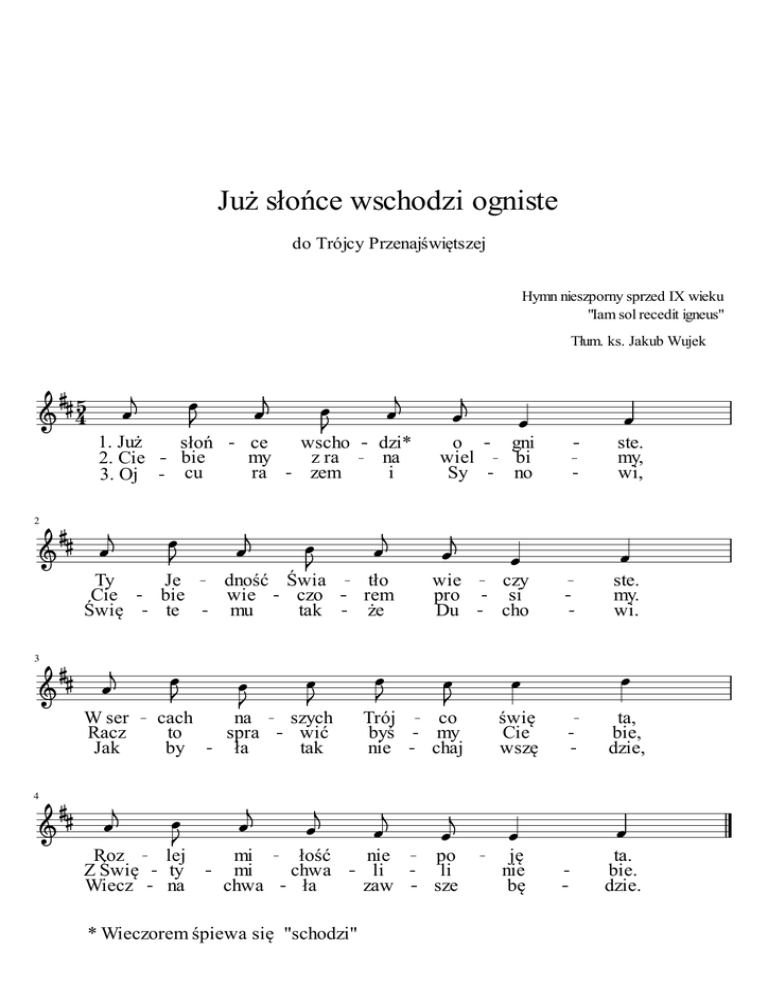 Już słońce wschodzi ogniste do Trójcy Przenajświętszej Hymn nieszporny sprzed IX wieku "Iam sol recedit igneus" Tłum. ks. Jakub Wujek 5 4 1. Już 2. Cie 3. Oj słoń bie cu ce my ra wscho z ra zem dzi* na i o wiel Sy gni bi no ste. my, wi, 2 Ty Cie Świę Je bie te dność Świa wie czo mu tak tło rem że wie pro Du czy si cho ste. my. wi. 3 W ser Racz Jak cach to by na spra ła szych wić tak Trój byś nie co my chaj świę Cie wszę ta, bie, dzie, nie li zaw po li sze ję nie bę ta. bie. dzie. 4 Roz Z Świę Wiecz lej ty na mi mi chwa łość chwa ła * Wieczorem śpiewa się "schodzi"