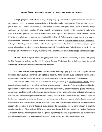 NOWE ŻYCIE DOMU POLSKIEGO – DOMU KULTURY W LIPNIKU Minęło już ponad 230 lat, od chwili, gdy pojawiły się pierwsze historyczne wzmianki o budynku w centrum Lipnika, w którym toczyło się życie kulturalno-społeczne Polaków. W cztery lata po tym, jak w roku 1772 Polska doświadczyła pierwszego rozbioru pomiędzy Rosję, Prusy i Austrię tracąc wolność, w centrum Lipnika Polacy zaczęli organizować swoje życie społeczno-kulturalne. Idea stworzenia polskiej placówki w wielokulturowym Lipniku kontynuowana była również wśród Polaków mieszkających w Lipniku na początku XX wieku, gdy Polska dopiero zaczynała swą drogę do niepodległości. Wówczas to grupa polskich patriotów na czele z księdzem Stanisławem Kobyłeckim, wikarym z Lipnika, podjęła w 1914 roku trud zorganizowania dla Polaków zamieszkujących Lipnik miejsca krzewienia polskości poprzez budowę dużej sali Domu Polskiego. Właścicielem budynku Domu Polskiego od 1929 roku do II Wojny Światowej było Towarzystwo Polsko-Katolickiego Domu Ludowego. W roku 1952 budynek został przejęty przez Skarb Państwa i przekazany w zarząd Miejskiej Radzie Narodowej pełniąc do lat 70, XX wieku funkcję Miejskiego Domu Kultury, kiedy to został zamknięty ze względu na zły stan techniczny budynku. Od 1994 roku zaczyna się nowa historia Domu Polskiego, gdy gospodarzem budynku zostaje Beskidzie Towarzystwo Sportowe Lipnik (dzisiaj Rekord), które do roku 1998 wykonało bardzo wiele niezbędnych prac remontowych mających na celu uratować budynek od katastrofy budowlanej. Od wiosny 2000 roku prace remontowe kontynuowało już Stowarzyszenie LIPNIK, druga organizacja pozarządowa powstała w dzielnicy po przemianach 1989 roku. Dzięki mieszkańcom Lipnika, sponsorom i wolontariuszom wykonano centralne ogrzewanie, przeprowadzono prace malarskie, naprawiono podłogę w sali widowiskowej, zamontowano rynny, uporządkowano instalację elektryczną i wodną, wykonano zewnętrzne odwodnienie terenu, zamontowano oświetlenie, wyposażono zaplecze kuchenne, naprawiono stolarkę drzwiową i okienną oraz wykonano tysiące niezbędnych czynności koniecznych, aby budynek mógł służyć dzielnicy. Dzięki tym pracom już jesienią Dom Polski ponownie zaczął tętnić życiem i służyć lokalnej społeczności. Po remoncie, już w ogrzewanych i ciepłych pomieszczeniach, późną jesienią 2000 roku, duża sala Domu Polskiego służyła za miejsce Walnego Zebrania Członków Koła Wędkarskiego w Lipniku, a pierwszą imprezą zorganizowaną po remoncie dla mieszkańców Lipnika była „Zabawa Andrzejkowa”, która odbyła się 25 listopada 2000 roku. 1z2 Staraniem Stowarzyszenia LIPNIK, 6 listopada 2001 roku, na Sesji Rady Miejskiej zapadła decyzja o powołaniu w Lipniku z dniem 01.01.2002 roku Miejskiego Domu Kultury, który po ponad ćwierć wieku wrócił do Lipnika. W roku 2005 Gmina Bielsko-Biała wykonała generalny remont dachu Domu Polskiego wraz ze stropami, a Stowarzyszenie LIPNIK, widząc potrzebę adaptacji poddasza, zakupiło dwanaście okien dachowych, które podczas remontu zostały zamontowane. Od maja 2008 roku Domem Polskim zarządza już Miejski Dom Kultury w Bielsku-Białej. W roku 2010 Gmina Bielsko-Biała wykonała kapitalny remont pomieszczeń wraz z elewacją budynku. W czasie remontu budynek otrzymał wszystkie nowe instalacje, zbudowano zaplecze kuchenne, nowe sanitariaty, wykonano piękny wystrój dużej sali wraz z profesjonalnym oprzyrządowaniem sceny. Powstało wiele pięknie urządzonych i funkcjonalnych pomieszczeń, w których można prowadzić zajęcia, a dzięki windzie jest jedynym w mieście Domem Kultury tak przyjaznym obiektem dla osób niepełnosprawnych. Dom Polski jest bardzo pozytywnym przykładem współpracy i zaangażowania w sprawy społeczne mieszkańców i lokalnych władz, dzięki której ten bardzo ważny dla historii Lipnika obiekt powrócił do swojej świetności. Dzisiaj Lipniczanie nie wyobrażają już sobie, że historia budynku mogła potoczyć się inaczej ... a mogła, gdyby nie wspólny cel. Stowarzyszenie LIPNIK, 01-12-2012 2z2