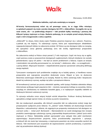 Warszawa, 13.04.2016 Niebieska tabletka, czyli seks zamknięty w recepcie W branży farmaceutycznej mówi się od pewnego czasu, że w ciągu kilku miesięcy w aptekach pojawić się może szeroko dostępny lek OTC z sildenafilem. Szczegóły nie są na razie znane, ale – co podkreślają eksperci – taki produkt byłby rewolucją i pomocą dla kilkuset tysięcy mężczyzn w kraju. Badania pokazują, że ze wstydu przed wizytą lekarską, część z nich zrezygnowała z seksu zupełnie. „Sildenafil” to słowo, które dużej części Polaków powinno kojarzyć się z seksem. Powinno, a jednak się nie kojarzy. To substancja czynna, która jest najważniejszym składnikiem najpopularniejszych leków na zaburzenia erekcji. W Polsce są one dostępne tylko na receptę, ale specjaliści coraz głośniej podważają sens tak ścisłej reglamentacji preparatów z sildenafilem. Na zaburzenia erekcji w Polsce cierpi ponad 1,7 mln mężczyzn. Część nie leczy się w ogóle, część pomocy szuka w powszechnie dostępnych suplementach, których działanie nie zostało potwierdzone. Łączy ich jedno – nie byli ze swoim problemem u lekarza. Często ze wstydu i nieśmiałości nie potrafią porozmawiać na „te tematy” z doktorem, albo – w szczególności – z panią doktor. Mężczyźni bowiem – niejednokrotnie poprzez sprawność seksualną definiują swoją męskość. Tymczasem rozwiązanie tych problemów znajduje się w każdej aptece, a handlowa nazwa preparatów jest najczęściej wszystkim doskonale znana. Kłopot w tym, że skuteczne lekarstwa zawierające slidenafil są na receptę. Nawet te, które zawierają małe i bezpieczne dawki tej substancji czynnej, wydaje się tylko z przepisania lekarza. W konsekwencji zamiast po prostu odwiedzić aptekę, setki tysięcy Polaków odwiedza sklepy internetowe próbując kupić popularne leki – niestety najczęściej trafiają na oszustów, którzy wysyłają im ufarbowany na niebiesko kawałek gipsu, a w najlepszym wypadku tabletki ze śladowymi ilościami substancji czynnej. Ta sytuacja wzbudza coraz więcej krytyki wśród ekspertów. Profesor Andrzej Borkowski, specjalista urologii wprost mówi, że zmiany są warte rozważenia. Nie ma medycznych powodów, dla których wszystkie leki na zaburzenia erekcji mają być przepisywane wyłącznie przez lekarza. To „odcina” wielu Polaków od skutecznego leczenia kłopotów z seksualnością i skłania, do sięgnięcia po preparaty nieskuteczne lub dostępne na czarnym rynku – mówi prof. Borkowski – Wprowadzenie na rynek dostępnego bez recepty produktu zawierającego substancję czynną, poprawiłoby bezpieczeństwo i jakość życia wielu mężczyzn w Polsce. Należałoby jednak wprowadzić przy zakupie leku jakiś mechanizm zapewniający bezpieczeństwo pacjenta, który przedstawiałby zagrożenia i sytuacje, w których lek nie może być stosowany, a mężczyzna powinien się mimo wszystko zwrócić do lekarza. Taki mechanizm jest oczywiście do wypracowania i jestem przekonany, iż powinien stać się przedmiotem dalszej dyskusji. Więcej informacji udziela: Aleksandra Adrian Walk PR Tel.: 519 021 080 E-‐mail: [email protected]