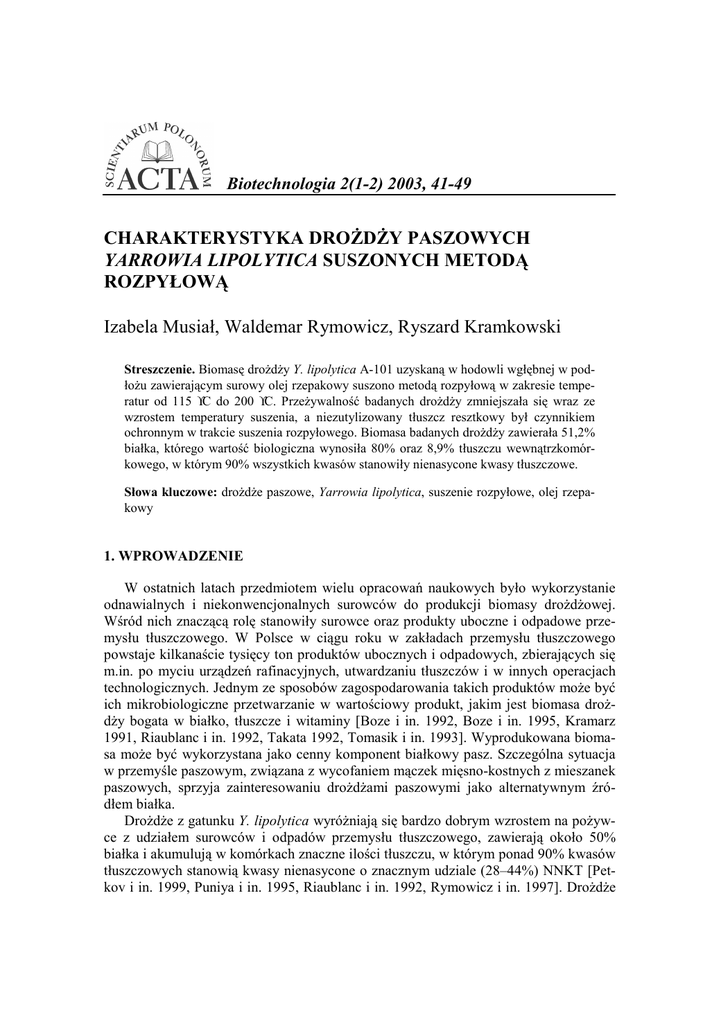 Biotechnologia 2(1-2) 2003, 41-49 CHARAKTERYSTYKA DROśDśY PASZOWYCH YARROWIA LIPOLYTICA SUSZONYCH METODĄ ROZPYŁOWĄ Izabela Musiał, Waldemar Rymowicz, Ryszard Kramkowski Streszczenie. Biomasę droŜdŜy Y. lipolytica A-101 uzyskaną w hodowli wgłębnej w podłoŜu zawierającym surowy olej rzepakowy suszono metodą rozpyłową w zakresie temperatur od 115 °C do 200 °C. PrzeŜywalność badanych droŜdŜy zmniejszała się wraz ze wzrostem temperatury suszenia, a niezutylizowany tłuszcz resztkowy był czynnikiem ochronnym w trakcie suszenia rozpyłowego. Biomasa badanych droŜdŜy zawierała 51,2% białka, którego wartość biologiczna wynosiła 80% oraz 8,9% tłuszczu wewnątrzkomórkowego, w którym 90% wszystkich kwasów stanowiły nienasycone kwasy tłuszczowe. Słowa kluczowe: droŜdŜe paszowe, Yarrowia lipolytica, suszenie rozpyłowe, olej rzepakowy 1. WPROWADZENIE W ostatnich latach przedmiotem wielu opracowań naukowych było wykorzystanie odnawialnych i niekonwencjonalnych surowców do produkcji biomasy droŜdŜowej. Wśród nich znaczącą rolę stanowiły surowce oraz produkty uboczne i odpadowe przemysłu tłuszczowego. W Polsce w ciągu roku w zakładach przemysłu tłuszczowego powstaje kilkanaście tysięcy ton produktów ubocznych i odpadowych, zbierających się m.in. po myciu urządzeń rafinacyjnych, utwardzaniu tłuszczów i w innych operacjach technologicznych. Jednym ze sposobów zagospodarowania takich produktów moŜe być ich mikrobiologiczne przetwarzanie w wartościowy produkt, jakim jest biomasa droŜdŜy bogata w białko, tłuszcze i witaminy [Boze i in. 1992, Boze i in. 1995, Kramarz 1991, Riaublanc i in. 1992, Takata 1992, Tomasik i in. 1993]. Wyprodukowana biomasa moŜe być wykorzystana jako cenny komponent białkowy pasz. Szczególna sytuacja w przemyśle paszowym, związana z wycofaniem mączek mięsno-kostnych z mieszanek paszowych, sprzyja zainteresowaniu droŜdŜami paszowymi jako alternatywnym źródłem białka. DroŜdŜe z gatunku Y. lipolytica wyróŜniają się bardzo dobrym wzrostem na poŜywce z udziałem surowców i odpadów przemysłu tłuszczowego, zawierają około 50% białka i akumulują w komórkach znaczne ilości tłuszczu, w którym ponad 90% kwasów tłuszczowych stanowią kwasy nienasycone o znacznym udziale (28–44%) NNKT [Petkov i in. 1999, Puniya i in. 1995, Riaublanc i in. 1992, Rymowicz i in. 1997]. DroŜdŜe 42 I. Musiał i in. te dobrze rosną przy pH podłoŜa poniŜej 4, co jest bardzo korzystne w procesie przemysłowym, poniewaŜ umoŜliwia to prowadzenie procesu w warunkach niesterylnych i eliminuje energochłonny proces jałowienia poŜywek i aparatury. Ponadto, prowadzenie procesu produkcji droŜdŜy Y. lipolytica na substratach tłuszczowych pozwala uzyskiwać znacznie wyŜsze wydajności biomasy w porównaniu do procesów, w których substratem są surowce węglowodanowe [Lee i in. 1993, Montet i in. 1983, Musiał i Rymowicz 2002, Puniya i in. 1995, Riaublanc i in. 1992, Takata 1992]. Najlepszym sposobem utrwalania droŜdŜy paszowych jest suszenie, które pozwala uzyskać produkt łatwy w przechowywaniu i transporcie. Biomasa róŜnych gatunków droŜdŜy charakteryzuje się odmienną reakcją na stosowane metody i warunki suszenia. W czasie tego procesu następują istotne zmiany jakościowe, które mogą być zarówno poŜądane, jak i niekorzystne. Przebieg i charakter tych zmian zaleŜy od składu bioproduktu oraz stosowanej metody suszenia i parametrów procesu, a w szczególności temperatury i szybkości ogrzewania oraz wilgotności końcowej i szybkości odprowadzenia wilgoci. Podczas suszenia droŜdŜy paszowych najwaŜniejsze są zmiany związane z mechanizmem zniszczenia komórek i zahamowania procesów metabolicznych. Zgodnie z normą PN-81/A-79006 dotyczącą droŜdŜy paszowych suszonych, powinny one być po suszeniu nieaktywne. Jedną z moŜliwych technik suszenia materiałów biologicznych jest suszenie w suszarkach rozpyłowych, gdzie kontakt droŜdŜy z wysoką temperaturą nie przekracza kilkunastu sekund. Celem niniejszych badań jest ocena przydatności suszenia rozpyłowego do utrwalania biomasy droŜdŜy paszowych Y. lipolytica namnaŜanych w poŜywce z dodatkiem surowców tłuszczowych oraz ocena wartości biologicznej wysuszonych droŜdŜy. 2. MATERIAŁ I METODY 2.1. Mikroorganizm Materiał biologiczny stanowiły droŜdŜe Y. lipolytica A-101, pochodzące z Katedry Biotechnologii i Mikrobiologii śywności AR we Wrocławiu. 2.2. Suszenie Suszeniu poddano droŜdŜe wraz z podłoŜem hodowlanym, uzyskane w hodowlach periodycznych powtórzeniowych, w których surowy olej rzepakowy był jedynym źródłem węgla i energii [Musiał i Rymowicz 2002]. Suszenie rozpyłowe prowadzono w suszarce rozpyłowej typu Büchi 900 w zakresie temperatur od 115 do 200 oC. Szybkość przepływu zawiesiny droŜdŜy, o stęŜeniu około 65 g s.m. droŜdŜy L-1, przez dyszę suszarki rozpyłowej wynosiła 150 mLh-1 . 2.3. Metody analityczne Tłuszcz resztkowy oznaczano wagowo, 10 mL zawiesiny komórek poddawano dwukrotnej ekstrakcji eterem naftowym (2x2,5 mL), frakcje eterowe odparowywano w naczyńkach wagowych w temperaturze 50 °C, a następnie naczyńka dosuszano w temperaturze 105 °C do stałej masy. Acta Sci. Pol. Charakterystyka droŜdŜy paszowych ... 43 Tłuszcz wewnątrzkomórkowy oznaczano wagowo po ekstrakcji biomasy droŜdŜy metodą Bligh i Dyer [Kates 1972], fazę chloroformową odparowywano pod próŜnią i suszono do stałej masy w naczyńkach wagowych w 105 °C. Skład kwasów tłuszczowych w tłuszczu wewnątrzkomórkowym, otrzymanym po odparowaniu chloroformu pod próŜnią, oznaczono na chromatografie gazowym firmy HAWLETT PACKARD 5890, na kolumnie firmy SGE- BPX70, 0,25m.-50mx0,22mm, metodą w programie od temperatury 140 do 210 °C według Państwowej Normy PN-EN ISO 5508. Białko komórkowe oznaczano metodą biuretową, a jego skład aminokwasowy techniką chromatografii cieczowej