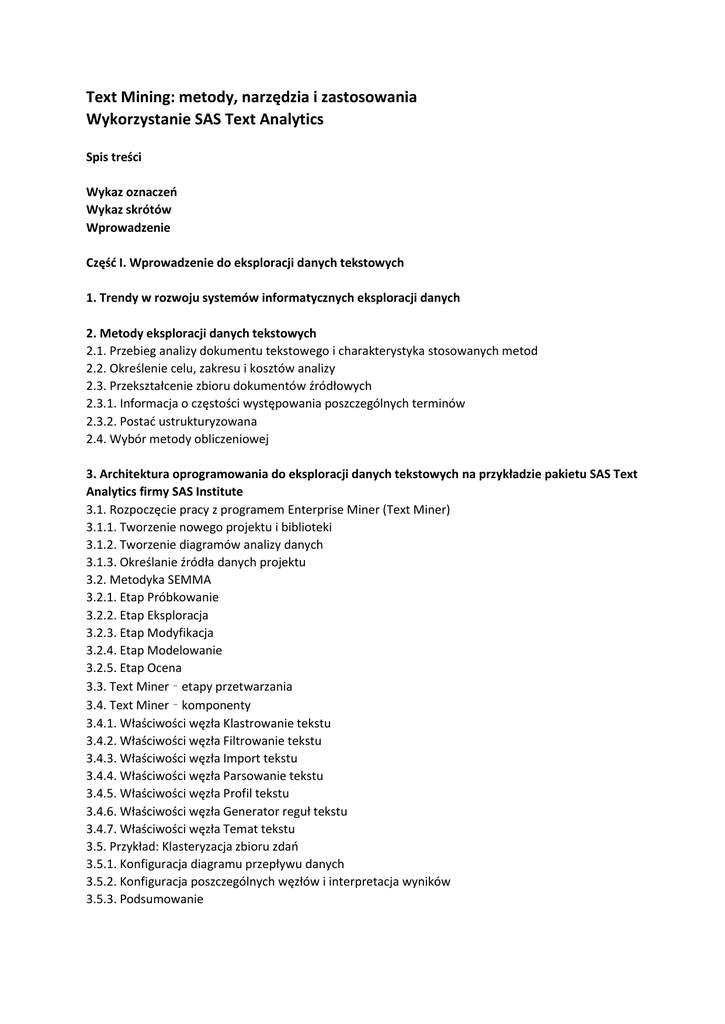 Text Mining: metody, narzędzia i zastosowania Wykorzystanie SAS Text Analytics Spis treści Wykaz oznaczeń Wykaz skrótów Wprowadzenie Część I. Wprowadzenie do eksploracji danych tekstowych 1. Trendy w rozwoju systemów informatycznych eksploracji danych 2. Metody eksploracji danych tekstowych 2.1. Przebieg analizy dokumentu tekstowego i charakterystyka stosowanych metod 2.2. Określenie celu, zakresu i kosztów analizy 2.3. Przekształcenie zbioru dokumentów źródłowych 2.3.1. Informacja o częstości występowania poszczególnych terminów 2.3.2. Postać ustrukturyzowana 2.4. Wybór metody obliczeniowej 3. Architektura oprogramowania do eksploracji danych tekstowych na przykładzie pakietu SAS Text Analytics firmy SAS Institute 3.1. Rozpoczęcie pracy z programem Enterprise Miner (Text Miner) 3.1.1. Tworzenie nowego projektu i biblioteki 3.1.2. Tworzenie diagramów analizy danych 3.1.3. Określanie źródła danych projektu 3.2. Metodyka SEMMA 3.2.1. Etap Próbkowanie 3.2.2. Etap Eksploracja 3.2.3. Etap Modyfikacja 3.2.4. Etap Modelowanie 3.2.5. Etap Ocena 3.3. Text Miner – etapy przetwarzania 3.4. Text Miner – komponenty 3.4.1. Właściwości węzła Klastrowanie tekstu 3.4.2. Właściwości węzła Filtrowanie tekstu 3.4.3. Właściwości węzła Import tekstu 3.4.4. Właściwości węzła Parsowanie tekstu 3.4.5. Właściwości węzła Profil tekstu 3.4.6. Właściwości węzła Generator reguł tekstu 3.4.7. Właściwości węzła Temat tekstu 3.5. Przykład: Klasteryzacja zbioru zdań 3.5.1. Konfiguracja diagramu przepływu danych 3.5.2. Konfiguracja poszczególnych węzłów i interpretacja wyników 3.5.3. Podsumowanie Część II. Przetwarzanie informacji zawartej w dokumencie tekstowym 4. Wybór funkcji wagującej macierzy częstości występowania terminów 4.1. Wagi częstości 4.2. Wagi wyrażenia 4.3. Przykład obliczeniowy 4.4. Podsumowanie 5. Redukcja wymiarowości macierzy częstości występowania terminów 5.1. Analiza semantyczna zmiennych ukrytych 5.1.1. Rozkład SVD 5.1.2. Przykład obliczeniowy rozkładu SVD 5.2. Podsumowanie 6. Wybór algorytmu klastrowania dokumentów tekstowych 6.1. Określenie miary podobieństwa grupy dokumentów 6.2. Algorytmy klastrowania 6.3. Grupowanie za pomocą węzła Klastrowanie tekstów 6.3.1. Węzeł Klastrowanie tekstu – algorytm Hierarchiczny 6.3.2. Węzeł Klastrowanie tekstu – algorytm Maksymalizacja oczekiwań 6.3.3. Węzeł Klastrowanie tekstu – właściwość Terminy opisowe 6.4. Grupowanie za pomocą węzła Temat tekstu 6.4.1. Tematy definiowane przez użytkownika 6.5. Posumowanie 7. Zarys metodyki tworzenia modeli predykcyjnych oraz porównywania zdolności predykcyjnych modeli 7.1. Tworzenie modelu predykcyjnego 7.2. Ocena błędu klasyfikacji 7.2.1. Krzywe ROC 7.2.2. Wykresy wzrostu 7.3. Przykład: Użycie węzła Importowanie tekstu oraz porównywanie modeli predykcyjnych 7.3.1. Konfiguracja diagramu przepływu danych oraz poszczególnych węzłów 7.4. Podsumowanie 8. Klastrowanie dokumentów nadzorowane przez użytkownika 8.1. Charakterystyka węzła Generator reguł tekstu 8.2. Podsumowanie Część III. Wydobywanie i organizacja wiedzy z dokumentów tekstowych w instytucji 9. Zarys zagadnień związanych z wydobywaniem i organizacją wiedzy w instytucji 9.1. Wprowadzenie 9.1.1. SAS Crawler 9.1.2. SAS Search and Indexing 9.1.3. SAS Information Retrival Studio 9.2. Podsumowanie 10. Klasyfikacja dokumentów 10.1. SAS Content Categorization Studio 10.1.1. Metody klasyfikacji dokumentów dostępne w SAS CCS 10.1.2. Wydobywanie konceptów dostępne w SAS CCS 10.1.3. Wydobywanie kontekstu dostępne w SAS CCS 10.1.4. Zakładanie nowego projektu 10.1.5. Metodyka planowania projektu 10.1.6. Tworzenie nowej kategorii 10.1.7. Zasady używania kategoryzatora statystycznego 10.1.8. Zasady używania kategoryzatora generującego reguły automatycznie 10.1.9. Zasady używania kategoryzatora bazującego na regułach 10.1.10. Praca z konceptami 10.2. Przykład: Zastosowania klasyfikacji dokumentów w celu wspomagania diagnostyki w departamencie radiodiagnostyki 10.3. Podsumowanie 11. Analiza sentymentu 11.1. SAS Sentiment Analysis Studio 11.1.1. Metoda oceny sentymentu dla dokumentu 11.1.2. Zakładanie nowego projektu 11.1.3. Testowanie istniejących modeli 11.1.4. Tworzenie modeli hybrydowych 11.1.5. SAS Sentiment Analysis Server 11.2. Przykład analizy sentymentu użytkowników telefonów komórkowych 11.3. Podsumowanie Część IV. Inne zagadnienia przetwarzania dokumentów tekstowych 12. Inne elementy przetwarzania danych tekstowych 12.1. Porównywanie dokumentów za pomocą metryk 12.1.1. Odległość kosinusowa 12.1.2. Metryka Jaccarda 12.2. Wydobywanie jednostek specjalnych z dokumentów Słownik pojęć związanych z eksploracją danych tekstowych Dodatek A: Podstawy obsługi środowiska SAS i język 4GL A.1. Wprowadzenie do obsługi systemu SAS A.1.1. Struktura zbioru danych SAS A.1.2. Formaty i informaty A.2. Język 4GL A.2.1. Blok typu DATA STEP A.2.2. Blok typu PROC STEP Dodatek B: Podstawy języka makr B.1. Makrozmienne B.2. Makroprogramy Dodatek C: Wizualna interpretacja danych C.1. Przegląd typów wykresów stosowanych dla danych tekstowych Bibliografia Indeks pojęć Spis rysunków Spis tabel