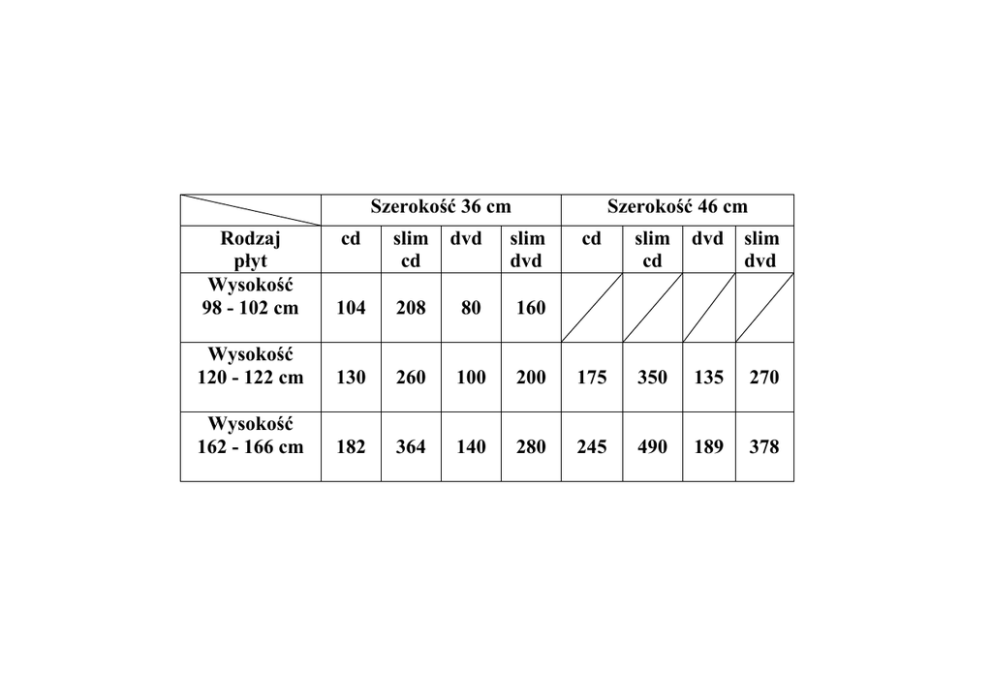 Szerokość 36 cm Szerokość 46 cm Rodzaj płyt Wysokość 98 - 102 cm cd slim cd dvd slim dvd cd slim cd dvd slim dvd 104 208 80 160 Wysokość 120 - 122 cm 130 260 100 200 175 350 135 270 Wysokość 162 - 166 cm 182 364 140 280 245 490 189 378