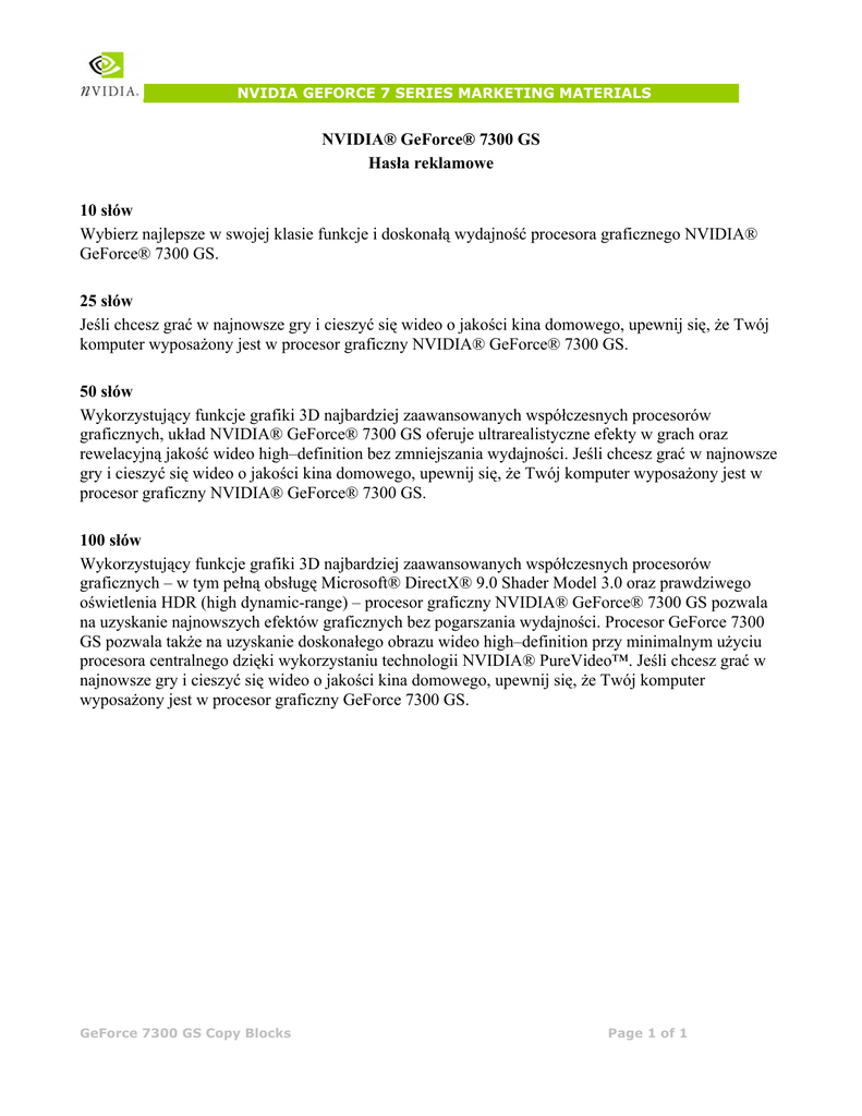 NVIDIA GEFORCE 7 SERIES MARKETING MATERIALS NVIDIA® GeForce® 7300 GS Hasła reklamowe 10 słów Wybierz najlepsze w swojej klasie funkcje i doskonałą wydajność procesora graficznego NVIDIA® GeForce® 7300 GS. 25 słów Jeśli chcesz grać w najnowsze gry i cieszyć się wideo o jakości kina domowego, upewnij się, że Twój komputer wyposażony jest w procesor graficzny NVIDIA® GeForce® 7300 GS. 50 słów Wykorzystujący funkcje grafiki 3D najbardziej zaawansowanych współczesnych procesorów graficznych, układ NVIDIA® GeForce® 7300 GS oferuje ultrarealistyczne efekty w grach oraz rewelacyjną jakość wideo high–definition bez zmniejszania wydajności. Jeśli chcesz grać w najnowsze gry i cieszyć się wideo o jakości kina domowego, upewnij się, że Twój komputer wyposażony jest w procesor graficzny NVIDIA® GeForce® 7300 GS. 100 słów Wykorzystujący funkcje grafiki 3D najbardziej zaawansowanych współczesnych procesorów graficznych – w tym pełną obsługę Microsoft® DirectX® 9.0 Shader Model 3.0 oraz prawdziwego oświetlenia HDR (high dynamic-range) – procesor graficzny NVIDIA® GeForce® 7300 GS pozwala na uzyskanie najnowszych efektów graficznych bez pogarszania wydajności. Procesor GeForce 7300 GS pozwala także na uzyskanie doskonałego obrazu wideo high–definition przy minimalnym użyciu procesora centralnego dzięki wykorzystaniu technologii NVIDIA® PureVideo™. Jeśli chcesz grać w najnowsze gry i cieszyć się wideo o jakości kina domowego, upewnij się, że Twój komputer wyposażony jest w procesor graficzny GeForce 7300 GS. GeForce 7300 GS Copy Blocks Page 1 of 1