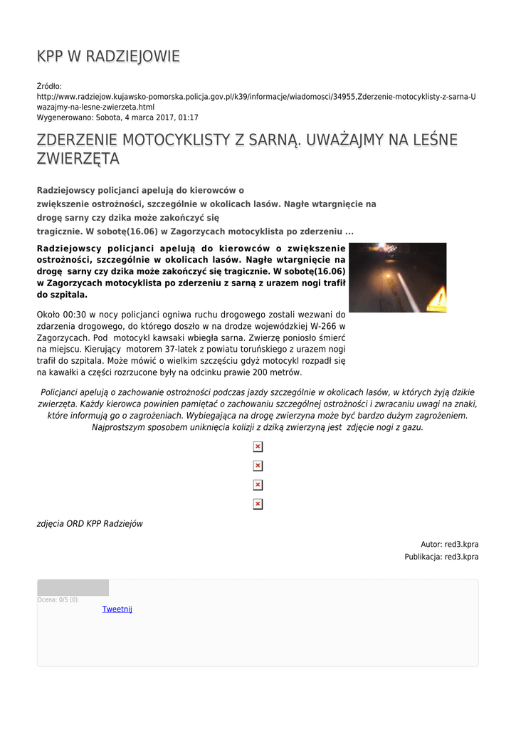 KPP W RADZIEJOWIE Źródło: http://www.radziejow.kujawsko-pomorska.policja.gov.pl/k39/informacje/wiadomosci/34955,Zderzenie-motocyklisty-z-sarna-U wazajmy-na-lesne-zwierzeta.html Wygenerowano: Sobota, 4 marca 2017, 01:17 ZDERZENIE MOTOCYKLISTY Z SARNĄ. UWAŻAJMY NA LEŚNE ZWIERZĘTA Radziejowscy policjanci apelują do kierowców o zwiększenie ostrożności, szczególnie w okolicach lasów. Nagłe wtargnięcie na drogę sarny czy dzika może zakończyć się tragicznie. W sobotę(16.06) w Zagorzycach motocyklista po zderzeniu ... Radziejowscy policjanci apelują do kierowców o zwiększenie ostrożności, szczególnie w okolicach lasów. Nagłe wtargnięcie na drogę sarny czy dzika może zakończyć się tragicznie. W sobotę(16.06) w Zagorzycach motocyklista po zderzeniu z sarną z urazem nogi trafił do szpitala. Około 00:30 w nocy policjanci ogniwa ruchu drogowego zostali wezwani do zdarzenia drogowego, do którego doszło w na drodze wojewódzkiej W-266 w Zagorzycach. Pod motocykl kawsaki wbiegła sarna. Zwierzę poniosło śmierć na miejscu. Kierujący motorem 37-latek z powiatu toruńskiego z urazem nogi trafił do szpitala. Może mówić o wielkim szczęściu gdyż motocykl rozpadł się na kawałki a części rozrzucone były na odcinku prawie 200 metrów. Policjanci apelują o zachowanie ostrożności podczas jazdy szczególnie w okolicach lasów, w których żyją dzikie zwierzęta. Każdy kierowca powinien pamiętać o zachowaniu szczególnej ostrożności i zwracaniu uwagi na znaki, które informują go o zagrożeniach. Wybiegająca na drogę zwierzyna może być bardzo dużym zagrożeniem. Najprostszym sposobem uniknięcia kolizji z dziką zwierzyną jest zdjęcie nogi z gazu. zdjęcia ORD KPP Radziejów Autor: red3.kpra Publikacja: red3.kpra Ocena: 0/5 (0) Tweetnij