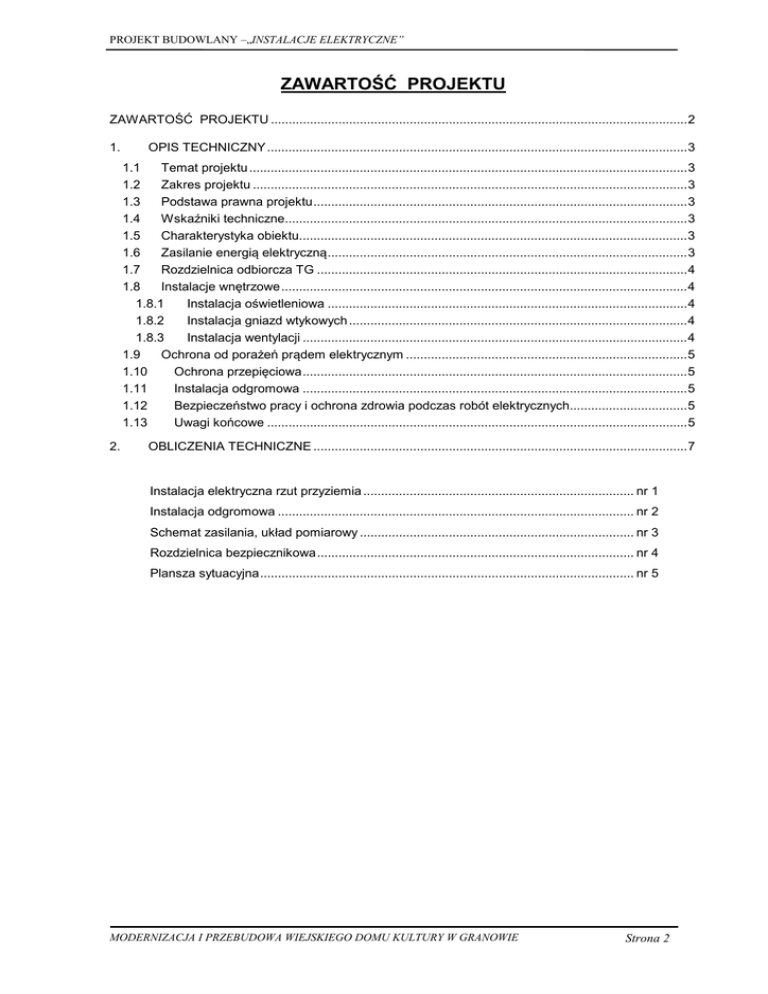 PROJEKT BUDOWLANY –„INSTALACJE ELEKTRYCZNE” ZAWARTOŚĆ PROJEKTU ZAWARTOŚĆ PROJEKTU ..................................................................................................................... 2 1. OPIS TECHNICZNY ...................................................................................................................... 3 1.1 Temat projektu ........................................................................................................................... 3 1.2 Zakres projektu .......................................................................................................................... 3 1.3 Podstawa prawna projektu ......................................................................................................... 3 1.4 Wskaźniki techniczne................................................................................................................. 3 1.5 Charakterystyka obiektu............................................................................................................. 3 1.6 Zasilanie energią elektryczną ..................................................................................................... 3 1.7 Rozdzielnica odbiorcza TG ........................................................................................................ 4 1.8 Instalacje wnętrzowe .................................................................................................................. 4 1.8.1 Instalacja oświetleniowa ..................................................................................................... 4 1.8.2 Instalacja gniazd wtykowych ............................................................................................... 4 1.8.3 Instalacja wentylacji ............................................................................................................ 4 1.9 Ochrona od porażeń prądem elektrycznym ............................................................................... 5 1.10 Ochrona przepięciowa ............................................................................................................ 5 1.11 Instalacja odgromowa ............................................................................................................ 5 1.12 Bezpieczeństwo pracy i ochrona zdrowia podczas robót elektrycznych................................. 5 1.13 Uwagi końcowe ...................................................................................................................... 5 2. OBLICZENIA TECHNICZNE ......................................................................................................... 7 Instalacja elektryczna rzut przyziemia ............................................................................ nr 1 Instalacja odgromowa .................................................................................................... nr 2 Schemat zasilania, układ pomiarowy ............................................................................. nr 3 Rozdzielnica bezpiecznikowa ......................................................................................... nr 4 Plansza sytuacyjna ......................................................................................................... nr 5 MODERNIZACJA I PRZEBUDOWA WIEJSKIEGO DOMU KULTURY W GRANOWIE Strona 2 PROJEKT BUDOWLANY –„INSTALACJE ELEKTRYCZNE” 1. OPIS TECHNICZNY 1.1 Temat projektu Instalacje elektryczne wnętrzowe oraz przebudowa przyłącza kablowego i układu pomiarowego. 1.2 Zakres projektu Niniejszy projekt został wykonany jako techniczny i obejmuje : - Tablice rozdzielcze i układy pomiarowe - Zasilanie pomiaru - Instalacje oświetleniowe - Instalacje gniazd wtykowych - Instalacje połączeń wyrównawczych 1.3 Podstawa prawna projektu Umowa Sprzedaży Energii Elektrycznej i Świadczenia Usług Przesyłowych, zawarta pomiędzy Inwestorem, a Dystrybutorem energii elektrycznej Projekt architektoniczno-budowlany instalacji wod. - kan., c.o., i wentylacji.. Uzgodnienia międzybranżowe. 1.4 Wskaźniki techniczne Moc przyłączeniowa P = 20kW Moc umowna Pu =14kW Współczynnik wykorzystania mocy kz = 0,40 Współczynnik mocy cosϕ = 0,94 Prąd znamionowy I = 32A 1.5 Charakterystyka obiektu. Projektowany obiekt zlokalizowany jest w miejscowości Granowo. Istniejący stan instalacji i planowana rozbudowa obiektu wymusza całkowitą wymianę i przebudowę instalacji wnętrzowej oraz przyłączą kablowego. 1.6 Zasilanie energią elektryczną Zasilanie energią elektryczną odbywać się będzie z istniejącego przyłącza kablowego. Istniejący układ pomiarowy zgodnie z zaleceniami ENEA OPERATOR Sp. z o.o. Rejon Dystrybucji Choszczno należy wynieść na granicę własności przyłacza kablowego tj. na słup linii napowietrznej. W tym celu na słupie linii napowietrznej należy zainstalować na wysokości około 1.8m szafką pomiarowo rozdzielczą w obudowie typu EMITER lub równorzędnej przystosowanej do zamykania systemem kluczy obowiązującym u Dystrybutora energii elektrycznej. W szafce należy zabudować na szynie TH 35 zabezpieczenia przelicznikowe typu 3x S311 C32A oraz z a układem pomiarowym łącznik typu FR 303 63A. Należy pozostawić zapas kabla YKY4x16 mm który umożliwi podłączenie naszej projektowanej szafki z zabezpieczeniami typu KH00 zabudowanymi przez ENEA OPERATOR na tym samym słupie. Istniejący kabel YAKY4 x35 mm wprowadzić do szafki pomiarowo rozdzielczej MODERNIZACJA I PRZEBUDOWA WIEJSKIEGO DOMU KULTURY W GRANOWIE Strona 3 PROJEKT BUDOWLANY –„INSTALACJE ELEKTRYCZNE” pod zaciski FR będzie on stanowił zasilanie projektowanej TG w budynku. Moc zapotrzebowana dla modernizowanego budynku zgodnie z aktualną umową pokrywa spodziewane zapotrzebowanie mocy. 1.7 Rozdzielnica odbiorcza TG Rozdzielnicę odbiorczą TG wykonać należy w obudowie z drzwiczkami transparentnymi, firmy FAEL. Rozdzielnice należy wyposażyć w aparaturę montowaną zatrzaskow