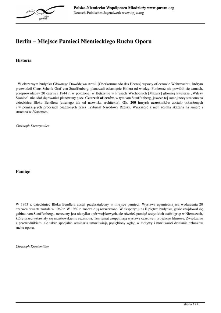 Polsko-Niemiecka Współpraca Młodzieży www.pnwm.org Deutsch-Polnisches Jugendwerk www.dpjw.org Berlin – Miejsce Pamięci Niemieckiego Ruchu Oporu Historia W obszernym budynku Głównego Dowództwa Armii [Oberkommando des Heeres] wysocy oficerowie Wehrmachtu, którym przewodził Claus Schenk Graf von Stauffenberg, planowali odsunięcie Hitlera od władzy. Ponieważ nie powiódł się zamach, przeprowadzony 20 czerwca 1944 r. w położonej w Kętrzynie w Prusach Wschodnich [Mazury] głównej kwaterze „Wilczy Szaniec”, nie udał się również planowany pucz. Czterech oficerów, w tym von Stauffenberg, jeszcze tej samej nocy stracono na dziedzińcu Bloku Bendlera [zwanego tak od nazwiska architekta]. Ok. 200 innych uczestników zostało oskarżonych i w poniżających procesach osądzonych przez Trybunał Narodowy Rzeszy. Większość z nich została skazana na śmierć i stracona w Plötzensee. Christoph Kreutzmüller Pamięć W 1953 r. dziedziniec Bloku Bendlera został przekształcony w miejsce pamięci. Wystawa upamiętniająca wydarzenia 20 czerwca otwarta została w 1969 r. W 1989 r. znacznie ją rozszerzono. W ekspozycji na II piętrze budynku, gdzie znajdował się gabinet von Stauffenberga, uczczony jest nie tylko opór wojskowych, ale również pamięć wszystkich osób i grup w Niemczech, które przeciwstawiały się nazistowskiemu reżimowi. Ten temat uzupełniają wystawy czasowe i projekcje filmowe. Zwiedzanie z przewodnikiem, ale także specjalne seminaria umożliwiają pogłębiony wgląd w motywy i możliwości działania członków ruchu oporu. Christoph Kreutzmüller strona 1 / 4 Polsko-Niemiecka Współpraca Młodzieży www.pnwm.org Deutsch-Polnisches Jugendwerk www.dpjw.org Informacje praktyczne Berlin – Miejsce Pamięci Niemieckiego Ruchu Oporu www.gdw-berlin.de (strona zawiera też link w trzech językach do wystawy grupy studentów niemieckich, francuskich i polskich, która przedstawia m.in. grupę oporu skupioną wokół Helmuta Jamesa hrabiego von Moltke z „Krzyżowej” (tzw. Kreisauer Kreis), jak również działalność polskiej Armii Krajowej. Link również do Miejsca Pamięci Plötzensee i Blindenwerkstatt Otto Weidt). Dojazd: Bus M29 (przystanek "Gedenkstätte Deutscher Widerstand") Bus M48 (przystanek "Kulturforum", 5 minut pieszo) U-Bahnstation Kurfürstenstraße (10 minut) S- und U-Bahnstation Potsdamer Platz (10 minut pieszo) Gedenkstätte Deutscher Widerstand Stauffenbergstr. 13/14 10785 Berlin tel. +49 30 2699 50 00 Fax: +49-30-26 99 50 10 http://www.gdw-berlin.de [email protected] Czynne: poniedziałek-środa, piątek 9.00-18.00; Czwartek: 9.00-20.00; sobota-niedziela i święta 10.00-18.00. Wstęp i opieka pedagogiczna: bezpłatne. strona 2 / 4 Polsko-Niemiecka Współpraca Młodzieży www.pnwm.org Deutsch-Polnisches Jugendwerk www.dpjw.org Galeria Gedenkfeier und Grundsteinlegung des Denkmals für die Opfer des 20. Juli 1944 im Ehrenhof Ehrenhof der GDW Thema 1: Widerstand gegen den Nationalsozialismus Thema 7: Georg Elser und das Attentat vom 8. November 1939 strona 3 / 4 Polsko-Niemiecka Współpraca Młodzieży www.pnwm.org Deutsch-Polnisches Jugendwerk www.dpjw.org Thema 15: Die Weiße Rose strona 4 / 4 Powered by TCPDF (www.tcpdf.org)