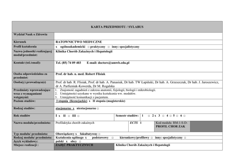 KARTA PRZEDMIOTU / SYLABUS Wydział Nauk o Zdrowiu Kierunek Profil kształcenia Nazwa jednostki realizującej moduł/przedmiot: RATOWNICTWO MEDYCZNE x ogólnoakademicki □ praktyczny □ inny: specjalistyczny Klinika Chorób Zakaźnych i Hepatologii Kontakt (tel./email): Tel. (85) 74 09 403 Osoba odpowiedzialna za przedmiot: Osoba(y) prowadząca(e) Prof. dr hab. n. med. Robert Flisiak Przedmioty wprowadzające wraz z wymaganiami wstępnymi: Poziom studiów: 1. Znajomość zagadnień z zakresu anatomii, fizjologii, biologii i mikrobiologii. 2. Umiejętności uzyskane w wyniku kształcenia ww. modułów. 3. Umiejętność komunikacji z pacjentem. I stopnia (licencjackie) x II stopnia (magisterskie) Rodzaj studiów: stacjonarne x niestacjonarne □ Rok studiów I x II □ III □ Nazwa modułu/przedmiotu: Profilaktyka chorób zakaźnych Typ modułu/ przedmiotu: Rodzaj modułu/ przedmiotu: Język wykładowy: Miejsce realizacji : Obowiązkowy x fakultatywny □ Kształcenia ogólnego x podstawowy □ kierunkowy/profilowy □ inny: specjalistyczny □ polski x obcy □ ZAJĘĆ PRAKTYCZNYCH Klinika Chorób Zakaźnych i Hepatologii E-mail: [email protected] Prof. dr hab. R. Flisiak, Prof. dr hab. A. Panasiuk, Dr hab. TW Łapiński, Dr hab. A. Grzeszczuk, Dr hab. J. Jaroszewicz, dr A. Parfieniuk-Kowerda, Dr M. Rogalska Semestr studiów: 1 ECTS 1 □ 2x 3 □ 4 □ 5 □ 6 □ Kod modułu RM-1-S-DPROFIL CHOR ZAK PRAKTYK ZAWODOWYCH FORMA KSZTAŁCENIA - Liczba Godzin Wykład 10 Seminarium Ćwiczenia Samokształcenie E-learning Zajęcia praktyczne Praktyki zawodowe Inne ……………….. RAZEM Założenia i cel przedmiotu: 5 10 25 Zapoznanie z podstawami profilaktyki, diagnostyki oraz leczenia zakażeń bakteryjnych, wirusowych, pasożytniczych i grzybiczych, z uwzględnieniem zakażeń szpitalnych. Opis przedmiotu: Metody dydaktyczne Wykład, dyskusja, pokaz, obserwacja, ćwiczenia, opis przypadku, samodzielne dochodzenie do wiedzy, analiza literatury. Narzędzia/ środki dydaktyczne Rzutnik multimedialny, plansze, atlasy, sprzęt medyczny, aparatura medyczna. MACIERZ EFEKTÓW KSZTAŁCENIA DLA MODUŁU /PRZEDMIOTU W ODNIESIENIU DO KOERUMKOWYCH EFEKTÓW KSZTAŁCENIA, METOD WERYFIKACJI ZAMIERZONYCH EFEKTÓW KSZTAŁCENIA ORAZ FORMY REALIZACJI ZAJĘĆ. Symbol i numer przedmiotowego efektu kształcenia Student, który zaliczy moduł (przedmiot) wie/umie/potrafi: Odniesienie do kierunkowych efektów kształcenia Metody weryfikacji osiągnięcia zamierzonych efektów kształcenia: Formujące *** WIEDZA Podsumowujące** Forma zajęć dydaktycznych * wpisz symbol IW_15 Definiuje podstawowe pojęcia z zakresu mikrobiologii i parazytologii. OM1_W02 OM1_W03 IW_18 IW_20 Różnicuje epidemiologię zakażeń wirusami, bakteriami oraz zakażeń grzybami i pasożytami z uwzględnieniem geograficznego zasięgu ich występowania. Zna zasady postępowania przeciwepidemicznego. OM1_W01 OM1_W03 OM1_W05 OM1_W03 OM1_W05 IW_21 Zna podstawowe zasady farmakoterapii. OM1_W02 Bieżąca informacja zwrotna Bieżąca informacja zwrotna Bieżąca informacja zwrotna Sprawdzanie wiedzy w trakcie zajęć praktycznych Sprawdzanie wiedzy w trakcie zajęć praktycznych Sprawdzanie wiedzy w trakcie zajęć praktycznych W, ZP Bieżąca informacja zwrotna Sprawdzanie wiedzy w trakcie zajęć praktycznych W, ZP Obserwacja pracy studenta Obserwacja pracy studenta Obserwacja pracy studenta Realizacja zleconego zadania ZP/BN Realizacja zleconego zadania ZP/BN Realizacja zleconego zadania ZP/BN Obserwacja pracy studenta Realizacja zleconego zadania ZP/BN Przedłużona obserwacja przez opiekuna / nauczyciela prowadzącego Przedłużona W, ZP W, ZP W, ZP UMIEJĘTNOŚCI IU_07 IU_10 IU_13 IU_16 Rozpozna zakażenie wirusami, bakteriami oraz zakażeń grzybami i pasożytami z uwzględnieniem geograficznego zasięgu ich występowania Opisuje zmiany w funkcjonowaniu organizmu jako całości w sytuacji zaburzenia jego homeostazy OM1_U01 OM1_U03 OM1_U05 OM1_U03 OM1_U09 Umie zdefiniować podstawowe pojęcia z zakresu mikrobiologii i parazytologii. Wykorzystuje wiedzę na temat funkcjonowania układu pasożyt – żywiciel dla prawidłowej terapii chorób wywołanych przez pasożyty. Zastosuje właściwe do sytuacji postępowanie epidemiologiczne OM1_U04 OM1_U05 OM1_U09 OM1_U12 OM1_U01 OM1_U03 OM1_U05 OM1_U09 KOMPETENCJE SPOŁECZNE / POSTAWY IK_01 IK_02 Ma świadomość poziomu swojej wiedzy i umiejętności, rozumie potrzebę ciągłego dokształcania zawodowego i rozwoju osobistego, dokonuje samooceny własnych kompetencji i doskonali umiejętności, wyznacza kierunki własnego rozwoju i kształcenia Zna zakres swoich kompetencji zawodowych, jest świadomy OM1_K01 OM1_K02 OM1_K03 OM1_K05 OM1_K07 W,ZP własnych ograniczeń, rozpoznaje sytuacje, które wymagają konsultacji z ekspertem/specjalistą/koordynatorem medycznym IK_04 Formułuje opinie dotyczące pacjentów w sposób zapewniający przestrzegania tajemnicy zawodowej OM1_K04 IK_05 Dba o stan własnego zdrowia, sprawność ruchową oraz kondycję fizyczną niezbędną do realizacji zadań zawodowych ratownika medycznego, jest odpowiedzialny za zdrowie własne, rodziny, otoczenia, środowiska, swoją postawą promuje zachowania prozdrowotne Okazuje szacunek pacjentom i troskę o ich dobro, bez względu na różnice światopoglądowe oraz sytuację materialną OM1_K09 IIK_03 Potrafi uzupełniać i doskonalić nabytą wiedzę i umiejętności OM1_K01 IIK_04 Ma świadomość znaczenia zachowywania się w sposób profesjonalny i etyczny OM1_K03 IIK_05 Potrafii brać odpowiedzialność za powierzone mu zadania OM1_K04 IK_06 OM1_K04 obserwacja przez opiekuna / nauczyciela prowadzącego Przedłużona obserwacja przez opiekuna / nauczyciela prowadzącego Przedłużona obserwacja przez opiekuna / nauczyciela prowadzącego Przedłużona obserwacja przez opiekuna / nauczyciela prowadzącego Przedłużona obserwacja przez opiekuna / nauczyciela prowadzącego Przedłużona obserwacja przez opiekuna / nauczyciel