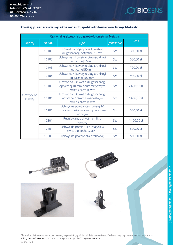 www.biosens.pl telefon: (22) 243 37 87 ul. Górczewska 216 01-460 Warszawa Poniżej przedstawiamy akcesoria do spektrofotometrów firmy Metash: Opcjonalne akcesoria do spektrofotometrów Metash Rodzaj Nr kat. 10101 10102 10103 10104 10105 Uchwyty na kuwety 10106 10201 10301 10401 10501 Opis Uchwyt na pojedyncza kuwetę o długości drogi optycznej 10mm Uchwyt na 4 kuwety o długości drogi optycznej 10 mm Uchwyt na 4 kuwety o długości drogi optycznej 50 mm Uchwyt na 4 kuwety o długości drogi optycznej 100 mm Uchwyt na 8 kuwet o długości drogi optycznej 10 mm z automatycznym zmieniaczem kuwet Uchwyt na 8 kuwet o długości drogi optycznej 10 mm z manualnym zmieniaczem kuwet Uchwyt na pojedyncza kuwetę 10 mm z termostatowaniem płaszczem wodnym Regulowany uchwyt na mikro kuwetę Uchwyt do pomiaru ciał stałych w świetle przechodzącym Uchwyt na pojedyncza probówkę Jednostka Cena Szt. 300,00 zł Szt. 500,00 zł Szt. 700,00 zł Szt. 900,00 zł Szt. 2 600,00 zł Szt. 1 600,00 zł Szt. 500,00 zł Szt. 1 100,00 zł Szt. 500,00 zł Szt. 500,00 zł Dla większości akcesoriów czas dostawy wynosi 4 tygodnie od daty zamówienia. Podane ceny są cenami netto do których należy doliczyć 23% VAT, oraz koszt transportu w wysokości 20,00 PLN netto. Strona 1 z 2 www.biosens.pl telefon: (22) 243 37 87 ul. Górczewska 216 01-460 Warszawa Opcjonalne akcesoria do spektrofotometrów Metash Rodzaj Układy kontrolne Jednostka Cena Nr kat. Opis 20101 Moduł Peltiera 20102 Moduł Sipper (przepływowy) Szt. 3 600,00 zł 20103 Moduł Sipper/Peltier Szt. 4 600,00 zł 20201 Mini drukarka Szt. 900,00 zł Szt. 3 600,00 zł Opcjonalne akcesoria do spektrofotometrów Metash Rodzaj Nr kat. Opis Jednostka 30101 Lampa wolframowa 12V, 20W Szt. Lampa deuterowa A510YXU, do wszystkich spektrofotometrów UV z wyjątkiem UV5100 Lampa deuterowa A510YXU002 do spektrofotometru UV5100 Szt. Lampy 30201 30202 Cena 100,00 zł 1 100,00 zł Szt. 1 100,00 zł Dla większości akcesoriów czas dostawy wynosi 4 tygodnie od daty zamówienia. Podane ceny są cenami netto do których należy doliczyć 23% VAT, oraz koszt transportu w wysokości 20,00 PLN netto. Strona 2 z 2