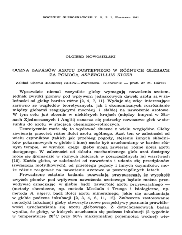 R O C Z N IK I G L E B O Z N A W C Z E T. X , Z . 2, W a r s z a w a 1961 OLGIERD NOWOSIELSKI OCENA ZAPASÓW AZOTU DOSTĘPNEGO W RÓŻNYCH GLEBACH ZA POMOCĄ A S P E R G IL L U S N IG ER Zakład Chemii Rolniczej SGGW—Warszawa. Kierownik — prof. dr M. Górski W praw dzie niem al w szystkie gleby w ym agają naw ożenia azotem , jednak zwyżki plonów pod w pływ em jednakow ych daw ek azotu są w za leżności od gleby bardzo różne [2, 4, 7, 11]. W ydaje się więc interesujące zarów no ze względów teoretycznych, jak i ekonom icznych rozróżnianie m iędzy glebam i reagującym i m ocniej i słabiej na naw ożenie azotowe. W ty m celu już obecnie w niektórych k raja ch (między innym i w S ta nach Zjednoczonych i Anglii) oznacza się potrzeby nawozowe gleb w sto sunku do azotu w stacjach chem iczno-rolniczych. T eoretycznie może się to w ydaw ać słuszne z w ielu względów. Gleby zaw ierają przecież różne ilości azotu ogólnego. Azot te n w zależności od w ielu czynników (takich jak przebieg pogody, stężenie innych składni ków pokarm ow ych w glebie i inne) może być urucham iany w bardzo róż nym tem pie, w w yniku czego gleby m ogą zawierać różne ilości azotu dostępnego. W zależności od składu m echanicznego gleb azot dostępny może się grom adzić w różnych ilościach w poszczególnych jej w arstw ach [10]. K ażda gleba, w zależności od naw ożenia i udania się przedplonów (zwłaszcza m otylkow ych), od przebiegu pogody i innych czynników , m o że różnie reagow ać na naw ożenie azotowe w poszczególnych latach. Prow adzone ostatnio badania pozw alają przypuszczać, że wysokość zwyżek plonów pod w pływ em naw ożenia azotowego będzie m ożna prze widywać oznaczając w glebie bądź zaw artość azotu przysw ajalnego — (m etody chemiczne, np. m etoda M oskala i Truoga i biologiczne, np. m etoda A. niger), bądź ilości azotu m ineralnego, jakie się urucham iają w glebie podczas inkubacji [2, 3, 4, 6 , 11, 12]. Zwłaszcza zastosow anie m etodyki inkubacji gleby stw orzyło now e perspektyw y poznania praw idło wości urucham iania się azotu glebowego. Z dotychczasow ych badań w ynika, że gleby, w których urucham ia się podczas inkubacji (2 tygodnie w tem peraturze 26°C przy 50% m aksym alnej pojem ności wodnej) w ię 424 O. Nowosielski cej niż 5— 6 mg N— NO 3/IOO g, mogą w ym agać naw ożenia azotem raczej w słabym stopniu. Trudnością, na jaką napotyka się w tych badaniach, jest ustalenie term in u pobierania próbek glebow ych oraz sposobu ich przechow yw ania do chw ili oznaczenia. Dotychczasowe w yniki prow adzonych na te n tem at badań są częściowo sprzeczne [1, 6 , 9, 12]. Pew ne zastrzeżenie w stosow anej dotychczas m etodyce wzbudza fakt, że m iernikiem ilości azotu dostępnego jest tylko azot m ineralny [8 ]. D la tego w poprzedniej pracy azot dostępny zaczęto oznaczać za pomocą grzyba A. niger. Oznacza się nim nie tylko azot m ineralny, lecz także azot związków organicznych ulegających łatw o m ineralizacji, takich jak mocznik, am inokw asy czy am idy. W m etodzie tej unika się jednocześnie sporządzania wyciągów glebowych 1. BADANIA WŁASNE Celem tej pracy jest ocena zapasów azotu dostępnego w różnych gle bach za pomocą A. niger. Szczególną uw agę zwrócono na różnice m iędzy glebam i zarówno pod względem zaw artości azotu dostępnego dla A.niger w nie inkubow anych i inkubow anych próbkach z w arstw y w ierzchniej, jak i pod względem zaw artości azotu dostępnego dla A. niger w próbkach z w arstw głębszych. W badaniach w stępnych spraw dzono możliwość rozróżniania za po mocą A. niger gleb naw ożonych i nie naw ożonych azotem oraz w pływ term in u pobrania prób glebow ych na w yniki oznaczeń azotu dostępnego. METODYKA I G-LEBY Azot dostępny dla A . niger w próbkach pow ietrznie suchych inkubo w anych oznaczono w sposób opisany w poprzedniej pracy [8 ]. Do ozna czeń stosowano 25-gram owe odważki gleby inkubując je w tem p eratu rze 35 °C w ciągu 1 tygodnia przy w ilgotności gleby w ynoszącej około 50% m aksym alnej pojem ności. Próbki 78 różnych gleb przechow yw ano w ciągu S lat w w arunkach pokojowych w stanie pow ietrznie suchym . W ciągu tego czasu m ogły one ulec pew nym zm ianom 2. 1 Podobne zalety ma metoda C. elegans [7]. Metoda A. niger ma jednak tę wyższość, że jest ilościowa i prostsza w wykonaniu. 2 Część tych próbek wraz z wynikami oznaczeń azotu ogólnego otrzymałem od Kolegi dra J. Siuty, za co jestem Mu bardzo zobowiązany. Oznaczanie azotu w glebie metodą A. niger 425 P róbki z różnie nawożonej od 37 lat gleby bielicowej lekkiej pola do świadczalnego Z akładu Chem ii Rolniczej SGGW w Skierniew icach pobrano raz w czerw cu (w ciepłym , dżdżystym okresie intensyw nego w zrostu roślin) i dru g i raz w końcu w rześnia (w suchym zim nym okresie) 1959 r. Do oznaczeń stosowano próbki pow ietrznie suche. WYNIKI ZA W AR TO ŚĆ AZOTU DO STĘPNEG O I U R U C H A M IA JĄ C E G O S IĘ W ZALEŻNO ŚCI O D T E R M IN U P O B R A N IA P R Ó B K I G L E B O W E J Ilości azotu dostępnego w próbkach pobranych w czerw cu są inne (większe w glebach nawożonych niż nie nawożonych azotem oraz b a r dziej proporcjonalne do ilości azotu urucham iającego się i do plonów roślin) niż w próbkach pobranych jesienią (tabl. 4). N atom iast ilości azotu urucham iającego się w w yniku inkubacji w próbkach z obu term inów są niem al jednakow e. P ró b k i pobrane jesienią różniły się nieznacznie pod względem za w artości azotu dostępnego, m imo że pochodziły z poletek od 37 lat różnie nawożonych azotem i obornikiem (tabl. 4). Różniły się natom iast bardzo znacznie pod względem zaw artości azotu urucham iającego się w w yniku inkubacji. Zaw artość tego azotu jest proporcjonalna do daw ek obornika i jest blisko dwa razy większa w próbkach z poletek nawożonych niż 