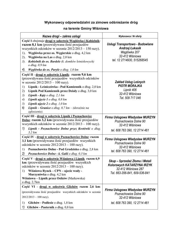 Wykonawcy odpowiedzialni za zimowe odśnieżanie dróg na terenie Gminy Wiśniowa Nazwa drogi – zakres usługi Wykonawca / Nr oferty Część I obejmuje drogi w sołectwie Węglówka i Kobielnik: razem 8,1 km (przewidywana ilość przejazdów wszystkich odcinków w sezonie 2012/2013 – 150 razy). 1). Węglówka przez os. Węgierskie o dług. 4,2 km 2). Węglówka na Las o dług. 2,0 km 3). Kobielnik do os. Bardele (k. domków letniskowych) o dług. 0,9 km 4). Węglówka do os. Paryle o dług. 1,0 km Usługi Transportowo - Budowlane Andrzej Łukasik Węglówka 207 32-412 Wiśniowa tel. 12 2714930, 515268545 Część II - drogi w sołectwie Lipnik: razem 9,6 km (przewidywana ilość przejazdów wszystkich odcinków w sezonie 2012/2013 – 100 razy). 1) 2) 3) 4) 5) 6) Lipnik - Leśniczówka - Pod Kamiennik o dług. 2,0 km Lipnik Pod Kamiennik przez Działy o dług. 3,0 km Lipnik - Kąty o dług. 2,1 km Lipnik ujęcie 1 o dług. 0,8 km Lipnik ujęcie 2 o dług. 1,0 km Lipnik – Granice o dług. 0,7 km – (doraźnie na zgłoszenie). Część III - drogi w sołectwie Lipnik i Poznachowice Dolne: razem 3,2 km (przewidywana ilość przejazdów wszystkich odcinków w sezonie 2012/2013 – 100 razy). 1) Lipnik - Poznachowice Dolne przez Kretówki o dług. 3,2 km Część IV - drogi w sołectwie Poznachowice Dolne: razem 3,1 km (przewidywana ilość przejazdów wszystkich odcinków w sezonie 2012/2013 – 100 razy). 1) 2) Poznachowice Dolne - Pod Grodzisko o dług. 2,8 km Poznachowice Dolne - k. Galii o dług. 0,3 km Część V - drogi w sołectwie Wiśniowa i Lipnik razem 6,9 km: (przewidywana ilość przejazdów wszystkich odcinków w sezonie 2012/2013 – 100 razy). 1) Wiśniowa Rynek – CPN – ujecie wody Murzynówka o dług. 4,2 km Wiśniowa – Lipnik przez Osików (Markowska) o dług. 2,7km Część VI - drogi w sołectwie Glichów razem 2,6 km: (przewidywana ilość przejazdów wszystkich odcinków w sezonie 2012/2013 – 100 razy). 1) Glichów - Podlesie o dług. 1,8 km 1) Glichów - Pasternik o dług. 0,8 km Zakład Usług Leśnych PIOTR MORAJKA Lipnik 406 32-412 Wiśniowa Tel. 509 717 046 Firma Usługowa Władysław MURZYN Poznachowice Dolne 90 32-412 Wiśniowa tel. 608 763 390, 12 2714 461 Firma Usługowa Władysław MURZYN Poznachowice Dolne 90 32-412 Wiśniowa tel. 608 763 390, 12 2714 461 Skup – Sprzedaż Złomu i Metali Kolorowych KATARZYNA IRZYK 32-412 Wiśniowa 287 Tel. 663-356-841, 609-536-841 Firma Usługowa Władysław MURZYN Poznachowice Dolne 90 32-412 Wiśniowa tel. 608 763 390, 12 2714 461 Część VII - drogi w sołectwie Wierzbanowa i Wiśniowa razem 2.43 km: (przewidywana ilość przejazdów wszystkich odcinków w sezonie 2012/2013 – 100 razy). 1) Wierzbanowa – Podjaworzyce o dług. 1,8 km Pałącki o dług. 0,63 km – (doraźnie na zgłoszenie). Część VIII – parkingi (przewidywana ilość odśnieżania obu parkingów w sezonie 2012/2013 – 25 razy). 1) Dwa parkingi przy OSP w Lipniku Firma Transportowo - Drogowa Andrzej Rokosz Wierzbanowa 141 32-412 Wiśniowa 697 886 409, 601 057 098 Zakład Usług Leśnych PIOTR MORAJKA Lipnik 406 32-412 Wiśniowa Tel. 509 717 046 Ze strony Gminy Wiśniowa osobą do kontaktów w sprawie odśnieżania dróg gminnych jest Pani Maria Turecka nr kontaktowy 691-481-712, 12 2714 086 Kierownik Referatu BRGK w Urzędzie Gminy Wiśniowa.