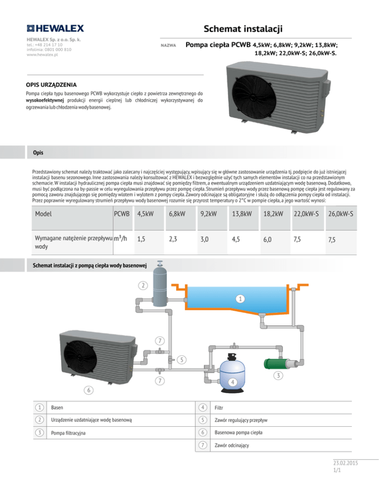 Schemat instalacji HEWALEX Sp. z o.o. Sp. k. tel.: +48 214 17 10 infolinia: 0801 000 810 www.hewalex.pl Pompa ciepła PCWB 4,5kW; 6,8kW; 9,2kW; 13,8kW; NAZWA 18,2kW; 22,0kW-S; 26,0kW-S. OPIS URZĄDZENIA Pompa ciepła typu basenowego PCWB wykorzystuje ciepło z powietrza zewnętrznego do wysokoefektywnej produkcji energii cieplnej lub chłodniczej wykorzystywanej do ogrzewania lub chłodzenia wody basenowej. Opis Przedstawiony schemat należy traktować jako zalecany i najczęściej występujący, wpisujący się w główne zastosowanie urządzenia tj. podpięcie do już istniejącej instalacji basenu sezonowego. Inne zastosowania należy konsultować z HEWALEX i bezwzględnie użyć tych samych elementów instalacji co na przedstawionym schemacie. W instalacji hydraulicznej pompa ciepła musi znajdować się pomiędzy filtrem, a ewentualnym urządzeniem uzdatniającym wodę basenową. Dodatkowo, musi być podłączona na by-passie w celu wyregulowania przepływu przez pompę ciepła. Strumień przepływu wody przez basenową pompę ciepła jest regulowany za pomocą zaworu znajdującego się pomiędzy wlotem i wylotem z pompy ciepła. Zawory odcinające są obligatoryjne i służą do odłączenia pompy ciepła od instalacji. Przez poprawnie wyregulowany strumień przepływu wody basenowej rozumie się przyrost temperatury o 2°C w pompie ciepła, a jego wartość wynosi: Model PCWB Wymagane natężenie przepływu m³/h wody 4,5kW 6,8kW 9,2kW 13,8kW 18,2kW 22,0kW-S 26,0kW-S 1,5 2,3 3,0 4,5 6,0 7,5 7,5 Schemat instalacji z pompą ciepła wody basenowej 2 1 7 5 3 7 4 6 1 Basen 4 Filtr 2 Urządzenie uzdatniające wodę basenową 5 Zawór regulujący przepływ 3 Pompa filtracyjna 6 Basenowa pompa ciepła 7 Zawór odcinający 23.02.2015 1/1