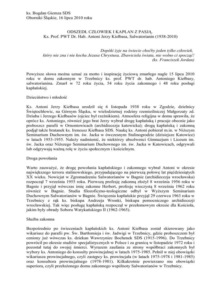 ks. Bogdan Giemza SDS Oborniki Śląskie, 16 lipca 2010 roku ODSZEDŁ CZŁOWIEK I KAPŁAN Z PASJĄ. Ks. Prof. PWT Dr. Hab. Antoni Jerzy Kiełbasa, Salwatorianin (1938-2010) Dopóki żyje na świecie choćby jeden tylko człowiek, który nie zna i nie kocha Jezusa Chrystusa, Zbawiciela świata, nie wolno ci spocząć! (ks. Franciszek Jordan) Powyższe słowa można uznać za motto i inspirację życiową zmarłego nagle 15 lipca 2010 roku w domu zakonnym w Trzebnicy ks. prof. PWT dr. hab. Antoniego Kiełbasy, salwatorianina. Zmarł w 72 roku życia, 54 roku życia zakonnego i 48 roku posługi kapłańskiej. Dzieciństwo i młodość Ks. Antoni Jerzy Kiełbasa urodził się 6 listopada 1938 roku w Zgodzie, dzielnicy Świętochłowic, na Górnym Śląsku, w wielodzietnej rodziny rzemieślniczej Małgorzaty zd. Dziuba i Jerzego Kiełbasów (ojciec był rzeźnikiem). Atmosfera religijna w domu sprawiła, że oprócz ks. Antoniego, również jego brat Jerzy wybrał drogę kapłańską i pracuje obecnie jako proboszcz parafii w Ornontowicach (archidiecezja katowicka); drogą kapłańską i zakonną podjął także bratanek ks. Ireneusz Kiełbasa SDS. Naukę ks. Antoni pobierał m.in. w Niższym Seminarium Duchownym im. św. Jacka w ówczesnym Stalinogrodzie (dzisiejsze Katowice) w latach 1953-1955. Należy nadmienić, że niektórzy absolwenci Gimnazjum i Liceum im. św. Jacka oraz Niższego Seminarium Duchownego im. św. Jacka w Katowicach, odgrywali lub odgrywają ważną rolę w życiu społecznym i kościelnym. Droga powołania Warto zauważyć, że drogę powołania kapłańskiego i zakonnego wybrał Antoni w okresie największego terroru stalinowskiego, przypadającego na pierwszą połowę lat pięćdziesiątych XX wieku. Nowicjat w Zgromadzeniu Salwatorianów w Bagnie (archidiecezja wrocławska) rozpoczął 7 września 1955 roku. Pierwszą profesję zakonną złożył 8 września 1956 roku w Bagnie i przyjął wówczas imię zakonne Herbert, profesję wieczystą 8 września 1962 roku również w Bagnie. Studia filozoficzno-teologiczne odbył w Wyższym Seminarium Duchownym Salwatorianów w Bagnie. Święcenia kapłańskie przyjął 29 czerwca 1963 roku w Trzebnicy z rąk ks. biskupa Andrzeja Wronki, biskupa pomocniczego archidiecezji wrocławskiej. Tak więc posługę kapłańską rozpoczął w przełomowym okresie dla Kościoła, jakim były obrady Soboru Watykańskiego II (1962-1965). Służba zakonna Bezpośrednio po świeceniach kapłańskich ks. Antoni Kiełbasa został skierowany jako wikariusz do parafii pw. Św. Bartłomieja i św. Jadwigi w Trzebnicy, gdzie proboszczem był ceniony już wówczas ks. dziekan Wawrzyniec Bochenek SDS (1915-1996). Do Trzebnicy powrócił po okresie studiów specjalistycznych w Polsce i za granicą w listopadzie 1972 roku i pozostał tutaj do swojej śmierci. Wyrazem zaufania ze strony współbraci zakonnych był wybory ks. Antoniego do konsulty prowincjalnej w latach 1975-1985. Pełnił w niej obowiązki wikariusza prowincjalnego, czyli zastępcy ks. prowincjała (w latach 1975-1978 i 1981-1985) oraz konsultora prowincjalnego (1978-1981). Kilkakrotnie powierzano mu obowiązki superiora, czyli przełożonego domu zakonnego wspólnoty Salwatorianów w Trzebnicy. Ks. Kiełbasa aktywnie uczestniczył w pracy Zgromadzenia Salwatorianów na szczeblu międzynarodowym. Jako delegat Polskiej Prowincji Salwatorianów sześciokrotnie był wybieramy do udziału w obradach Kapituły Generalnej Zgromadzenia (1975, 1981, 1987, 1993, 1999, 2006). Należał do współzałożycieli Międzynarodowej Komisji Historycznej Salwatorianów, która została powołana do istnienia w 1971 roku. Był jej członkiem do samej śmierci. Celem Komisji są studia nad historią Założyciela, Sługi Bożego ks. Franciszka Jordana (1848-1918) i Zgromadzenia Salwatorianów. Owocem pracy Komisji są m.in. wydawane regularnie „Documenta et Studia Salvatoriana”. Na przestrzeni tych lat czynnie włączał się w organizacje różnych jubileuszy zakonnych, zarówno w Polsce, jak również w skali międzynarodowej. Droga naukowa Studia specjalistyczne z zakresu historii Kościoła rozpoczął w 1964 roku na Wydziale Teologicznym Katolickiego Uniwersytetu Lubelskiego. W 1966 roku uzyskał licencjat z zakresu nauk historycznych, w 1968 roku obronił pracę magisterską nt. „Początki Salwatorianów na ziemiach polskich 1900-1908”, pisanej pod kierunkiem ks. prof. Mieczysława Żywczyńskiego. W latach 1968-1970 odbył kurs doktorancki na KUL. W latach 1970-1972 pracował w archiwum generalnym Salwatorianów w Rzymie, studiował jako wolontariusz w Rzymie, prowadząc równocześnie kwerendę w archiwach kościelnych w Europie, szczególnie salwatoriańskich. Po powrocie do kraju zamieszkał w Trzebnicy i od listopada 1972 roku rozpoczął wykłady w Wyższym Seminarium Duchownym Salwatorianów z historii Kościoła, patrologii i historii Zgromadzenia Salwatorianów. W 1992 roku na Papieskim Wydziale Teologicznym we Wrocławiu obronił pracę doktorską nt. „Ksiądz Franciszek Maria od Krzyża Jordan (1848 - 1918)”. Promotorem był ks. prof. Józef Swastek. W październiku 1993 roku został mianowany adiunktem tegoż Wydziału i rozpoczął zajęcia dydaktyczne, podejmując wykłady z historii Kościoła Powszechnego i dziejów Kościoła na Śląsku. W 1998 roku zdał pomyślnie kolokwium habilitacyjne na podstawie rozprawy „Salwatorianie z ziem polskich w latach 1881-1903”. Następnie ks. Kiełbasa został powołany na stanowisko docenta na Papieskim Wydziale Teologicznym we Wrocławiu, w 2001 roku otrzymał tytuł profesora nadzwyczajnego tegoż Wydziału. Do śmierci był kierownikiem katedry Historii Kościoła na Śląsku. Był cenionym promotorem wielu prac magisterskich i licencjackich oraz doktorskich. Nadto był recenzentem prac magisterskich, doktorskich i habilitacyjnych. Kierunki badań naukowych, sympozja i publikacje W badaniach naukowych ks. Profesora można wym