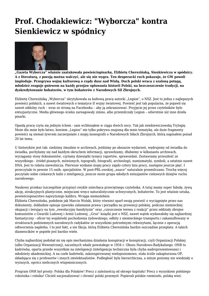Prof. Chodakiewicz: "Wyborcza" kontra Sienkiewicz w spódnicy „Gazeta Wyborcza” właśnie zaatakowała powieściopisarkę, Elżbietę Cherezińską, Sienkiewicza w spódnicy. A z literaturą, z poezją można walczyć, ale się nie wygra. Ten desperacki ruch pokazuje, że GW powoli imploduje. Przegrywa wojnę kulturową o rządy dusz nad Wisłą. Duch polski wraca z szaloną potęgą, młodzież reaguje gniewem na każdy przejaw opluwania historii Polski, na bezczeszczenie tradycji, na dyskredytowanie bohaterów, w tym bohaterów z Narodowych Sił Zbrojnych. Elżbietę Cherezińską „Wyborcza” skrytykowała za kultową pracę autorki „Legion”, o NSZ. Jest to jedna z najlepszych powieści polskich, a nawet światowych o tematyce II wojny światowej. Powieść jest tak popularna, że pojawił się nawet oddolny ruch – wraz ze stroną na Facebooku – aby ją zekranizować. Przyjęcie jej przez czytelników było entuzjastyczne. Media głównego ścieku zareagowały zimno, albo przemilczały Legion – odwrotnie niż inne dzieła pisarki. Opasłą pracę czyta się jednym tchem - sam wchłonąłem w ciągu dwóch nocy. Tak jak sienkiewiczowską Trylogię. Może dla mnie było łatwo, bowiem „Legion” nie tylko pokrywa znajomą dla mnie tematykę, ale duże fragmenty powieści są niemal żywcem zaczerpnięte z mojej monografii o Narodowych Siłach Zbrojnych, którą napisałem ponad 20 lat temu. U historyków jest tak: siedzimy żmudnie w archiwach, jeździmy po obszarze wydarzeń, wędrujemy od świadka do świadka, pochylamy się nad każdym okruchem informacji, sprawdzamy, dłubiemy w kilkunastu archiwach, wyciągamy stosy dokumentów, czytamy dziesiątki tysięcy raportów, sprawozdań. Zestawiamy przeszłość ze wszystkiego - źródeł pisanych, mówionych, topografii, fotografii, archeologii, numizmatyki, symboli, a ostatnio nawet DNA. Jest to robota niewolnicza. Pierwsze wydanie mojej pracy zajęło cztery lata pracy, następne jeszcze pięć. I przeczytało to pewnie 15 osób, specjalistów. W post-PRL-owskiej „nauce” naturalnie przemilczano. Trochę więcej poczytało sobie ciekawych ludzi z inteligencji, jeszcze może grupa młodych entuzjastów ciekawych dziejów ruchu narodowego. Naukowy przekaz (szczególnie przypisy) zwykle zniechęca przeciętnego czytelnika. A tutaj mamy super fabułę, żywą akcję, atrakcyjnych plastycznie, miejscami wręcz naturalistycznie uchwyconych, bohaterów. To jest właśnie sztuka, powieściopisarstwo najwyższego kalibru. Wciąga niemożebnie. Elżbieta Cherezińska, podobnie jak Marcin Wolski, który również oparł swoją powieść o wyciągnięte przez nas dokumenty, dokładnie opisuje zjawisko załamania prawa i porządku na prowincji polskiej, podczas niemieckiej okupacji i żerujący na tym „rewolucyjny bandytyzm” oraz „czyszczenie terenu z reakcji” przez oddziały zbrojne komunistów z Gwardii Ludowej i Armii Ludowej. „Gros” książki jest o NSZ, nawet wątek wydawałoby się najbardziej fantastyczny - oficer tej wojskówki pochodzenia żydowskiego, odbity z niemieckiego transportu i zakamuflowany w strukturach podziemnych narodowych radykałów ze wszystkimi potrzebnymi rekwizytami, łącznie z operacją odtworzenia napletka. I to jest fakt, a nie fikcja, którą Elżbieta Cherezińska bardzo oszczędnie przeplata. A takich diamencików w popiele jest bardzo wiele. Chyba najbardziej podobał mi się opis mechanizmu działania konspiracji w konspiracji, czyli Organizacji Polskiej (albo Organizacji Wewnętrznej), naczelnych władz powstałego w 1934 r. Obozu Narodowo-Radykalnego. ONR to kadrówka, oparta przede wszystkim na inteligencji (inteligencja techniczna była chyba nadreprezentowana) i młodzieży akademickiej. A na czele kadrówki, zakonspirowanej wielopoziomowo, stała ściśle zakapturzona OP, składająca się z profesorów i innych intelektualistów. Podległość była hierarchiczna, a niższe poziomy nie wiedziały o wyższych, oprócz nielicznych wtajemniczonych. Program ONR był prosty: Polska dla Polaków! Precz z zależnością od obcego kapitału! Precz z wyzyskiem polskiego robotnika i rolnika! Chcieli nacjonalizować i chronić polski przemysł. Popierali polskie rzemiosło, polską wieś. Uważali, że mniejszości narodowe powinny się podporządkować żywiołowi polskiemu, zasymilować – oprócz większości Żydów, których ONR-owcy niestety mieli zamiar zmusić do emigracji. Polaków żydowskiego pokolenia – o ile ci byli patriotami, a szczególnie narodowcami – uznawali po prostu za Polaków. Nie ma więc mowy o rasizmie. W czasie wojny to środowisko ONR stworzyło podziemny Związek Jaszczurczy, który wszedł w skład NSZ. No, i w całej skomplikowanej krasie objawia się tytułowy Legion: Brygada Świętokrzyska NSZ, która walczyła z Niemcami i Sowietami oraz tubylczą komuną. Gdy front wschodni sypnął się, dowództwo Brygady improwizowało. Po walkach z Niemcami i ostrzale Sowietów, jednostka wycofała się na Zachód. Początkowe umowy lokalne z Wehrmachtem, które posłużyły wstępnie za przepustkę, zostały potem zastąpione innymi formami współpracy. Ponieważ Brygada odmówiła walki po stronie niemieckiej, poszła na ustępstwa i zgodziła się wysłać spadochroniarzy do Polski oraz patroli pieszych. Żadne niemieckie rozkazy emisariuszy nie obowiązywały. Dlaczego Niemcy na to się zgodzili? Oficerowie wywiadu padającej III Rzeszy, po pierwsze, kontynuowali swoje działania instytucjonalne, szczycąc się rzekomymi sukcesami zza biurka, a w tym polskimi spadochroniarzami (i tym sposobem unikali zesłania na front wschodni); po drugie - tworzyli alibi u anglosaskich zwycięzców, że polskiej jednostki nie zniszczyli, a ocalili (a na dodatek pozwolili wyciągać jej ludzi z obozów koncentracyjnych, w tym i żonę premiera Mikołajczyka); a po trzecie – tworzyli legendę potężnej siatki współpracowników w sowieckiej zonie okupacyjnej. St