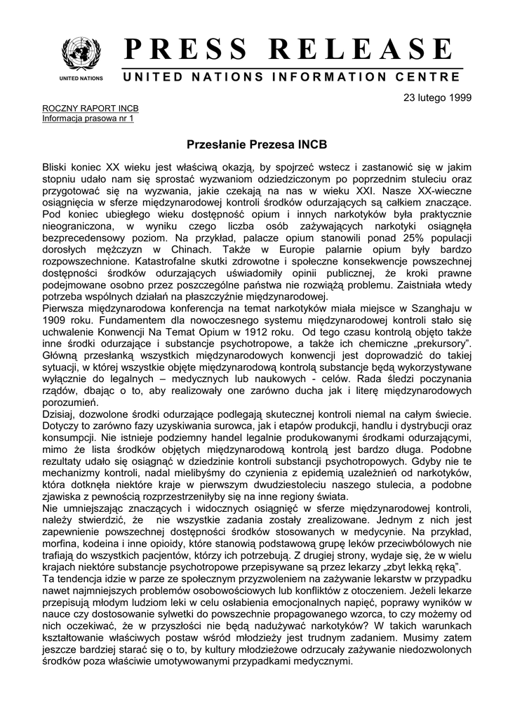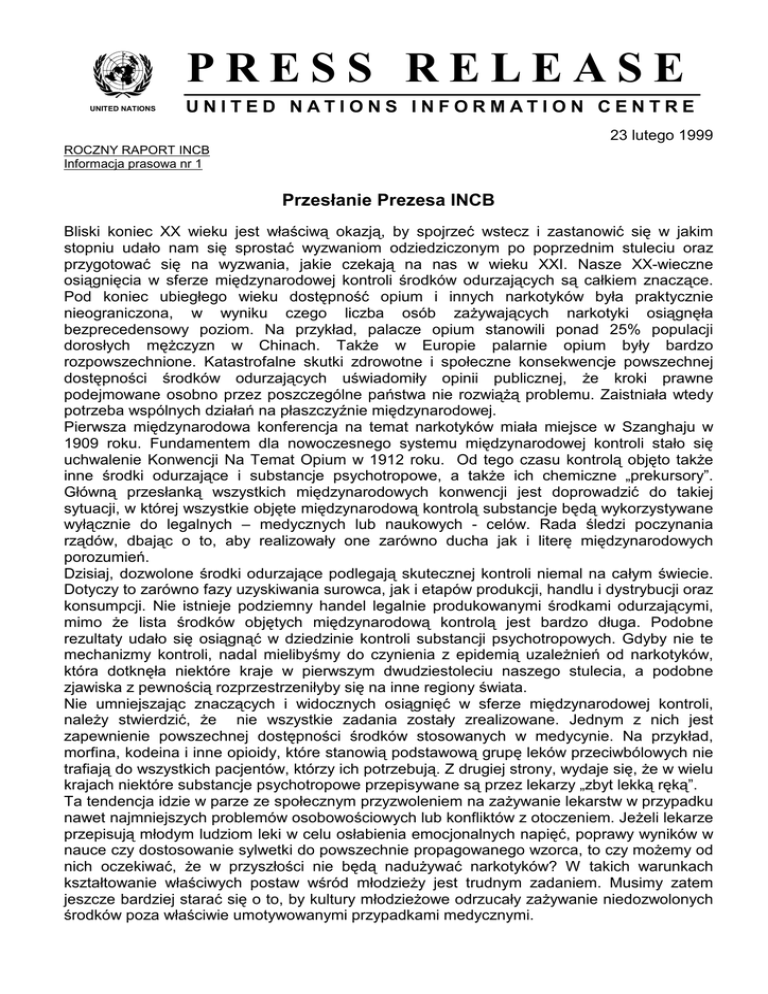 PRESS RELEASE UNITED NATIONS UNITED NATIONS INFORMATION CENTRE 23 lutego 1999 ROCZNY RAPORT INCB Informacja prasowa nr 1 Przesłanie Prezesa INCB Bliski koniec XX wieku jest właściwą okazją, by spojrzeć wstecz i zastanowić się w jakim stopniu udało nam się sprostać wyzwaniom odziedziczonym po poprzednim stuleciu oraz przygotować się na wyzwania, jakie czekają na nas w wieku XXI. Nasze XX-wieczne osiągnięcia w sferze międzynarodowej kontroli środków odurzających są całkiem znaczące. Pod koniec ubiegłego wieku dostępność opium i innych narkotyków była praktycznie nieograniczona, w wyniku czego liczba osób zażywających narkotyki osiągnęła bezprecedensowy poziom. Na przykład, palacze opium stanowili ponad 25% populacji dorosłych mężczyzn w Chinach. Także w Europie palarnie opium były bardzo rozpowszechnione. Katastrofalne skutki zdrowotne i społeczne konsekwencje powszechnej dostępności środków odurzających uświadomiły opinii publicznej, że kroki prawne podejmowane osobno przez poszczególne państwa nie rozwiążą problemu. Zaistniała wtedy potrzeba wspólnych działań na płaszczyźnie międzynarodowej. Pierwsza międzynarodowa konferencja na temat narkotyków miała miejsce w Szanghaju w 1909 roku. Fundamentem dla nowoczesnego systemu międzynarodowej kontroli stało się uchwalenie Konwencji Na Temat Opium w 1912 roku. Od tego czasu kontrolą objęto także inne środki odurzające i substancje psychotropowe, a także ich chemiczne „prekursory”. Główną przesłanką wszystkich międzynarodowych konwencji jest doprowadzić do takiej sytuacji, w której wszystkie objęte międzynarodową kontrolą substancje będą wykorzystywane wyłącznie do legalnych – medycznych lub naukowych - celów. Rada śledzi poczynania rządów, dbając o to, aby realizowały one zarówno ducha jak i literę międzynarodowych porozumień. Dzisiaj, dozwolone środki odurzające podlegają skutecznej kontroli niemal na całym świecie. Dotyczy to zarówno fazy uzyskiwania surowca, jak i etapów produkcji, handlu i dystrybucji oraz konsumpcji. Nie istnieje podziemny handel legalnie produkowanymi środkami odurzającymi, mimo że lista środków objętych międzynarodową kontrolą jest bardzo długa. Podobne rezultaty udało się osiągnąć w dziedzinie kontroli substancji psychotropowych. Gdyby nie te mechanizmy kontroli, nadal mielibyśmy do czynienia z epidemią uzależnień od narkotyków, która dotknęła niektóre kraje w pierwszym dwudziestoleciu naszego stulecia, a podobne zjawiska z pewnością rozprzestrzeniłyby się na inne regiony świata. Nie umniejszając znaczących i widocznych osiągnięć w sferze międzynarodowej kontroli, należy stwierdzić, że nie wszystkie zadania zostały zrealizowane. Jednym z nich jest zapewnienie powszechnej dostępności środków stosowanych w medycynie. Na przykład, morfina, kodeina i inne opioidy, które stanowią podstawową grupę leków przeciwbólowych nie trafiają do wszystkich pacjentów, którzy ich potrzebują. Z drugiej strony, wydaje się, że w wielu krajach niektóre substancje psychotropowe przepisywane są przez lekarzy „zbyt lekką ręką”. Ta tendencja idzie w parze ze społecznym przyzwoleniem na zażywanie lekarstw w przypadku nawet najmniejszych problemów osobowościowych lub konfliktów z otoczeniem. Jeżeli lekarze przepisują młodym ludziom leki w celu osłabienia emocjonalnych napięć, poprawy wyników w nauce czy dostosowanie sylwetki do powszechnie propagowanego wzorca, to czy możemy od nich oczekiwać, że w przyszłości nie będą nadużywać narkotyków? W takich warunkach kształtowanie właściwych postaw wśród młodzieży jest trudnym zadaniem. Musimy zatem jeszcze bardziej starać się o to, by kultury młodzieżowe odrzucały zażywanie niedozwolonych środków poza właściwie umotywowanymi przypadkami medycznymi. Musimy zakończyć coraz bardziej upolityczniony spór wokół konopi indyjskich, który wpływa negatywnie na stosunek do nadużywania narkotyków, zwłaszcza wśród młodzieży. Rada z przykrością odnotowuje fakt wykorzystywania potencjalnych leczniczych właściwości konopi do propagowania powszechnej dostępności tej używki. Popieramy poważne naukowe badania nad domniemanymi terapeutycznymi właściwościami tej rośliny, ale przestrzegamy przed próbami wykorzystywania wyników tych badań do celów legalizacji konopi. Nawet w razie udowodnienia ich przydatności do celów medycznych, pozostaną one takim samym środkiem jak większość substancji objętych międzynarodową kontrolą. Konopie wypisywane na receptę będą nadal podlegać wszelkim formom kontroli przewidzianym w międzynarodowych konwencjach. W czerwcu 1998 roku, na specjalnej sesji Zgromadzenia Ogólnego poświęconej problemom handlu narkotykami na świecie byłem świadkiem deklaracji składanych przez szefów rządów na temat woli zaostrzenia środków służących walce z nadużywaniem narkotyków i nielegalnym handlem. Polityczna Deklaracja i Plany Działań, będące pokłosiem specjalnej sesji powinny mieć globalne i powszechne zastosowanie, wynikają ze zobowiązań podjętych przez czynniki najwyższego szczebla. Decydujące znaczenie będzie mieć realizacja zaleceń sformułowanych na sesji. W Deklaracji Politycznej stwierdzono, że „zobowiązaniom muszą towarzyszyć działania i środki potrzebne do osiągnięcia znaczących i mierzalnych rezultatów”. To zobowiązanie należy teraz przełożyć na działania i konkretne wyniki. Rządy mają więc szansę, by w pełni i sumiennie zrealizować plany działań i tym samym udowodnić, że poważnie traktują międzynarodowe zobowiązania. Rada będzie śledzić te działania w ramach mandatu wynikającego z międzynarodowych porozumień. Przyjęcie Deklaracji W Sprawie Głównych Zasad Redukcji Popytu jest ważnym krokiem naprzód. Deklaracja jest w wielu punktach zbieżna z polityką Rady, co podkreśl