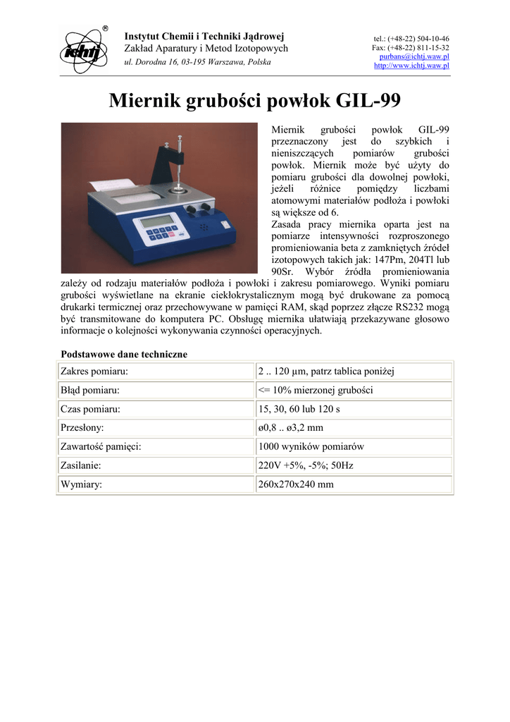 Miernik grubości powłok GIL-99 - Instytut Chemii i Techniki Jądrowej