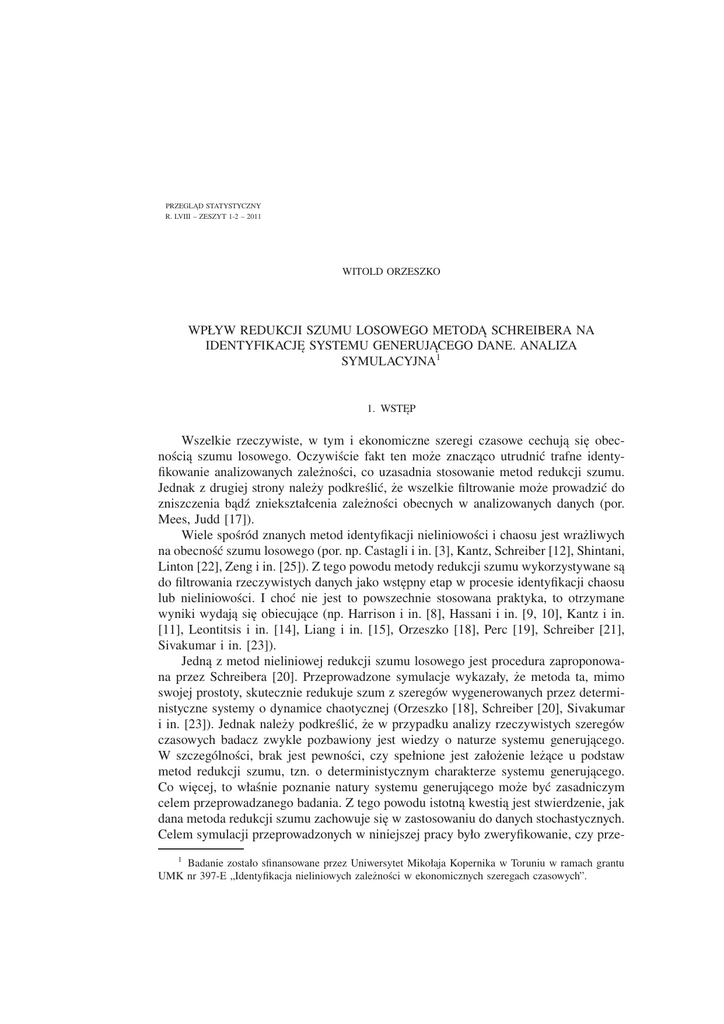 PRZEGLĄD STATYSTYCZNY R. LVIII – ZESZYT 1-2 – 2011 WITOLD ORZESZKO WPŁYW REDUKCJI SZUMU LOSOWEGO METODĄ SCHREIBERA NA IDENTYFIKACJĘ SYSTEMU GENERUJĄCEGO DANE. ANALIZA SYMULACYJNA1 1. WSTĘP Wszelkie rzeczywiste, w tym i ekonomiczne szeregi czasowe cechują się obecnością szumu losowego. Oczywiście fakt ten może znacząco utrudnić trafne identyfikowanie analizowanych zależności, co uzasadnia stosowanie metod redukcji szumu. Jednak z drugiej strony należy podkreślić, że wszelkie filtrowanie może prowadzić do zniszczenia bądź zniekształcenia zależności obecnych w analizowanych danych (por. Mees, Judd [17]). Wiele spośród znanych metod identyfikacji nieliniowości i chaosu jest wrażliwych na obecność szumu losowego (por. np. Castagli i in. [3], Kantz, Schreiber [12], Shintani, Linton [22], Zeng i in. [25]). Z tego powodu metody redukcji szumu wykorzystywane są do filtrowania rzeczywistych danych jako wstępny etap w procesie identyfikacji chaosu lub nieliniowości. I choć nie jest to powszechnie stosowana praktyka, to otrzymane wyniki wydają się obiecujące (np. Harrison i in. [8], Hassani i in. [9, 10], Kantz i in. [11], Leontitsis i in. [14], Liang i in. [15], Orzeszko [18], Perc [19], Schreiber [21], Sivakumar i in. [23]). Jedną z metod nieliniowej redukcji szumu losowego jest procedura zaproponowana przez Schreibera [20]. Przeprowadzone symulacje wykazały, że metoda ta, mimo swojej prostoty, skutecznie redukuje szum z szeregów wygenerowanych przez deterministyczne systemy o dynamice chaotycznej (Orzeszko [18], Schreiber [20], Sivakumar i in. [23]). Jednak należy podkreślić, że w przypadku analizy rzeczywistych szeregów czasowych badacz zwykle pozbawiony jest wiedzy o naturze systemu generującego. W szczególności, brak jest pewności, czy spełnione jest założenie leżące u podstaw metod redukcji szumu, tzn. o deterministycznym charakterze systemu generującego. Co więcej, to właśnie poznanie natury systemu generującego może być zasadniczym celem przeprowadzanego badania. Z tego powodu istotną kwestią jest stwierdzenie, jak dana metoda redukcji szumu zachowuje się w zastosowaniu do danych stochastycznych. Celem symulacji przeprowadzonych w niniejszej pracy było zweryfikowanie, czy prze1 Badanie zostało sfinansowane przez Uniwersytet Mikołaja Kopernika w Toruniu w ramach grantu UMK nr 397-E „Identyfikacja nieliniowych zależności w ekonomicznych szeregach czasowych”. Wpływ redukcji szumu losowego metodą Schreibera na identyfikację systemu. . . 115 filtrowanie szeregów losowych metodą Schreibera nie wprowadza do nich zależności, które mogłyby prowadzić do błędnych wniosków o naturze systemu generującego. Praca skonstruowana jest następująco: w rozdziale drugim przedstawiono istotę i przebieg procesu redukcji szumu losowego, w rozdziałach trzecim oraz czwartym scharakteryzowano metody identyfikacji zależności nieliniowych w szeregach czasowych, tj. odpowiednio: test BDS oraz miarę informacji wzajemnej, w rozdziale piątym zaprezentowano przebieg oraz wyniki przeprowadzonych symulacji. 2. REDUKCJA SZUMU LOSOWEGO Analizując określony rzeczywisty szereg czasowy (xt ) należy liczyć się z obecnością w nim szumu losowego, reprezentującego szum obserwacyjny, systemowy lub pewną ich kombinację. W takiej sytuacji w szeregu (xt ) można wyróżnić część deterministyczną (yt ) i stochastyczną (εt ), co po zapisaniu w postaci addytywnej oznacza istnienie dekompozycji: xt = yt + εt , (1) gdzie od (εt ) wymaga się co najmniej posiadania szybko malejącej funkcji autokorelacji i nieskorelowania z sygnałem (yt ) (Kantz, Schreiber [12]). Redukcja szumu losowego ma na celu upodobnienie „zanieczyszczonego” szeregu (xt ) do oryginalnego sygnału (yt ). Bardzo prostą, lecz mimo to stosunkowo skuteczną metodą redukcji szumu jest metoda Najbliższych Sąsiadów – NS (por. Schreiber [20]). W celu wyznaczenia wartości yi (dla dowolnego i) metodą Najbliższych Sąsiadów należy skonstruować wektory opóźnień x̂i = (xi−K , xi−K+1 , ... , xi , ..., xi+L−1 , xi+L ), gdzie K i L są ustalonymi liczbami naturalnymi. Niech x̂l1 , x̂l2 ,..., x̂ln oznaczają n najbliższych (w sensie ustalonej K + L + 1 – wymiarowej metryki) sąsiadów wektora x̂i . W oparciu o wyznaczonych najbliższych sąsiadów, wartość ỹi , będącą oszacowaniem yi oblicza się ze wzoru: n 1 ỹi = xl . (2) n i=1 i Dobór liczby najbliższych sąsiadów może odbywać się wprost (jak to zostało zaprezentowane w przedstawionym powyżej algorytmie) lub przez zadanie promienia sąsiedztwa r. Metoda NS zazwyczaj prowadzi do różnych szeregów w zależności od przyjętych wartości parametrów K, L oraz r(lub n). Do wyboru właściwych wartości parametrów, a co za tym idzie – do wyboru odpowiedniego szeregu wynikowego, można zastosować wskaźnik poziomu redukcji szumu NRL (Noise Reduction Level) (Orzeszko [18]). Metoda ta opiera się na obserwowanej zależności pomiędzy strukturą geometryczną atraktora a siłą szumu dodawanego do systemu. Zależność ta polega na „pogrubianiu” atraktora, tzn., średnio rzecz biorąc, oddalaniu się bliskich sobie stanów wraz ze wzrostem siły szumu. 116 Witold Orzeszko Punktem wyjścia metody jest rekonstrukcja atraktora systemu w oparciu o szereg (xt ), polegająca na skonstruowaniu m-wymiarowych wektorów opóźnień, gdzie m jest ustaloną liczbą naturalną. Niech T oznacza liczbę wszystkich dostępnych wektorów opóźnień, natomiast di (i = 1, 2, ..., T ) – odległość i–tego oczyszczonego wektora opóźnień (ỹi−K , ỹi−K+1 , ... , ỹi , ..., ỹi+L−1 , ỹi+L ) do jego najbliższego sąsiada. Wówczas T 1 wielkość dmin , określoną wzorem dmin = di , można interpretować jako miarę T i=1 grubości zrekonstruowanego atraktora systemu. Naczelną ideą proponowanej metody jest wskazanie spośród szeregów, będących wynikiem redukcji 