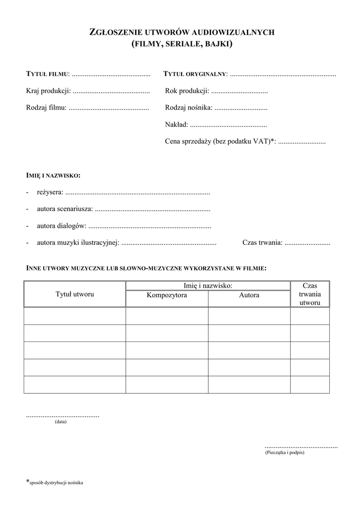 ZGŁOSZENIE UTWORÓW AUDIOWIZUALNYCH (FILMY, SERIALE, BAJKI) TYTUŁ FILMU: ........................................... TYTUŁ ORYGINALNY: .......................................................... Kraj produkcji: .......................................... Rok produkcji: ............................... Rodzaj filmu: ............................................ Rodzaj nośnika: ............................. Nakład: .......................................... Cena sprzedaŜy (bez podatku VAT)*: .......................... IMIĘ I NAZWISKO: - reŜysera: ............................................................................... - autora scenariusza: ............................................................... - autora dialogów: ................................................................... - autora muzyki ilustracyjnej: .................................................... Czas trwania: ......................... INNE UTWORY MUZYCZNE LUB SŁOWNO-MUZYCZNE WYKORZYSTANE W FILMIE: Tytuł utworu Imię i nazwisko: Kompozytora Autora Czas trwania utworu ........................................ (data) ........................................ (Pieczątka i podpis) *sposób dystrybucji nośnika