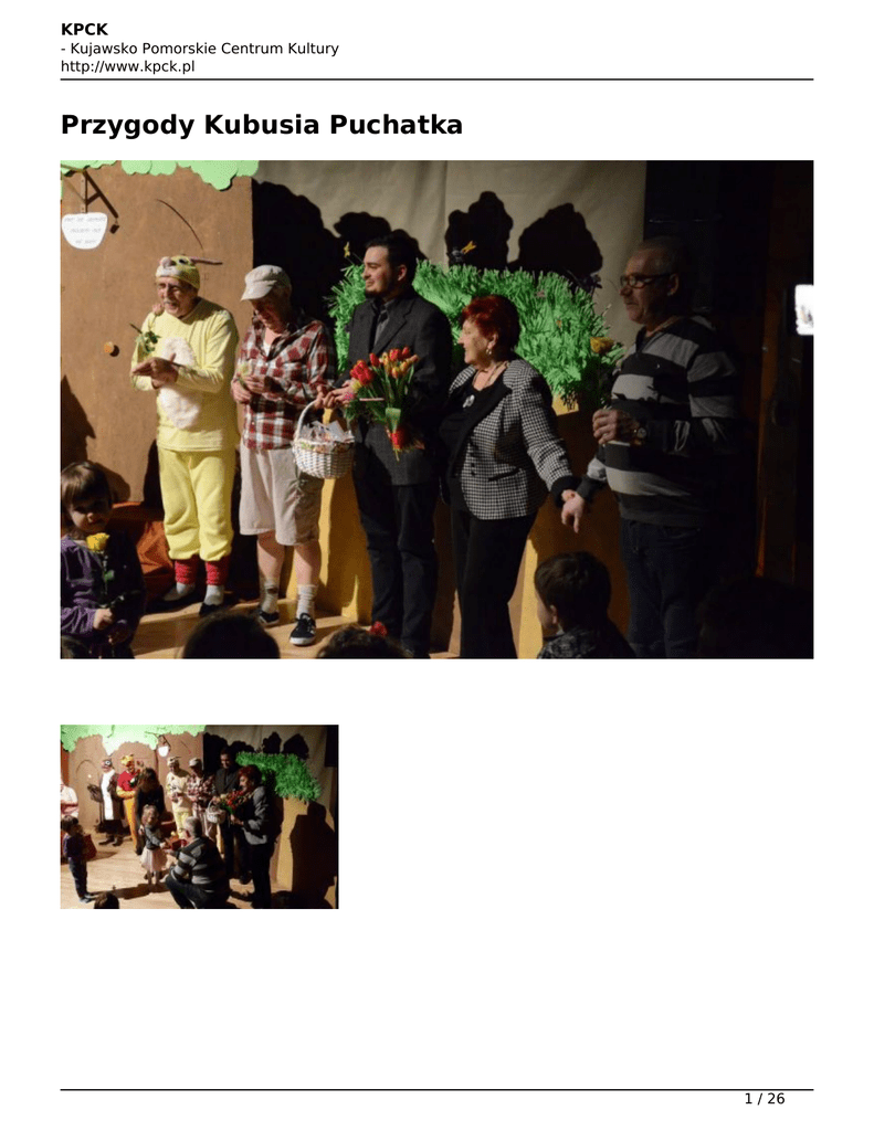 KPCK - Kujawsko Pomorskie Centrum Kultury http://www.kpck.pl Przygody Kubusia Puchatka 1 / 26 KPCK - Kujawsko Pomorskie Centrum Kultury http://www.kpck.pl 2 / 26 KPCK - Kujawsko Pomorskie Centrum Kultury http://www.kpck.pl 3 / 26 KPCK - Kujawsko Pomorskie Centrum Kultury http://www.kpck.pl 4 / 26 KPCK - Kujawsko Pomorskie Centrum Kultury http://www.kpck.pl 5 / 26 KPCK - Kujawsko Pomorskie Centrum Kultury http://www.kpck.pl 6 / 26 KPCK - Kujawsko Pomorskie Centrum Kultury http://www.kpck.pl Prapremiera spektaklu "Przygody Kubusia Puchatka" w wykonaniu Teatru Form Różnych "Nasza Klasa" z Kujawskiego Uniwersytetu Trzeciego Wieku zakończyła się pełnym sukcesem. Styczniowa prapremiera odbyła się z okazji Dnia Babci i Dziadka oraz była okazją do wspólnego spędzenia czasu Seniorów z wnukami. Wstęp na spektakl był bezpłatny - obowiązywały darmowe wejściówki. Wszystkim Babciom i Dziadkom jeszcze raz życzymy wszystkiego najlepszego z okazji ich Święta. Reżyseria: Teresa Wądzińska-Szpecht Scenariusz: Alfreda Piątek Scenografia: Mateusz Grzębski Opracowanie muzyczne: Mateusz Grzębski Obsługa techniczna: Wojciech Woźniak Wystąpili: Ewa Bochniak, Zenobia Chart, Iwona Głuszkowska, Kordian Kaniecki, Helena Kowalska, Danuta Lewandowska, Aleksander Murawski, Danuta Należyta, Anna 7 / 26 KPCK - Kujawsko Pomorskie Centrum Kultury http://www.kpck.pl Pawlikowska, Łucja Tomaśko 8 / 26 KPCK - Kujawsko Pomorskie Centrum Kultury http://www.kpck.pl 9 / 26 KPCK - Kujawsko Pomorskie Centrum Kultury http://www.kpck.pl 10 / 26 KPCK - Kujawsko Pomorskie Centrum Kultury http://www.kpck.pl 11 / 26 KPCK - Kujawsko Pomorskie Centrum Kultury http://www.kpck.pl 12 / 26 KPCK - Kujawsko Pomorskie Centrum Kultury http://www.kpck.pl 13 / 26 KPCK - Kujawsko Pomorskie Centrum Kultury http://www.kpck.pl 14 / 26 KPCK - Kujawsko Pomorskie Centrum Kultury http://www.kpck.pl 15 / 26 KPCK - Kujawsko Pomorskie Centrum Kultury http://www.kpck.pl 16 / 26 KPCK - Kujawsko Pomorskie Centrum Kultury http://www.kpck.pl 17 / 26 KPCK - Kujawsko Pomorskie Centrum Kultury http://www.kpck.pl 18 / 26 KPCK - Kujawsko Pomorskie Centrum Kultury http://www.kpck.pl 19 / 26 KPCK - Kujawsko Pomorskie Centrum Kultury http://www.kpck.pl 20 / 26 KPCK - Kujawsko Pomorskie Centrum Kultury http://www.kpck.pl 21 / 26 KPCK - Kujawsko Pomorskie Centrum Kultury http://www.kpck.pl Za pyszne łakocie dla wnucząt i dziadków serdecznie dziękujemy Manufakturze Słodyczy - Karmelowa Kraina z Bydgoszczy. Wygodne poduchy dla najmłodszych 22 / 26 KPCK - Kujawsko Pomorskie Centrum Kultury http://www.kpck.pl przygotował Klub Pracy Twórczej "Pipsztyk" działający przy Pracowni Integracji Międzypokoleniowej. 23 / 26 KPCK - Kujawsko Pomorskie Centrum Kultury http://www.kpck.pl 24 / 26 KPCK - Kujawsko Pomorskie Centrum Kultury http://www.kpck.pl Metryczka newsu: Opublikował – Julian Waszak, dnia 22.01.2017 Kontakt – [email protected], tel. 52 585 15 01 Facebook – zapraszamy do polubienia PIMu na Facebooku Kalendarz – zapraszamy do subskrybowania wydarzeń PIMu Zdjęcia – zapraszamy do obejrzenia naszych albumów na Facebooku Filmy – zapraszamy do obejrzenia naszych filmów na Facebooku Polecamy – portal kulturawzasiegu.pl Zastrzeżenie – treści publikowane na (tej) stronie internetowej przez jej autorów w rozumieniu przepisów ustawy o prawie autorskim i prawach pokrewnych z dnia 4 lutego 1994 r. (t. j. Dz. U. z 2015 r., poz. 1923 z późn. zm.) podlegają ochronie przewidzianej w tej ustawie. Komentarze – informujemy, że nie ponosimy odpowiedzialności za treść 25 / 26 KPCK - Kujawsko Pomorskie Centrum Kultury http://www.kpck.pl zamieszczanych komentarzy. Dane dotyczące IP mogą być udostępniane prokuraturze, sądowi lub organom ścigania na ich wniosek. 26 / 26 Powered by TCPDF (www.tcpdf.org)