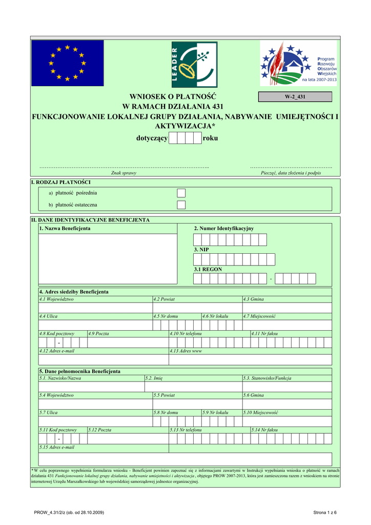 W-2_431 WNIOSEK O PŁATNOŚĆ W RAMACH DZIAŁANIA 431 FUNKCJONOWANIE LOKALNEJ GRUPY DZIAŁANIA, NABYWANIE UMIEJĘTNOŚCI I AKTYWIZACJA* dotyczący roku ………………………………………………………………………………….. ………………………………………. Znak sprawy Pieczęć, data złoŜenia i podpis I. RODZAJ PŁATNOŚCI a) płatność pośrednia b) płatność ostateczna II. DANE IDENTYFIKACYJNE BENEFICJENTA 1. Nazwa Beneficjenta 2. Numer Identyfikacyjny 3. NIP 3.1 REGON 4. Adres siedziby Beneficjenta 4.1 Województwo 4.2 Powiat 4.4 Ulica 4.5 Nr domu 4.8 Kod pocztowy 4.9 Poczta 4.3 Gmina 4.6 Nr lokalu 4.10 Nr telefonu 4.7 Miejscowość 4.11 Nr faksu 4.12 Adres e-mail 4.13 Adres www 5. Dane pełnomocnika Beneficjenta 5.1. Nazwisko/Nazwa 5.2. Imię 5.3. Stanowisko/Funkcja 5.4 Województwo 5.5 Powiat 5.7 Ulica 5.8 Nr domu 5.11 Kod pocztowy 5.12 Poczta 5.13 Nr telefonu 5.6 Gmina 5.9 Nr lokalu 5.10 Miejscowość 5.14 Nr faksu 5.15 Adres e-mail * W celu poprawnego wypełnienia formularza wniosku - Beneficjent powinien zapoznać się z informacjami zawartymi w Instrukcji wypełniania wniosku o płatność w ramach działania 431 Funkcjonowanie lokalnej grupy działania, nabywanie umiejetności i aktywizacja , objętego PROW 2007-2013, która jest zamieszczona razem z wnioskiem na stronie internetowej Urzędu Marszałkowskiego lub wojewódzkiej samorządowej jednostce organizacyjnej. PROW_4.31/2/z (ob. od 28.10.2009) Strona 1 z 6 III.DANE Z UMOWY PRZYZNANIA POMOCY (UMOWA) 6. Nazwa Funduszu: Europejski Fundusz Rolny na rzecz Rozwoju Obszarów Wiejskich 7. Nr umowy _ 8. Data zawarcia umowy dzień _ 2 0 miesiąc rok 9. Kwota pomocy z umowy przyznana dla całej operacji 10. Kwota pomocy z umowy przyznana dla danego etapu operacji , zł , zł IV. DANE DOTYCZĄCE WNIOSKU O PŁATNOŚĆ 11. Wniosek za okres: _ od dzień _ 2 0 miesiąc rok _ do dzień _ 2 0 miesiąc 12. Koszty całkowite realizacji danego etapu operacji 13. Koszty kwalifikowalne realizacji danego etapu operacji 14. Koszty niekwalifikowalne realizacji danego etapu operacji 15. Wnioskowana kwota pomocy dla danego etapu operacji rok , zł , zł , zł , zł V. WYKAZ FAKTUR LUB DOKUMENTÓW O RÓWNOWAśNEJ WARTOŚCI DOWODOWEJ DOKUMENTUJĄCYCH PONIESIONE KOSZTY VI. ZESTAWIENIE RZECZOWO - FINANSOWE Z REALIZACJI OPERACJI DLA ETAPU… VII. ZAŁĄCZNIKI DO WNIOSKU O PŁATNOŚĆ W RAMACH DZIAŁANIA 431 "FUNKCJONOWANIE LOKALNEJ GRUPY DZIAŁANIA, NABYWANIE UMIEJĘTNOŚCI I AKTYWIZACJA" VIII. OŚWIADCZENIA BENEFICJENTA PROW_4.31/2/z (ob. od 28.10.2009) Strona 2 z 6 V. WYKAZ FAKTUR LUB DOKUMENTÓW O RÓWNOWAśNEJ WARTOŚCI DOWODOWEJ DOKUMENTUJĄCYCH PONIESIONE KOSZTY Data Pozycja w Nr faktury NIP wystawcy Sposób Pozycja na fakturze lub Data Kwota wydatków wystaNazwa wystawcy faktury zestawieniu Lp. faktury lub zapłaty lub dokumencie albo nazwa zapłaty całkowitych (zł) wienia lub dokumentu rzeczowo dokumentu dokumentu towaru/usługi (dd/mm/rr) (G/P/K) (dd/mm/rr) finansowym 1 2 3 4 5 6 7 8 9 Kwota wydatków kwalifikowalnych (zł) w tym VAT * 10 11 1 2 3 4 5 6 7 8 9 10 11 12 13 14 15 16 17 18 19 20 … RAZEM (zł) 0,00 0,00 0,00 * W kolumnie 11 naleŜy wpisać kwotę VAT jedynie w przypadku, gdy VAT jest kosztem kwalifikowalnym. W pozostałych przypadkach naleŜy wpisać 0,00. PROW_4.31/2/z (ob. od 28.10.2009) Strona 3 z 6 VI. ZESTAWIENIE RZECZOWO-FINANSOWE Z REALIZACJI OPERACJI DLA ETAPU Mierniki ilość Wyszczególnienie zakresu rzeczowego dla etapu ilość (liczba) jedn. (zgodnie z pozycjami zawartymi w umowie) (liczba) wg wg miary umowy rozliczeLp. nia 1 I A* 1** 2 2 3 4 ………………… Koszty kwalifikowalne operacji (w zł) etapu wg umowy (zł) etapu wg rozliczenia (zł) Koszty ogółem w tym VAT *** Koszty ogółem w tym VAT *** odchylenie kosztów kwalifik. (%) 5 6 7 8 9 KOSZTY BIEśĄCE (administracyjne) SUMA KOSZTÓW BIEśĄCYCH II POZOSTAŁE KOSZTY A* 1** 2 SUMA A B* 1** 2 SUMA B C* 1** 2 SUMA C D* 1** 2 … SUMA D (…)* 1** 2 … SUMA … SUMA POZOSTAŁYCH KOSZTÓW III. SUMA KOSZTÓW KWALIFIKOWALNYCH OPERACJI (I + II) * Zadanie lub grupa zadań realizowanych w ramach zakresu wsparcia, ze wskazaniem miejsca realizacji zadania lub grupy zadań. ** Zadanie lub dostawa/robota/usługa realizowana w ramach zadania. *** VAT, jeśli jest kosztem kwalifikowalnym PROW_4.31/2/z (ob. od 28.10.2009) Strona 4 z 6 W-2_4.31 VII. ZAŁĄCZNIKI DO WNIOSKU O PŁATNOŚĆ W RAMACH DZIAŁANIA 431 "FUNKCJONOWANIE LOKALNEJ GRUPY DZIAŁANIA, NABYWANIE UMIEJĘTNOŚCI I AKTYWIZACJA" LICZBA Lp. A. Załączniki dotyczące wniosku: 1. Faktury lub dokumenty o równowaŜnej wartości dowodowej (w tym umowy o dzieło, zlecenia i inne umowy cywilnoprawne) - kopie* 2. Umowy o pracę z listami płac oraz zakresy czynności pracowników - kopia* 3. Dowody zapłaty - kopie * 4. Wydruk elektroniczny z dokumentacji księgowej lub kopia z ksiąŜki ewidencji środków trwałych – oryginał lub kopia* Umowy z dostawcami lub wykonawcami zawierające specyfikację będącą podstawą wystawienia kaŜdej z przedstawionych faktur lub innych dokumentów o równowaŜnej wartości dowodowej, jeŜeli nazwa towaru lub usługi w przedstawionej fakturze lub dokumencie o równowaŜnej 5. wartości dowodowej, odnosi się do umów zawartych przez Beneficjenta lub nie pozwala na precyzyjne określenie kosztów kwalifikowalnych kopia** Uzasadnienie zmian dokonanych w poszczególnych pozycjach zestawienia rzeczowo – finansowego z realizacji operacji, w przypadku, gdy 6. koszty kwalifikowalne w poszczególnych pozycjach w zestawieniu rzeczowo- finansowym z realizacji operacji róŜnią się o (+/-) 10% w stosunku do wartości zapisanych w zestawieniu rzeczowo- finansowym operacji stanowiącym załącznik do umowy – oryginał. Zaświadczenie z banku lub spółdzielczej kasy oszczędnościowo-kredytowej, wskazujące rachunek bankowy Beneficjenta lub jego 7. pełnomocnika lub cesjonariusza albo rachunek prowadzony w spółdzielczej kasie oszczędn