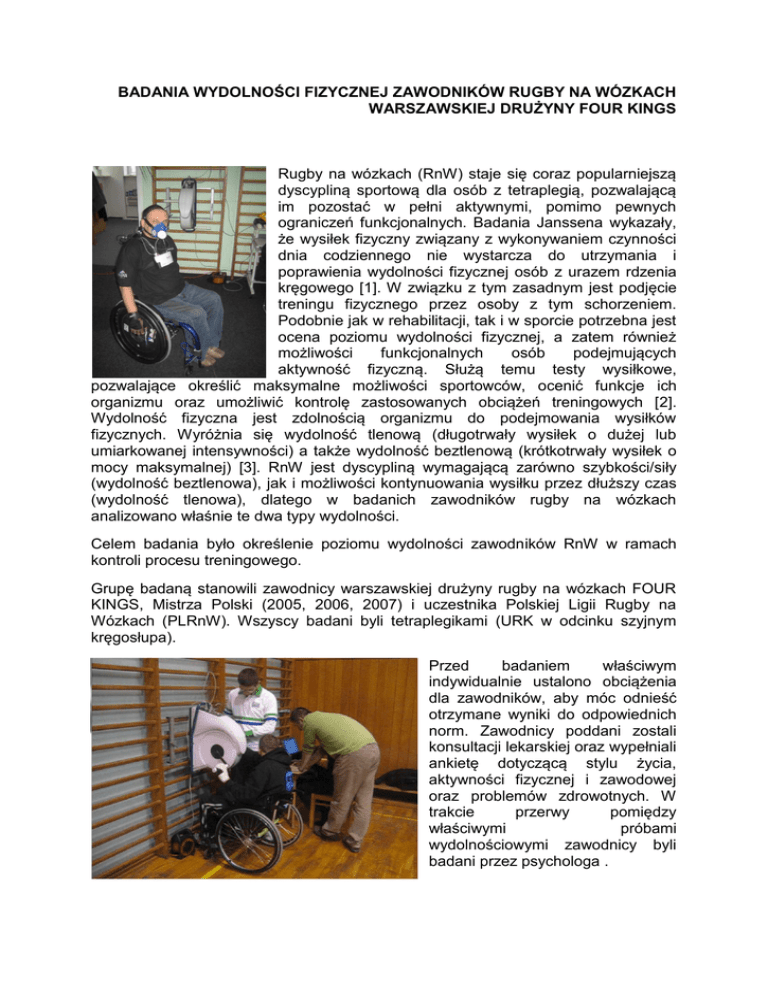 BADANIA WYDOLNOŚCI FIZYCZNEJ ZAWODNIKÓW RUGBY NA WÓZKACH WARSZAWSKIEJ DRUŻYNY FOUR KINGS Rugby na wózkach (RnW) staje się coraz popularniejszą dyscypliną sportową dla osób z tetraplegią, pozwalającą im pozostać w pełni aktywnymi, pomimo pewnych ograniczeń funkcjonalnych. Badania Janssena wykazały, że wysiłek fizyczny związany z wykonywaniem czynności dnia codziennego nie wystarcza do utrzymania i poprawienia wydolności fizycznej osób z urazem rdzenia kręgowego [1]. W związku z tym zasadnym jest podjęcie treningu fizycznego przez osoby z tym schorzeniem. Podobnie jak w rehabilitacji, tak i w sporcie potrzebna jest ocena poziomu wydolności fizycznej, a zatem również możliwości funkcjonalnych osób podejmujących aktywność fizyczną. Służą temu testy wysiłkowe, pozwalające określić maksymalne możliwości sportowców, ocenić funkcje ich organizmu oraz umożliwić kontrolę zastosowanych obciążeń treningowych [2]. Wydolność fizyczna jest zdolnością organizmu do podejmowania wysiłków fizycznych. Wyróżnia się wydolność tlenową (długotrwały wysiłek o dużej lub umiarkowanej intensywności) a także wydolność beztlenową (krótkotrwały wysiłek o mocy maksymalnej) [3]. RnW jest dyscypliną wymagającą zarówno szybkości/siły (wydolność beztlenowa), jak i możliwości kontynuowania wysiłku przez dłuższy czas (wydolność tlenowa), dlatego w badanich zawodników rugby na wózkach analizowano właśnie te dwa typy wydolności. Celem badania było określenie poziomu wydolności zawodników RnW w ramach kontroli procesu treningowego. Grupę badaną stanowili zawodnicy warszawskiej drużyny rugby na wózkach FOUR KINGS, Mistrza Polski (2005, 2006, 2007) i uczestnika Polskiej Ligii Rugby na Wózkach (PLRnW). Wszyscy badani byli tetraplegikami (URK w odcinku szyjnym kręgosłupa). Przed badaniem właściwym indywidualnie ustalono obciążenia dla zawodników, aby móc odnieść otrzymane wyniki do odpowiednich norm. Zawodnicy poddani zostali konsultacji lekarskiej oraz wypełniali ankietę dotyczącą stylu życia, aktywności fizycznej i zawodowej oraz problemów zdrowotnych. W trakcie przerwy pomiędzy właściwymi próbami wydolnościowymi zawodnicy byli badani przez psychologa . W celu określenia wydolności zawodników posłużono się metodami bezpośrednimi, pozwalającymi na bezpośredni pomiar poboru tlenu za pomocą analizatora gazwego podczas wysiłku. Badanie przeprowadzono na ergometrze ręcznym, z obciążeniami, które ustalono na podstawie wcześniejszych testów. Badanie obejmowało dwie zasadnicze próby: wydolności beztlenowej - test Wingate (30 s wysiłek o mocy maksymalnej, przy maksymalnej liczbie obrotów na minutę) i wydolności tlenowej - test szczytowego pochłaniania tlenu (8-12 min wysiłek ze wzrastającym obciążeniem przy stałej częstotliwości 60 obrotów na minutę). Zarówno podczas wysiłków, jak i w czasie restytucji rejestrowano zmiany parametrów krążeniowo – oddechowych i poziom zakwaszenia organizmu zawodników. Dane uzyskane w trakcie badań znajdują się obecnie w opracowaniu. Ich wyniki z pewnością przyczynią się do optymalnego planowania treningów RnW oraz pomogą lepiej zrozumieć specyfikę przemian fizjologicznych zachodzących u osób z urazem rdzenia kręgowego w trakcie wysiłku. Bardzo dziękujemy za udział w badanich wszystkim zawodnikom drużyny Four Kings i życzymy dalszych sukcesów w zmaganiach sportowych! Emilia Dadura i Tomasz Marciniak SKN przy Zakładzie Sportu Niepełnosprawnych Bibliografia: 1. Morgulec N., Kosmol A., 2007: Wybrane zagadnienia sportu osób z URK – C. W:Aktywność fizyczna w procesie usprawniania osób z uszkodzeniem rdzenia kręgowego w odcinku szyjnym. Wydawnictwo AWF, Warszawa, 119 – 127. 2. Jaskólski A., Jaskólska A., 2006: Podstawy fizjologii wysiłku fizycznego z zarysem fizjologii człowieka. Wydawnictwo AWF, Wrocław. 3. Żołądź J. A., 2001: Wydolność fizyczna człwieka. W: Górski J. (red): Fizjologiczne podstawy wysiłku fizycznego. Wydawnctwo PZWL, Warszawa, 456 – 519.