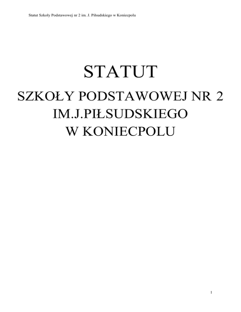 Statut Szkoły Podstawowej nr 2 im. J. Piłsudskiego w Koniecpolu STATUT SZKOŁY PODSTAWOWEJ NR 2 IM.J.PIŁSUDSKIEGO W KONIECPOLU 1 Statut Szkoły Podstawowej nr 2 im. J. Piłsudskiego w Koniecpolu Spis treści Rozdział I . Postanowienia ogólne §1. Informacje o szkole §2. Obwód szkoły 4 4 4 Rozdział II. Cele i zadania szkoły 4 §3. Cele szkoły 4 §4. Realizacja zadań i celów szkoły 5 §5. Pomoc psychologiczno – pedagogiczna 7 §5a Zasady bezpieczeństwa oraz zasady promocji i ochrony zdrowia 10 §5b Organizacja zajęć dodatkowych 11 §6. Zakres i sposób wykonywania zadań opiekuńczych szkoły 12 §6a Współdziałanie z poradniami pedagogiczno - psychologicznymi i innymi instytucjami świadczącymi poradnictwo i specjalistyczna pomoc dzieciom i rodzicom 13 §6b Współpraca z rodzicami 13 15 Rozdział III .Wewnątrzszkolne ocenianie, klasyfikowanie i promowanie uczniów §7. Założenia ogólne 15 §8. Wymagania edukacyjne 16 §9. Przedmiotowy system oceniania 16 §10. Skala ocen i formy oceniania w edukacji wczesnoszkolnej 16 §11.Skala ocen i formy oceniania w klasach 4- 6 19 20 §12.Zasady sprawdzania osiągnięć edukacyjnych uczniów §13. Sposoby uzasadniania oceny 22 §14. Dostosowanie wymagań do potrzeb psychofizycznych i edukacyjnych ucznia 23 24 §15.Tryb ustalania oceny śródrocznej/rocznej klasyfikacyjnej z zajęć edukacyjnych §16. Warunki i tryb uzyskiwania wyższej niż przewidywana śródrocznej /rocznej oceny klasyfikacyjnej z zajęć edukacyjnych 25 §17. Tryb uzyskiwania śródrocznej/rocznej oceny klasyfikacyjnej zachowania 26 §18. Warunki i tryb uzyskiwania wyższej niż przewidywana śródrocznej /rocznej oceny klasyfikacyjnej zachowania 27 §19.Ustalanie warunków i sposobu przekazywania rodzicom(prawnym opiekunom) informacji o postępach i trudnościach w nauce 27 §20. Odwołanie od oceny 28 §21. Ocena zachowania 30 §22. Klasyfikowanie ucznia i egzamin klasyfikacyjny 34 §23.Promowanie i egzamin poprawkowy 36 §24. Sprawdzian 39 §25. Postanowienia końcowe 44 Rozdział IV Kompetencje organów szkoły 44 §27. Organy szkoły 44 §27. Zadania dyrektora szkoły 44 §28. Rada Pedagogiczna 46 §29.Rada Rodziców 48 §30.Samorząd Uczniowski 49 §31. Zasady współdziałania organów szkoły oraz sposoby rozwiązywania sporów między nimi. 50 Rozdział V . Organizacja szkoły §32. Organizacja zajęć 50 50 2 Statut Szkoły Podstawowej nr 2 im. J. Piłsudskiego w Koniecpolu §33. Formy pracy dydaktycznej i wychowawczej §34. Świetlica §35. Biblioteka szkolna 51 54 54 Rozdział VI. Nauczyciele i inni pracownicy szkoły §36. Zadania nauczycieli §37.Prawa nauczycieli §38. Zadania wychowawców klas §39. Zadania nauczycieli w zakresie zapewniania bezpieczeństwa uczniom §40. Zespoły nauczycielskie §41. Zadania wicedyrektora §42. Pracownicy niepedagogiczni oraz zakres zadań na poszczególnych stanowiskach Pracy 55 55 57 57 60 61 62 64 Rozdział VII. Obowiązek szkolny §43. Zasady przyjmowania uczniów do szkoły §44. Realizacja obowiązku szkolnego §45. Warunki pobytu w szkole zapewniające uczniom bezpieczeństwo 67 67 69 70 Rozdział VIII Prawa i obowiązki uczniów §46. Prawa uczniów §47. Obowiązki ucznia §48. Tryb składania skarg §49. Tryb rozpatrywania skarg i wniosków §50. Tryb odwoławczy 71 71 72 73 74 75 Rozdział IX Formy nagradzania i karania §51. Nagrody §52.Kary 75 75 76 Rozdział X Postanowienia końcowe §53 76 76 3 Statut Szkoły Podstawowej nr 2 im. J. Piłsudskiego w Koniecpolu Rozdział I Postanowienia ogólne § 1 Informacje o szkole 1. Ustala się nazwę szkoły w brzmieniu: Szkoła Podstawowa nr 2 im. Józefa Piłsudskiego w Koniecpolu (w Zespole Szkół w Koniecpolu). 2. Siedziba szkoły: 42 – 230 Koniecpol, ul. Szkolna 17. 3. Organ prowadzący: Gmina Koniecpol. 4. Organ sprawujący nadzór pedagogiczny: Śląski Kurator Oświaty. 5. Nauka w szkole podstawowej trwa 6 lat i kończy się uzyskaniem świadectwa ukończenia szkoły. 6. Szkoła podstawowa zapewnia bezpłatne nauczanie w zakresie podstaw programowych. 7. Szkoła podstawowa jest jednostką budżetową. § 2 Obwód szkoły Do obwodu szkoły podstawowej należą: 1. ulice: Akacjowa, Armii Krajowej, Armii Ludowej, Brzozowa, Bukowa, Cicha, Chrząstowska, Działkowa, Górna, Grzybowa, Jesionowa, Jodłowa, Kolejowa ,Leśna, Łąkowa, Mała, Modrzewiowa, Ogrodowa, Piaskowa, Polna, Poprzeczna, Robotnicza, Różana, Stawowa, Słowik, Szkolna, Tarchalskiego, Tartaczna, Topolowa, Wąska, Wesoła, Willowa, Zamkowa, Zielona, Żeromskiego, A. Fredry, Z. Krasińskiego, Norwida, M. i Z. Gruszeckich, B. Żeleńskiego; 2. miejscowość Teresów. ROZDZIAŁ II Cele i zadania szkoły § 3 Cele szkoły Szkoła realizuje cele i zadania określone w ustawie z 7 września 1991 r. o systemie oświaty oraz uwzględniające program wychowawczy szkoły i szkolny program profilaktyki dostosowany do potrzeb rozwojowych uczniów oraz potrzeb danego środowiska, o którym mowa w odrębnych przepisach: 4 Statut Szkoły Podstawowej nr 2 im. J. Piłsudskiego w Koniecpolu 1. umożliwia zdobycie wiedzy i umiejętności niezbędnych do uzyskania świadectwa ukończenia szkoły i kontynuowania nauki w szkole średniej, 2. sprawuje opiekę nad uczniami odpowiednio do ich potrzeb oraz możliwości szkoły, 3. wspomaga wychowawczą rolę rodziny, 4. kształtuje środowisko wychowawcze sprzyjające realizowaniu celów i zasad określonych w ustawie przez współpracę z instytucjami kulturalnymi, rodziną i Kościołem, stosownie do warunków szkoły i wieku uczniów, 5. dba o rozwój ucznia z uwzględnieniem zasad bezpieczeństwa i ochrony zdrowia, 6. realizuje zadania zespołów nauczycielskich, 7. realizuje zasady wewnątrzszkolnego oceniania, 8. organizuje opiekę i pomoc uczniom, którym z przyczyn rozwojowych, rodzinnych, czy losowych potrzebna jest pomoc i wsparcie, 9. organizuje zajęcia dodatkowe dla uczniów uwzględniając ich potrzeby rozwojowe, 10. współdziała z poradn