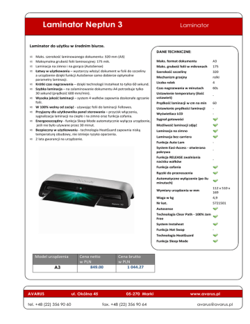 Laminator Neptun 3 Laminator lAMINATOR Laminator do użytku w średnim biurze. DANE TECHNICZNE: • • • • • • • • • • • • Maks. szerokość laminowanego dokumentu: 320 mm (A3) Maksymalna grubość folii laminacyjnej: 175 mik. Laminacja na zimno i na gorąco (AutoSense) Łatwy w użytkowaniu – wystarczy włożyć dokument w folii do szczeliny a urządzenie dzięki funkcji AutoSense samo dobierze optymalne parametry laminacji. Krótki czas nagrzewania – dzięki technologii InstaHeat to tylko 60 sekund. Szybka laminacja – na zalaminowanie dokumentu A4 potrzebuje tylko 30 sekund (prędkość 600 mm/min). Wysoka jakość laminacji – system 4 wałków zapewnia doskonałe zgrzanie folii. W 100% wolny od zacięć - używając folii do laminacji Fellowes. Przyjazny dla użytkownika panel sterowania – przycisk włączenia, sygnalizacja laminacji na ciepło i na zimno oraz funkcja cofania. Energooszczędny - funkcja Sleep Mode automatycznie wyłącza urządzenie, jeśli nie było używane przez 30 minut. Bezpieczny w użytkowaniu - technologia HeatGuard zapewnia niską temperaturę obudowy, nie istnieje ryzyko oparzenia. 2 lata gwarancji na urządzenie. Maks. format dokumentu A3 Maks. grubość folii w mikronach 175 Szerokość szczeliny 320 Mechanizm grzejny rolki Liczba rolek 4 Czas nagrzewania w minutach 60s Ustawienie temperatury (ilość ustawień) - Prędkość laminacji w cm na min 60 Ustawienie prędkości laminacji - Wyświetlacz LCD - Sygnał gotowości Możliwość laminacji zdjęć Laminacja na zimno Laminacja bez carriera Funkcja Auto Lam - System Easi-Access - otwierana pokrywa - Funkcja RELEASE zwalniania nacisku wałków - Funkcja cofania Rączki do przenoszenia Automatyczne wyłączenie (po ilu minutach) Wymiary urządzenia w mm 112 x 510 x 169 Waga w kg 4,9 Nr kat. 5721501 Autosense Technologia Clear Path - 100% Jam Free System Instaheat - Funkcja Hot Swap Technologia HeatGuard Funkcja Sleep Mode Model urządzenia A3 AVARUS tel. +48 (22) 356 90 60 Cena netto w PLN 849.00 ul. Okólna 45 Cena brutto w PLN 1 044.27 05-270 Marki fax. +48 (22) 356 90 64 www.avarus.pl [email protected]
