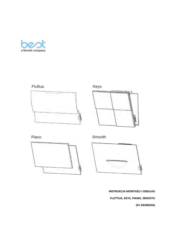 INSTRUKCJA MONTAŻU I OBSŁUGI FLUTTUA, KEYS, PIANO, SMOOTH (PL 04308356) 2 *KUCHENKA ELEKTRYCZNA ** KUCHENKA GAZOWA 3 4 5 6 7 8 9 Montaż powinien być przeprowadzony zgodnie z niniejszą instrukcją i przez uprawnionego instalatora. Podczas prac instalacyjnych i konserwacyjnych należy nosić rękawice i okulary ochronne. ODPROWADZANIE ZUŻYTEGO POWIETRZA (dla okapu w trybie wyciągu) Przygotować otwór i rury odprowadzające zużyte powietrze (średnica 150 mm) Zastosować możliwie najkrótszą drogę odprowadzenia Rura odprowadzająca powinna mieć możliwie jak najmniejszą ilość zagięć (maks. kąt zagięcia rury 900). Powierzchnia wewnętrzna rury powinna być możliwie gładka. Materiał, z którego wykonana jest rura, powinien być zgodny z obowiązującymi normami. Nie podłączać okapu do przewodów kominowych służących do odprowadzania oparów powstałych podczas spalania (np. piece gazowe, olejowe, kominki). W przypadku okapu w trybie wyciągu należy przestrzegać przepisów budowlanych Zużytego powietrza nie należy odprowadzać bezpośrednio przez otwór w ścianie, który nie jest przeznaczony do tego celu. Pomieszczenie musi posiadać odpowiednią wentylację, aby uniknąć wytworzenia przez okap podciśnienia (nie powinno przekraczać 0,04mbar). W przypadku, gdy okap będzie użytkowany równocześnie z urządzeniami nie elektrycznymi (piec gazowy, piec olejowy, piec węglowy itp.) może dojść do zassania oparów, wytwarzanych przez te urządzenia. TRYBY PRACY – TRYB WYCIĄGU LUB TRYB POCHŁANIACZA Urządzenie może pracować w trybie wyciągu lub pochłaniacza. O trybie pracy należy zdecydować przed instalacją urządzenia. Wybór trybu pracy zależy przede wszystkim od tego, czy jest możliwe zainstalowanie systemu rur wiodących zanieczyszczone powietrze do kanału wentylacyjnego. Okap w trybie wyciągu W przypadku okapu pracującego w trybie wyciągu powietrze jest zasysane przez okap, tłuszcze zostają wchłonięte przez filtry przeciwtłuszczowe, na następnie zapachy i opary zostają wydalone na zewnątrz budynku poprzez przewód kominowy (średnica rury odprowadzającej powietrze 150 mm). Okap w trybie pochłaniacza W trybie pochłaniacza powietrze jest zasysane do wnętrza okapu, tłuszcze zostają zatrzymane przez filtry przeciwtłuszczowe, a następnie powietrze trafia do filtrów węglowych, które pochłaniają zapachy powstałe podczas gotowania, po czym oczyszczone powietrze powraca do pomieszczenia. Dla tej wersji wymagane są: 1 pokrywa, 1 redukcja, filtr węglowy. W modelach wyposażonych w rurę 10 otwory wyprowadzające powietrze w górnej rurze powinny być skierowane do góry, a zamiast pokrywy należy zastosować deflektor powietrza. ELEMENTY STERUJĄCE Wskaźnik prędkości Wskaźnik prędkości PRZYCISK WSKAŹNIK LED PU5: ON/OFF (WŁĄCZ/WYŁĄCZ) automatyczny wykrywacz oparów PU4: ON/OFF (WŁĄCZ/WYŁĄCZ) silnik, 3 stopień prędkości PU3: ON/OFF (WŁĄCZ/WYŁĄCZ) silnik, 2 stopień prędkości PU2: ON/OFF (WŁĄCZ/WYŁĄCZ) silnik, 1 stopień prędkości PU1: ON/OFF (WŁĄCZ/WYŁĄCZ) oświetlenie *Wyłącznie w przypadku modelu SMOOTH Dłuższe przytrzymanie przycisku PU1 powoduje włączenie lub wyłączenie górnego oświetlenia LED. - Sygnał dźwiękowy: Każde naciśnięcie przycisku generuje sygnał dźwiękowy. - Funkcja automatycznego wykrywacza oparów: po naciśnięciu przycisku PU5 automatycznie jest ustawiana prędkość silnika i wskazywana jest za pomocą świecącego się (światłem ciągłym) wskaźnika LED. Przy każdej zmianie prędkości pracy przy ustawionym automatycznym wykrywaczu oparów, wskaźnik LED PU5 miga przez 5 sekund. Podczas automatycznego trybu pracy możliwa jest zmiana prędkości, należy wówczas nacisnąć odpowiedni przycisk stopnia prędkości pracy. Jeśli funkcja ta jest włączona poprzez naciśnięcie przycisku PU5 silnik włącza się lub wyłącza. Ustawianie czułości czujnika automatycznego wykrywacza oparów: wyłączyć automatyczny wykrywacz oparów oraz silnik, następnie równocześnie nacisnąć przyciski PU1 i PU5 i przytrzymać je przez 3 sekundy. 11 Migające wskaźniki LED przy kolejnych przyciskach: PU2 (najniższa czułość), PU3 (średnia czułość), PU4 (najwyższa czułość), wskazują aktualną czułość. Wybrać czułość czujnika automatycznego wykrywacza oparów: PU2: najniższa czułość PU3: średnia czułość PU4: najwyższa czułość Nacisnąć przycisk PU5, aby zapisać wybór. Alarmy filtrów: Co 30 godzin pracy włącza się alarm filtra przeciwtłuszczowego (świecą się wszystkie wskaźniki LED). Alarm włącza się przy wyłączonym silniku i jest widoczny przez 30 sekund. Aby go deaktywować należy nacisnąć jeden z przycisków i przytrzymać przez 2 sekundy, podczas świecenia się alarmu. Po 120 godzinach pracy włącza się alarm filtra węglowego (migają wszystkie wskaźniki LED). Alarm włącza się przy wyłączonym silniku i jest widoczny przez 30 sekund. Aby go deaktywować należy nacisnąć jeden z przycisków i przytrzymać przez 2 sekundy, podczas świecenia się alarmu. KONSERWACJA ! Przed rozpoczęciem jakichkolwiek prac konserwacyjnych lub czyszczenia należy odłączyć zasilanie. ! Nieprzestrzeganie zaleceń dotyczących czyszczenia urządzenia i wymiany filtrów powoduje zagrożenie pożarem. Należy przestrzegać instrukcji. Czyszczenie okapu JAK CZĘSTO: przynajmniej raz w miesiącu, zarówno na zewnątrz, jak i wewnątrz CZYSZCZENIE OKAPU NA ZEWNĄTRZ: do czyszczenia urządzenia na zewnątrz (części lakierowane) należy używać ściereczki zamoczonej w letniej wodzie oraz neutralnych środków myjących; do czyszczenia urządzeń wykonanych ze stali, miedzi lub mosiądzu należy używać specjalnych środków przeznaczonych do tego celu. CZYSZCZENIE OKAPU WEWNĄTRZ: wewnętrzną część urządzenia należy czyścić ściereczką (lub pędzelkiem) nasączoną alkoholem etylowym. 12 CZEGO NIE NALEŻY ROBIĆ