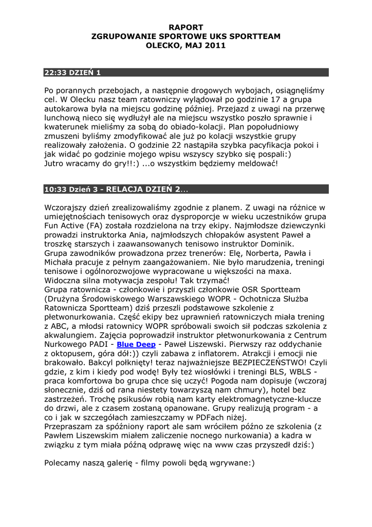 RAPORT ZGRUPOWANIE SPORTOWE UKS SPORTTEAM OLECKO, MAJ 2011 22:33 DZIEŃ 1 Po porannych przebojach, a następnie drogowych wybojach, osiągnęliśmy cel. W Olecku nasz team ratowniczy wylądował po godzinie 17 a grupa autokarowa była na miejscu godzinę później. Przejazd z uwagi na przerwę lunchową nieco się wydłużył ale na miejscu wszystko poszło sprawnie i kwaterunek mieliśmy za sobą do obiado-kolacji. Plan popołudniowy zmuszeni byliśmy zmodyfikować ale już po kolacji wszystkie grupy realizowały założenia. O godzinie 22 nastąpiła szybka pacyfikacja pokoi i jak widać po godzinie mojego wpisu wszyscy szybko się pospali:) Jutro wracamy do gry!!:) ...o wszystkim będziemy meldować! 10:33 Dzień 3 - RELACJA DZIEŃ 2... Wczorajszy dzień zrealizowaliśmy zgodnie z planem. Z uwagi na różnice w umiejętnościach tenisowych oraz dysproporcje w wieku uczestników grupa Fun Active (FA) została rozdzielona na trzy ekipy. Najmłodsze dziewczynki prowadzi instruktorka Ania, najmłodszych chłopaków asystent Paweł a troszkę starszych i zaawansowanych tenisowo instruktor Dominik. Grupa zawodników prowadzona przez trenerów: Elę, Norberta, Pawła i Michała pracuje z pełnym zaangażowaniem. Nie było marudzenia, treningi tenisowe i ogólnorozwojowe wypracowane u większości na maxa. Widoczna silna motywacja zespołu! Tak trzymać! Grupa ratownicza - członkowie i przyszli członkowie OSR Sportteam (Drużyna Środowiskowego Warszawskiego WOPR - Ochotnicza Służba Ratownicza Sportteam) dziś przeszli podstawowe szkolenie z płetwonurkowania. Część ekipy bez uprawnień ratowniczych miała trening z ABC, a młodsi ratownicy WOPR spróbowali swoich sił podczas szkolenia z akwalungiem. Zajęcia poprowadził instruktor płetwonurkowania z Centrum Nurkowego PADI - Blue Deep - Paweł Liszewski. Pierwszy raz oddychanie z oktopusem, góra dół:)) czyli zabawa z inflatorem. Atrakcji i emocji nie brakowało. Bakcyl połknięty! teraz najważniejsze BEZPIECZEŃSTWO! Czyli gdzie, z kim i kiedy pod wodę! Były też wiosłówki i treningi BLS, WBLS praca komfortowa bo grupa chce się uczyć! Pogoda nam dopisuje (wczoraj słonecznie, dziś od rana niestety towarzyszą nam chmury), hotel bez zastrzeżeń. Trochę psikusów robią nam karty elektromagnetyczne-klucze do drzwi, ale z czasem zostaną opanowane. Grupy realizują program - a co i jak w szczegółach zamieszczamy w PDFach niżej. Przepraszam za spóźniony raport ale sam wróciłem późno ze szkolenia (z Pawłem Liszewskim miałem zaliczenie nocnego nurkowania) a kadra w związku z tym miała późną odprawę więc na www czas przyszedł dziś:) Polecamy naszą galerię - filmy powoli będą wgrywane:) 00:46 DZIEŃ 3 Dziś pogoda nie była już dla nas łaskawa i choć ze zdjęć można wywnioskować coś innego to nie zamierzamy nic ukrywać! Trochę kropiło a temperatura spadła do 8 stopni. Marznąć nie marzliśmy bo każdy dostał przykaz uzbrojenia się w podwójne polary i wszystkich wdzianka były kontrolowane:) Treningi właściwie odbyły się bez przeszkód. Z powodu zachmurzenia nie było tak komfortowo jak wczoraj ale zawodnicy "...zrobili swoją robotę!" (tr. Paweł). FunActive wesoło i kolorowo dokazywał na kortach, bieżni i stadionie, a później wyruszył na podchody i dzień zakończył krzykliwym karaoke:) Ratownictwo zgodnie z programem. Młodzi dodatkowo mieli łucznictwo i w nagrodę za sprawne manewry- holowania dla wszystkich były zajęcia z butlą czyli nurki z akwalungiem. Dzień udany lecz wyczerpujący. Dziś też odprawa nieco nam się przeciągnęła, ale został stworzony plan awaryjny na wypadek poważnego załamania pogody. Jutro pobudka bez zmian – kadra kilka minut przed siódmą a młodzi kilka minut po. Najwyższa pora spać więc pozwolę sobie się odmeldować!:) PS. W pokojach porządek utrzymuje się na poziomie 70%, posiłki bardzo smaczne i na kuchnię narzekać nie możemy! Sportowa Piona od naszego Sportteamu! 01:09 DZIEŃ 4 Dzień przywitał nas chmurami i kilkoma stopniami powyżej zera:( ..na szczęście taka aura towarzyszyła nam do śniadania, później szybko zaczęło się przejaśniać i temperatura nieco wzrosła. Grupa zawodnicza w dalszym ciągu pracuje na wysokich obrotach a o dyscyplinę i jakość pracy dba instruktor Paweł Kur. Dziś żadne warunki nie były im straszne treningi zrealizowane zgodnie z planem - jutro ostatnie gry, powrót do Warszawy i turnieje czas zacząć!:) Fun Active nie próbował do południa zmierzyć się z pogodą i blok zajęć porannych został zrealizowany w sali gimnastycznej - biegi, skipy, technika poruszania się po korcie i ćwiczenia korekcyjne tak wyglądały w wielkim skrócie zajęcia. Później tenisowy skarbing w terenie oraz krótki wykład o naszych barwach narodowych i fladze. Młodzi wypuścili w niebo biało-czerwone lampiony w ten sposób akcentując dzisiejsze święto. Do kolacji były pluski na basenie a na wieczór fajerwerki czyli milionerzy:) Pojawiły się też pierwsze smutki za rodzicami, ale szybko staraliśmy się ratować sytuację. Nie zawsze kadra wszystko wyłapie i każdą niejasność od razu rozwiąże.. bardzo duży nacisk kładziemy na pracę wychowawczą. Wiele zdarzeń udaje nam się uprzedzić ale za każdym razem zwracamy uwagę by młodzi jak najwięcej i jak najczęściej się z nami komunikowali wspólnymi siłami szybciej i łatwiej wypracujemy rozwiązanie. W tym miejscu mile widziane są również Państwa spostrzeżenia,, e-mail lub sms zawsze jest dla nas cenną wskazówką! Dziś wystartowaliśmy przygotowania do Talentiady 2011 - początek rozgrywek - eliminacje, już za 12 dni... naszą ekipę na zgrupowaniu pod tym kątem prowadzi instruktor Dominik Błażewicz. Ekipa OSR na rozruchu porannym pracowała z rzutkami rękawowymi. Po śniadaniu trenerzy Tomasz Borucki oraz Michał Gozdalik poprowadzili trening wytrzymałości siłowej pod kątem ratownictwa a na basenie sko