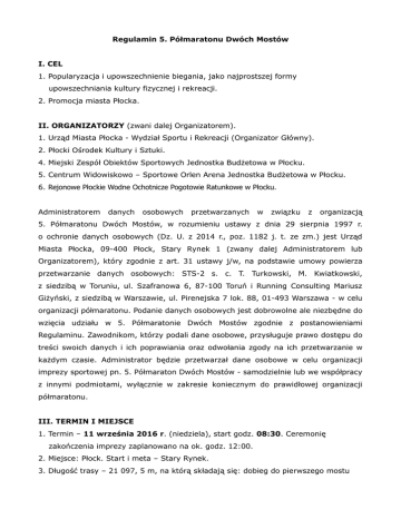 Regulamin 5. Półmaratonu Dwóch Mostów I. CEL 1. Popularyzacja i upowszechnienie biegania, jako najprostszej formy upowszechniania kultury fizycznej i rekreacji. 2. Promocja miasta Płocka. II. ORGANIZATORZY (zwani dalej Organizatorem). 1. Urząd Miasta Płocka - Wydział Sportu i Rekreacji (Organizator Główny). 2. Płocki Ośrodek Kultury i Sztuki. 4. Miejski Zespół Obiektów Sportowych Jednostka Budżetowa w Płocku. 5. Centrum Widowiskowo – Sportowe Orlen Arena Jednostka Budżetowa w Płocku. 6. Rejonowe Płockie Wodne Ochotnicze Pogotowie Ratunkowe w Płocku. Administratorem danych osobowych przetwarzanych w związku z organizacją 5. Półmaratonu Dwóch Mostów, w rozumieniu ustawy z dnia 29 sierpnia 1997 r. o ochronie danych osobowych (Dz. U. z 2014 r., poz. 1182 j. t. ze zm.) jest Urząd Miasta Płocka, 09-400 Płock, Stary Rynek 1 (zwany dalej Administratorem lub Organizatorem), który zgodnie z art. 31 ustawy j/w, na podstawie umowy powierza przetwarzanie danych osobowych: STS-2 s. c. T. Turkowski, M. Kwiatkowski, z siedzibą w Toruniu, ul. Szafranowa 6, 87-100 Toruń i Running Consulting Mariusz Giżyński, z siedzibą w Warszawie, ul. Pirenejska 7 lok. 88, 01-493 Warszawa - w celu organizacji półmaratonu. Podanie danych osobowych jest dobrowolne ale niezbędne do wzięcia udziału w 5. Półmaratonie Dwóch Mostów zgodnie z postanowieniami Regulaminu. Zawodnikom, którzy podali dane osobowe, przysługuje prawo dostępu do treści swoich danych i ich poprawiania oraz odwołania zgody na ich przetwarzanie w każdym czasie. Administrator będzie przetwarzał dane osobowe w celu organizacji imprezy sportowej pn. 5. Półmaraton Dwóch Mostów - samodzielnie lub we współpracy z innymi podmiotami, wyłącznie w zakresie koniecznym do prawidłowej organizacji półmaratonu. III. TERMIN I MIEJSCE 1. Termin – 11 września 2016 r. (niedziela), start godz. 08:30. Ceremonię zakończenia imprezy zaplanowano na ok. godz. 12:00. 2. Miejsce: Płock. Start i meta – Stary Rynek. 3. Długość trasy – 21 097, 5 m, na którą składają się: dobieg do pierwszego mostu 1 km, dwie pętle po 9, 5 km każda i dobieg do mety 1, 0975 km. 4. Trasa biegu: 65% nawierzchni asfaltowej, 20 % płyty betonowe, 10 % ścieżki nieutwardzone, 5 % kostka brukowa. (start – Stary Rynek – pl. Narutowicza – ul. Mostowa – Most im. Legionów- Kolejowa – Rondo Lajourdie – wał przeciwpowodziowy – Most Solidarności – Grabówka – Norbertańska – Mostowa Most im. Legionów – Kolejowa – Rondo Lajourdie – wał przeciwpowodziowy – Most Solidarności – Grabówka – Norbertańska –Mostowa – Pl. Narutowicza – meta Stary Rynek). 5. Regulamin dostępny będzie na stronie internetowej organizatorów półmaratonu: www.polmaraton.plock.eu i w Biurze Zawodów. 6. Oznaczenie trasy co 1 km. 7. Na trasie będzie 7 punktów odżywczych (nawadniania), na których dostępne będą woda i isotonic (5, 6 km, 8, 4 km, 9, 5 km, 12 km, 15 km, 17, 8 km, 19, 5 km plus meta. 8. Na trasie będą znajdowały się punkty kontrolne. Skrócenie trasy powoduje dyskwalifikację. 9. Zawodników obowiązuje limit czasowy pokonania trasy wynoszący 03h:00min:00s. 10. Trasa półmaratonu zamknięta jest dla ruchu kołowego do godziny 11:45. Wszyscy zawodnicy, którzy nie dobiegną do mety do godz. 11:30, zobowiązani są do przerwania biegu i zejścia z trasy. Za ostatnim zawodnikiem będzie jechał samochód techniczny, który po upływie limitu czasu zabierze zawodników na metę. 11. Uczestnicy półmaratonu, którzy po upływie regulaminowego limitu czasu pozostaną na trasie, czynią to własną odpowiedzialność i ryzyko. Muszą oni wtedy dostosować się do wymogów przepisów o ruchu drogowym i kodeksu cywilnego. Organizator w tym przypadku nie ponosi odpowiedzialności z tytułu uszkodzenia ciała lub uszczerbku na zdrowiu tych uczestników. 12. UWAGA! Trasa ze względu na częstą zmianę nawierzchni i duże różnice wzniesień nie jest przeznaczona dla zawodników na wózkach. 13. Uczestnicy półmaratonu ustawiają się na starcie w wydzielonej strefie startowej przez Organizatora. 14. Na trasie półmaratonu będą znajdować się punkty medyczne, które obsługiwane będą przez ratowników medycznych. 15. Na trasie półmaratonu mogą znajdować się wyłącznie jego uczestnicy, obsługa techniczna, w tym pojazdy posiadające zezwolenie Organizatora. IV. UCZESTNICTWO 1. Prawo startu mają zawodnicy, którzy do dnia 11 września 2016 roku ukończą 18 lat oraz spełnią warunki określone w niniejszym Regulaminie. 2. Wszyscy zawodnicy muszą zostać zweryfikowani w Biurze Zawodów. Podczas weryfikacji zawodnicy muszą posiadać dowód osobisty lub inny dokument potwierdzający tożsamość oraz dowód opłaty startowej. 3. Warunkiem dopuszczenia zawodnika do biegu jest: 1) Wypełnienie formularza zgłoszeniowego i dokonanie opłaty wpisowej. 2) Zapoznanie się i wyrażenie zgody na przestrzeganie niniejszego Regulaminu i tym samym pełną akceptację niniejszych regulacji oraz zobowiązanie się do ich przestrzegania. 3) Złożenie oświadczenia o starcie w zawodach na własną odpowiedzialność, mając na uwadze ryzyko i niebezpieczeństwo związane z charakterem i długością trasy półmaratonu, oraz o stanie zdrowia pozwalającym na start w zawodach. 4) W półmaratonie powinny uczestniczyć wyłącznie osoby posiadające dobry stan zdrowia oraz nieposiadające przeciwwskazań medycznych do uczestnictwa w biegu długodystansowym, jakim jest półmaraton. 5) Wyrażenie zgody na przetwarzanie przez Administratora danych osobowych zawodnika podanych w zgłoszeniu, a także na zamieszczanie danych osobowych w postaci imienia, nazwiska, płci, roku urodzenia, narodowości, adresu e-mail, nr telefonu, w przekazach telewizyjnych, radiowych, internetowych i w formie drukowanej oraz na przesyłanie przez Administratora na adres e-mail zawodnika informacji dotyczących 5.Półmaratonu Dw