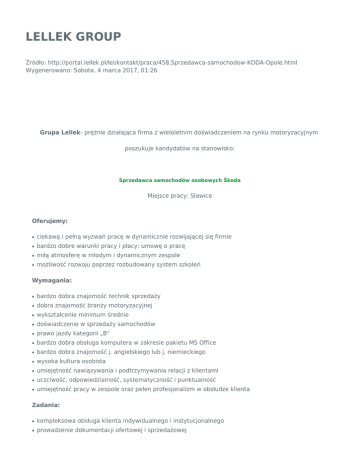 LELLEK GROUP Źródło: http://portal.lellek.pl/lel/kontakt/praca/458,Sprzedawca-samochodow-KODA-Opole.html Wygenerowano: Sobota, 4 marca 2017, 01:26 Grupa Lellek- prężnie działająca firma z wieloletnim doświadczeniem na rynku motoryzacyjnym poszukuje kandydatów na stanowisko: Sprzedawca samochodów osobowych Škoda Miejsce pracy: Sławice Oferujemy: ● ciekawą i pełną wyzwań pracę w dynamicznie rozwijającej się firmie ● bardzo dobre warunki pracy i płacy; umowę o pracę ● miłą atmosferę w młodym i dynamicznym zespole ● możliwość rozwoju poprzez rozbudowany system szkoleń Wymagania: ● bardzo dobra znajomość technik sprzedaży ● dobra znajomość branży motoryzacyjnej ● wykształcenie minimum średnie ● doświadczenie w sprzedaży samochodów ● prawo jazdy kategorii „B" ● bardzo dobra obsługa komputera w zakresie pakietu MS Office ● bardzo dobra znajomość j. angielskiego lub j. niemieckiego ● wysoka kultura osobista ● umiejętność nawiązywania i podtrzymywania relacji z klientami ● uczciwość, odpowiedzialność, systematyczność i punktualność ● umiejętność pracy w zespole oraz pełen profesjonalizm w obsłudze klienta Zadania: ● kompleksowa obsługa klienta indywidualnego i instytucjonalnego ● prowadzenie dokumentacji ofertowej i sprzedażowej ● samokształcenie w zakresie nowości produktowych i technologicznych ● uczestnictwo w szkoleniach Osoby zainteresowane ofertą, spełniające powyższe wymagania prosimy o przesłanie swojej aplikacji, zawierającej CV wraz ze zdjęciem oraz list motywacyjny na adres e-mail: [email protected] Prosimy o dopisanie następującej klauzuli: „Wyrażam zgodę na przetwarzanie moich danych osobowych zawartych w mojej ofercie pracy dla potrzeb niezbędnych do realizacji procesu obecnej i przyszłych rekrutacji zgodnie z ustawą z dnia 29 sierpnia 1997 r. o ochronie danych osobowych (tekst jednolity z dnia 26 czerwca 2014 r. (Dz.U. z 2014 r. poz. 1182 ze zm.)” Jednocześnie zastrzegamy sobie prawo odpowiedzi na wybrane oferty. Tweetnij