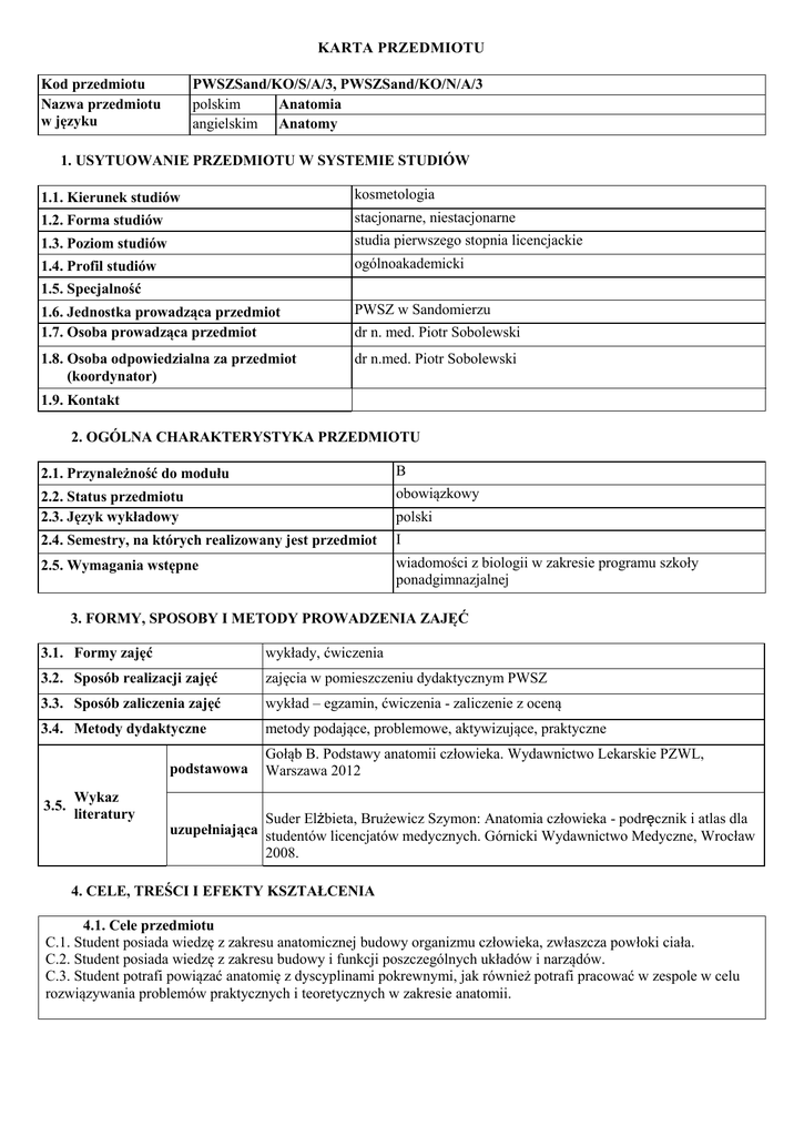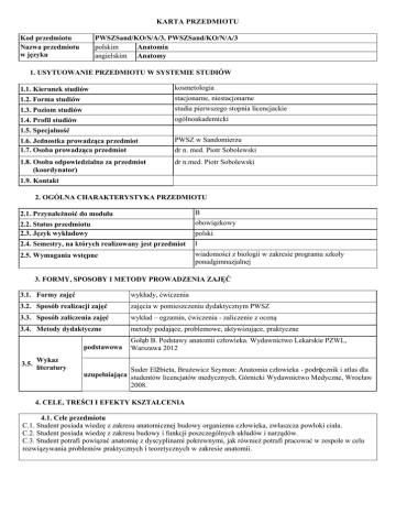 KARTA PRZEDMIOTU Kod przedmiotu Nazwa przedmiotu w języku PWSZSand/KO/S/A/3, PWSZSand/KO/N/A/3 polskim Anatomia angielskim Anatomy 1. USYTUOWANIE PRZEDMIOTU W SYSTEMIE STUDIÓW 1.1. Kierunek studiów kosmetologia 1.2. Forma studiów stacjonarne, niestacjonarne 1.3. Poziom studiów studia pierwszego stopnia licencjackie 1.4. Profil studiów ogólnoakademicki 1.5. Specjalność 1.6. Jednostka prowadząca przedmiot 1.7. Osoba prowadząca przedmiot PWSZ w Sandomierzu 1.8. Osoba odpowiedzialna za przedmiot (koordynator) dr n.med. Piotr Sobolewski dr n. med. Piotr Sobolewski 1.9. Kontakt 2. OGÓLNA CHARAKTERYSTYKA PRZEDMIOTU 2.1. Przynależność do modułu B 2.2. Status przedmiotu 2.3. Język wykładowy obowiązkowy 2.4. Semestry, na których realizowany jest przedmiot I 2.5. Wymagania wstępne wiadomości z biologii w zakresie programu szkoły ponadgimnazjalnej polski 3. FORMY, SPOSOBY I METODY PROWADZENIA ZAJĘĆ 3.1. Formy zajęć wykłady, ćwiczenia 3.2. Sposób realizacji zajęć zajęcia w pomieszczeniu dydaktycznym PWSZ 3.3. Sposób zaliczenia zajęć wykład – egzamin, ćwiczenia - zaliczenie z oceną 3.4. Metody dydaktyczne metody podające, problemowe, aktywizujące, praktyczne podstawowa 3.5. Wykaz literatury Gołąb B. Podstawy anatomii człowieka. Wydawnictwo Lekarskie PZWL, Warszawa 2012 Suder Elżbieta, Brużewicz Szymon: Anatomia człowieka - podręcznik i atlas dla uzupełniająca studentów licencjatów medycznych. Górnicki Wydawnictwo Medyczne, Wrocław 2008. 4. CELE, TREŚCI I EFEKTY KSZTAŁCENIA 4.1. Cele przedmiotu C.1. Student posiada wiedzę z zakresu anatomicznej budowy organizmu człowieka, zwłaszcza powłoki ciała. C.2. Student posiada wiedzę z zakresu budowy i funkcji poszczególnych układów i narządów. C.3. Student potrafi powiązać anatomię z dyscyplinami pokrewnymi, jak również potrafi pracować w zespole w celu rozwiązywania problemów praktycznych i teoretycznych w zakresie anatomii. 4.2. Treści programowe Wykłady – Wstęp do anatomii. Wprowadzenie podstawowych pojęć z zakresu anatomii. Budowa ciała ludzkiego oraz jego układy. Układ kostno-stawowy i mięśniowy. Układ oddechowy. Układ pokarmowy. Układ krążenia. Układ moczowo-płciowy. Układ nerwowy. Narządy zmysłów. Układ dokrewny. Skóra. Ćwiczenia – Budowa anatomiczna wybranych układów i narządów, w tym skóry i jej przydatków. 4.3. Efekty kształcenia Student, który zaliczył przedmiot Kod W01 w zakresie WIEDZY: Opisuje podstawowe układy i narządy. W02 U01 K01 Odniesienie do efektów kształcenia dla kierunku K_W05 dla obszaru M1_W02 Zna szczegółową budowę anatomiczną skóry i jej przydatków. K_W05 M1_W02 w zakresie UMIEJĘTNOŚCI: Rozpoznaje różne struktury anatomiczne organizmu człowieka. K_U13 M1_U2 M1_U10 K_K06 M1_K01 w zakresie KOMPETENCJI SPOŁECZNYCH: Potrafi pracować w zespole, przyjmując różne role w przygotowaniu i opracowaniu problemów w zakresie anatomii. 4.4. Metody weryfikacji efektów kształcenia Forma oceny Efekt Egzamin Egzamin Zadania do Projekt Kolokwium kształcenia ustny pisemny wykonania W01 W02 U01 K01 4.5. Efekt kształcenia W01-W02 U01 K01 Referat Sprawozdanie Dyskusje x x Inne x x x x Kryteria jakościowe uzyskania oceny w danym zakresie efektów kształcenia ocena dostateczny/dostateczny plus dobry/ dobry plus bardzo dobry (3/ 3,5) (4/ 4,5) (5) Opisuje wybrane układy Opisuje większość omawianych Opisuje wszystkie omawiane i narządy. układów i narządów. układy i narządy. Zna szczegółową budowę anatomiczną skóry i wybranych jej przydatków. Rozpoznaje wybrane struktury anatomiczne organizmu człowieka. Zna szczegółową budowę anatomiczną skóry i większości omawianych jej przydatków. Rozpoznaje większość omawianych struktur anatomicznych organizmu człowieka. Zna szczegółową budowę anatomiczną skóry i wszystkich jej przydatków. Rozpoznaje wszystkie omawiane struktury anatomiczne organizmu człowieka. Potrafi pracować w zespole, przyjmując różne role w przygotowaniu i opracowaniu problemów w zakresie anatomii i rozumie znaczenie pracy zespołowej. Potrafi pracować w zespole, przyjmując różne role w przygotowaniu i opracowaniu problemów w zakresie anatomii, rozumie znaczenie pracy zespołowej i zna skutki braku współpracy w rozwiązywaniu określonych zadań. Potrafi pracować w zespole, przyjmując różne role w przygotowaniu i opracowaniu problemów w zakresie anatomii, rozumie znaczenie pracy zespołowej, zna skutki braku współpracy w rozwiązywaniu określonych zadań, jak również ma świadomość konieczności kształtowania tej postawy. 5. BILANS PUNKTÓW ECTS - NAKŁAD PRACY STUDENTA Kategoria Udział w zajęciach dydaktycznych określonych w planie studiów Obciążenie studenta Studia Studia stacjonarne niestacjonarne 30+30 10+30 Samodzielne przygotowanie do zajęć 45 65 Wykonanie powierzonych zadań 10 10 Udział w konsultacjach 3+3 2+3 Przygotowanie do egzaminu/zdawanie egzaminu 10 10 Obciążenie związane z zajęciami praktycznymi 30 30 Obciążenie związane z zajęciami wymagającymi bezpośredniego udziału nauczycieli akademickich Sumaryczne obciążenie pracą studenta 66 45 131 130 5 5 PUNKTY ECTS za przedmiot