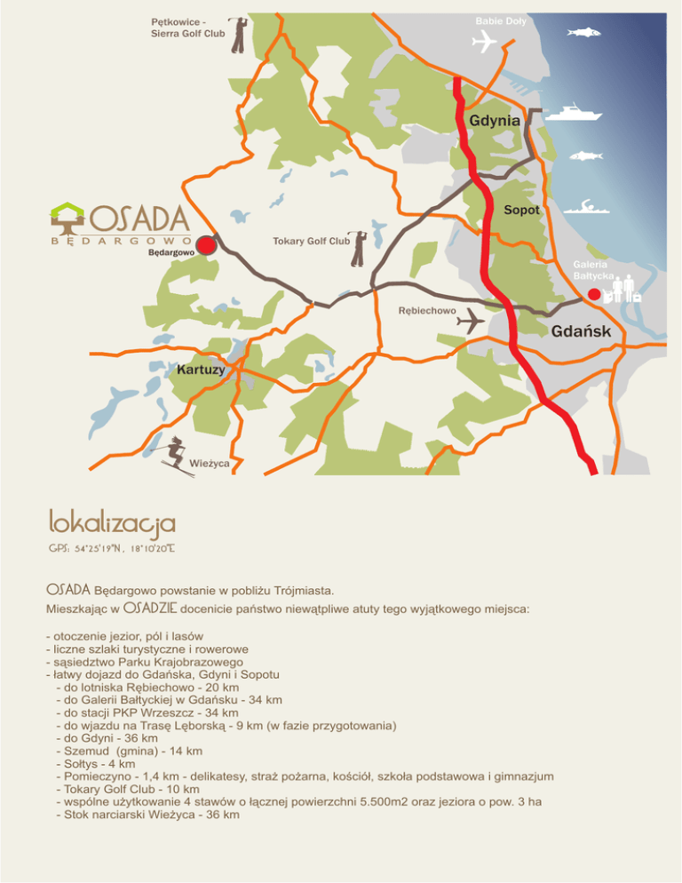 Babie Doły Pętkowice Sierra Golf Club Gdynia OSADA B Ę D A R G O W O Będargowo Sopot Tokary Golf Club Galeria Bałtycka Rębiechowo Gdańsk Kartuzy Wieżyca lokalizacja GPS: 54°25'19"N , 18°10'20”E OSADA Będargowo powstanie w pobliżu Trójmiasta. Mieszkając w OSADZIE docenicie państwo niewątpliwe atuty tego wyjątkowego miejsca: - otoczenie jezior, pól i lasów - liczne szlaki turystyczne i rowerowe - sąsiedztwo Parku Krajobrazowego - łatwy dojazd do Gdańska, Gdyni i Sopotu - do lotniska Rębiechowo - 20 km - do Galerii Bałtyckiej w Gdańsku - 34 km - do stacji PKP Wrzeszcz - 34 km - do wjazdu na Trasę Lęborską - 9 km (w fazie przygotowania) - do Gdyni - 36 km - Szemud (gmina) - 14 km - Sołtys - 4 km - Pomieczyno - 1,4 km - delikatesy, straż pożarna, kościół, szkoła podstawowa i gimnazjum - Tokary Golf Club - 10 km - wspólne użytkowanie 4 stawów o łącznej powierzchni 5.500m2 oraz jeziora o pow. 3 ha - Stok narciarski Wieżyca - 36 km