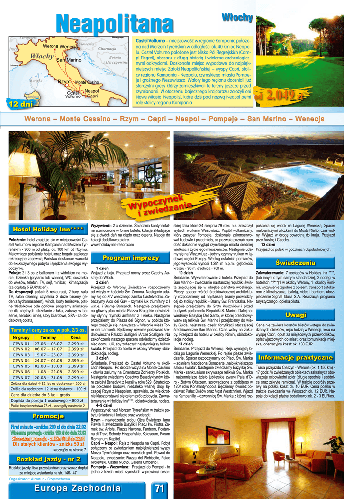 Neapolitana Austria Szwajcaria Werona Wenecja Francja Włochy Hungary Słowenia Chorwacja San Marino Bośnia i Hercegowina Monaco Korsyka Sardynia Sardy dyn y ia 12 dni Rzym Monte Casino Costel Neapol Volturno Capri Włochy Castel Volturno – miejscowość w regionie Kampania położona nad Morzem Tyreńskim w odległości ok. 40 km od Neapolu. Castel Volturno położone jest blisko Pól Flegrejskich (Campi Flegrei), obszaru z długą historią i wieloma archeologicznymi odkryciami. Doskonałe miejsc wypadowe do najpiękniejszych miejsc Zatoki Neapolitańskiej – wyspy Capri, stolicy regionu Kampania - Neapolu, rzymskiego miasta Pompeje i groźnego Wezuwiusza. Walory tego regionu doceniali już starożytni grecy którzy zamieszkiwali te tereny jeszcze przed rzymianami. W otoczeniu bajecznego krajobrazu założyli oni Nowe Miasto (Neapolis), które dziś pod nazwą Neapol pełni rolę stolicy regionu Kampania od 2.049 zł Werona – Monte Cassino – Rzym – Capri – Neapol – Pompeje – San Marino – Wenecja k czyne ie o p y W dzan i zwie Wyżywienie: 2 x dziennie. d i i Śniadania Ś i d i kontynentalk t t l ne wzmocnione w formie bufetu, kolacje składające się z dwóch dań na ciepło oraz deseru. Napoje do Położenie: hotel znajduje się w miejscowości Ca- kolacji dodatkowo płatne. stel Volturno w regionie Kampania nad Morzem Tyr- www.holiday-inn-resort.com reńskim - 900 m od plaży, ok. 180 km od Rzymu. Malownicze położenie hotelu oraz bogate zaplecze Program imprezy rekreacyjne zapewnią Państwu doskonałe warunki do ekskluzywnego pobytu i spędzenia swojego wypoczynku. 1 dzień Pokoje: 2 i 3 os. z balkonem i z widokiem na mo- Wyjazd z kraju. Przejazd nocny przez Czechy, Aurze, łazienka (prysznic lub wanna), WC, suszarka strię do Włoch. do włosów, telefon, TV, sejf, minibar, klimatyzacja 2 dzień (za dopłatą 5 EUR/dzień). Przejazd do Werony. Zwiedzanie rozpoczniemy Do dyspozycji gości: 5 restauracji, 2 bary, sala od wizyty w kościele Św. Zenona. Następnie udaTV, salon dzienny, czytelnia, 2 duże baseny (je- my się do XIV wiecznego zamku Castelvechio. Zoden z hydromasażem), winda, korty tenisowe, płat- baczymy Arco dei Gavi - rzymski łuk triumfalny z I ne 18-dołkowe pole golfowe, programy animacyj- w.n.e. i Bramę Borsarich. Następnie przejdziemy ne dla chętnych (strzelanie z łuku, zabawy w ba- na główny plac miasta Piazza Bra gdzie odwiedzisenie, aerobik i inne), stoły bilardowe, SPA - za do- my słynny rzymski amfiteatr z I wieku. Następnie przejdziemy do Piazza dei Signori, w pobliżu któdatkową opłatą. rego znajduje się, najwyższa w Weronie wieża TorTerminy i ceny za os. w pok. 2/3 os. re dei Lamberti. Będziemy również podziwiać średniowieczne Palazzi Scaligeri i Arche Scaligere. Na Nr grupy Terminy Cena zakończenie naszego spaceru odwiedzimy dziedziCIWN 01 27.06 – 08.07 2.299 zł niec domu Julii, aby zobaczyć najsłynniejszy balkon świata. Przejazd do hotelu w okolicy Werony, obiaCIWN 02 06.07 – 17.07 2.399 zł dokolacja, nocleg. CIWN 03 15.07 – 26.07 2.399 zł 3 dzień CIWN 04 24.07 – 04.08 2.399 zł Śniadanie. Przejazd do Castel Volturno w okoliCIWN 05 02.08 – 13.08 2.399 zł cach Neapolu. Po drodze wizyta na Monte Cassino CIWN 06 11.08 – 22.08 2.399 zł - chwila zadumy na Cmentarzu Żołnierzy Polskich. Następnie zwiedzimy Opactwo Benedyktynów, któCIWN 07 20.08 – 31.08 2.299 zł re założył Benedykt z Nursji w roku 529. StrategiczZniżka dla dzieci 4-12 lat na dostawce – 200 zł ne położenie budowli, niedaleko ważnej drogi łąZniżka dla osoby pow. 12 lat na dostawce – 100 zł czącej Rzym z Neapolem, sprawiało, że wielokrotCena dla dziecka do 3 lat – gratis nie klasztor stawał się celem prób zdobycia. ZakwaDopłata do pokoju 1 osobowego – 800 zł terowanie w Holiday Inn****, obiadokolacja, nocleg. 4–9 dzień Pakiet bezpieczeństwa 75 zł - szczegóły na stronie 2 Wypoczynek nad Morzem Tyrreńskim w trakcie pobytu śniadania i kolacje oraz wycieczki: Promocje Rzym - nawiedzenie grobu Ojca Świętego Jana Pawła II, zwiedzanie Bazyliki i Placu św. Piotra, ZaFirst minute - zniżka 200 zł do dnia 22.02 mek św. Anioła, Piazza Navona, Panteon, FontanWiosenna promocja - zniżka 150 zł do dnia 22.03 na di Trevi, Schody Hiszpańskie, Koloseum, Forum Słoneczna promocja - zniżka 50 zł do 22.04 Romanum, Kapitol. Dla stałych klientów - zniżka 50 zł Capri – Neapol: Rejs z Neapolu na Capri. Pobyt szczegóły na stronie 7 połączony ze zwiedzaniem najpiękniejszej wyspy Morza Tyrreńskiego oraz morskich grot. Powrót do Neapolu, zwiedzanie: Piazza del Plebiscito, Pałac Rozkład jazdy - nr 2 Królewski, Castel Nuovo, Galeria Umberto I. Rozkład jazdy, lista przystanków oraz wykaz dopłat Pompeje – Wezuwiusz: Przejazd do Pompei - to jedno z trzech miast rzymskich w prowincji cesarza miejsce wsiadania na str. 146-147 Hotel Holiday Inn**** Organizator: Almatur - Częstochowa Europa Zachodnia 71 skiej które 24 sierpnia ki j ItItalia li któ i i 79 roku n.e. zniszczył wybuch wulkanu Wezuwiusz. Popiół wulkaniczny, który zasypał Pompeje, doskonale zakonserwował budowle i przedmioty, co pozwala poznać nam dość dokładnie wygląd rzymskiego miasta średniej wielkości i życie jego mieszkańców. Następnie udamy się na Wezuwiusz - jedyny czynny wulkan w lądowej części Europy. Według ostatnich pomiarów, jego wysokość wynosi 1.281 m n.p.m., głębokość krateru - 30 m, średnica - 700 m. 10 dzień Śniadanie. Wykwaterowanie z hotelu. Przejazd do San Marino - zwiedzanie najstarszej republiki świata znajdującej się w obrębie państwa włoskiego. Pieszy spacer wśród średniowiecznej architektury rozpoczniemy od najstarszej bramy prowadzącej do stolicy republiki - Bramy Św. Franciszka. Następnie przejdziemy do Groty Kuszników i przed budynek parlamentu Republiki S. Marino. Dalej nawiedzimy Bazylikę Del Santo, w której przechowywane są relikwie Św. Marino i prz