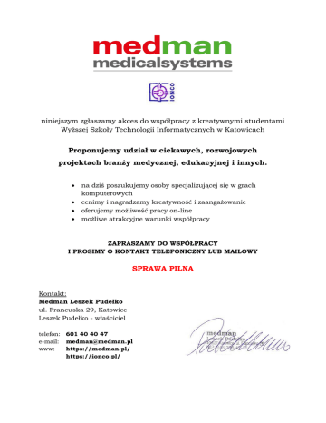 niniejszym zgłaszamy akces do współpracy z kreatywnymi studentami Wyższej Szkoły Technologii Informatycznych w Katowicach Proponujemy udział w ciekawych, rozwojowych projektach branży medycznej, edukacyjnej i innych. na dziś poszukujemy osoby specjalizującej się w grach komputerowych cenimy i nagradzamy kreatywność i zaangażowanie oferujemy możliwość pracy on-line możliwe atrakcyjne warunki współpracy ZAPRASZAMY DO WSPÓŁPRACY I PROSIMY O KONTAKT TELEFONICZNY LUB MAILOWY SPRAWA PILNA Kontakt: Medman Leszek Pudełko ul. Francuska 29, Katowice Leszek Pudełko - właściciel telefon: 601 40 40 47 e-mail: [email protected] www: https://medman.pl/ https://ionco.pl/