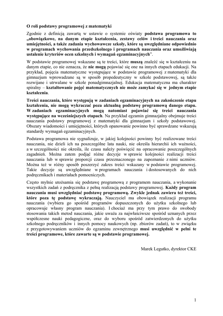 O roli podstawy programowej z matematyki Zgodnie z definicją zawartą w ustawie o systemie oświaty podstawa programowa to „obowiązkowe, na danym etapie kształcenia, zestawy celów i treści nauczania oraz umiejętności, a także zadania wychowawcze szkoły, które są uwzględniane odpowiednio w programach wychowania przedszkolnego i programach nauczania oraz umożliwiają ustalenie kryteriów ocen szkolnych i wymagań egzaminacyjnych”. W podstawie programowej wskazane są te treści, które muszą znaleźć się w kształceniu na danym etapie, co nie oznacza, że nie mogą pojawiać się one na innych etapach edukacji. Na przykład, pojęcia matematyczne występujące w podstawie programowej z matematyki dla gimnazjum wprowadzane są w sposób propedeutyczny w szkole podstawowej, są także rozwijane i utrwalane w szkole ponadgimnazjalnej. Edukacja matematyczna ma charakter spiralny – kształtowanie pojęć matematycznych nie może zamykać się w jednym etapie kształcenia. Treści nauczania, które występują w zadaniach egzaminacyjnych na zakończenie etapu kształcenia, nie mogą wykraczać poza aktualną podstawę programową danego etapu. W zadaniach egzaminacyjnych mogą natomiast pojawiać się treści nauczania występujące na wcześniejszych etapach. Na przykład egzamin gimnazjalny obejmuje treści nauczania podstawy programowej z matematyki dla gimnazjum i szkoły podstawowej. Obszary wiadomości i umiejętności, których opanowanie powinno być sprawdzane wskazują standardy wymagań egzaminacyjnych. Podstawa programowa nie sygnalizuje, w jakiej kolejności powinny być realizowane treści nauczania, nie dzieli ich na poszczególne lata nauki, nie określa hierarchii ich ważności, a w szczególności nie określa, ile czasu należy poświęcić na opracowanie poszczególnych zagadnień. Można zatem podjąć różne decyzje w sprawie kolejności realizacji treści nauczania lub w sprawie proporcji czasu przeznaczonego na zapoznanie z nimi uczniów. Można też w różny sposób poszerzyć zakres treści wskazany w podstawie programowej. Takie decyzje są uwzględniane w programach nauczania i dostosowanych do nich podręcznikach i materiałach pomocniczych. Często mylnie utożsamia się podstawę programową z programem nauczania, a wykonanie wszystkich zadań z podręcznika z pełną realizacją podstawy programowej. Każdy program nauczania musi uwzględniać podstawę programową. Zwykle jednak zawiera też treści, które poza tę podstawę wykraczają. Nauczyciel ma obowiązek realizacji programu nauczania (wybiera go spośród programów dopuszczonych do użytku szkolnego lub opracowuje własny program nauczania). I chociaż ma przy tym prawo do swobody stosowania takich metod nauczania, jakie uważa za najwłaściwsze spośród uznanych przez współczesne nauki pedagogiczne, oraz do wyboru spośród zatwierdzonych do użytku szkolnego podręczników i innych pomocy naukowych (np. zbiorów zadań), to w związku z przygotowywaniem uczniów do egzaminu zewnętrznego musi uwzględnić w pełni te treści programowe, które zawarte są w podstawie programowej. Marek Legutko, dyrektor CKE 1