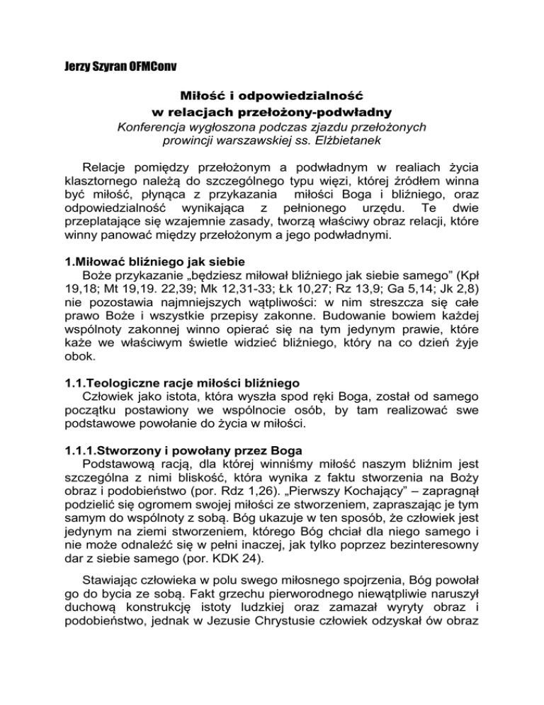 Jerzy Szyran OFMConv Miłość i odpowiedzialność w relacjach przełożony-podwładny Konferencja wygłoszona podczas zjazdu przełożonych prowincji warszawskiej ss. Elżbietanek Relacje pomiędzy przełożonym a podwładnym w realiach życia klasztornego należą do szczególnego typu więzi, której źródłem winna być miłość, płynąca z przykazania miłości Boga i bliźniego, oraz odpowiedzialność wynikająca z pełnionego urzędu. Te dwie przeplatające się wzajemnie zasady, tworzą właściwy obraz relacji, które winny panować między przełożonym a jego podwładnymi. 1.Miłować bliźniego jak siebie Boże przykazanie „będziesz miłował bliźniego jak siebie samego” (Kpł 19,18; Mt 19,19. 22,39; Mk 12,31-33; Łk 10,27; Rz 13,9; Ga 5,14; Jk 2,8) nie pozostawia najmniejszych wątpliwości: w nim streszcza się całe prawo Boże i wszystkie przepisy zakonne. Budowanie bowiem każdej wspólnoty zakonnej winno opierać się na tym jedynym prawie, które każe we właściwym świetle widzieć bliźniego, który na co dzień żyje obok. 1.1.Teologiczne racje miłości bliźniego Człowiek jako istota, która wyszła spod ręki Boga, został od samego początku postawiony we wspólnocie osób, by tam realizować swe podstawowe powołanie do życia w miłości. 1.1.1.Stworzony i powołany przez Boga Podstawową racją, dla której winniśmy miłość naszym bliźnim jest szczególna z nimi bliskość, która wynika z faktu stworzenia na Boży obraz i podobieństwo (por. Rdz 1,26). „Pierwszy Kochający” – zapragnął podzielić się ogromem swojej miłości ze stworzeniem, zapraszając je tym samym do wspólnoty z sobą. Bóg ukazuje w ten sposób, że człowiek jest jedynym na ziemi stworzeniem, którego Bóg chciał dla niego samego i nie może odnaleźć się w pełni inaczej, jak tylko poprzez bezinteresowny dar z siebie samego (por. KDK 24). Stawiając człowieka w polu swego miłosnego spojrzenia, Bóg powołał go do bycia ze sobą. Fakt grzechu pierworodnego niewątpliwie naruszył duchową konstrukcję istoty ludzkiej oraz zamazał wyryty obraz i podobieństwo, jednak w Jezusie Chrystusie człowiek odzyskał ów obraz z nowa twarzą – Jezusa Chrystusa. Stąd każdy powołany został do bycia z Bogiem w wiecznej szczęśliwości (por. Kpł 11,44). Każdy zatem człowiek pochodzi od Boga-Stwórcy, otrzymał od Niego zdolność do kochania i odbierania miłości oraz został powołany do udziału w wiecznej szczęśliwości. Oznacza to, że w swej naturze wszyscy jesteśmy braćmi i siostrami, którzy mają jednego Ojca. 1.1.2. Jak siebie samego Określenie zawarte w Bożym przykazaniu podaje sposób, w jaki człowiek ma kochać swego bliźniego. Oznacza to, że podstawą miłości do bliźniego jest miłość samego siebie, ponieważ: z takiej samej pobudki (dla Boga); z taką samą szczerością i bezinteresownością; przez wyświadczanie prawdziwego i rzeczywistego dobra. Ukazane powyżej zasady przekładają się w praktyce codziennego życia na konkretne postawy wobec bliźnich: życzliwość (por. Mt 8,5-8) i pragnienie dobra dla bliźniego. Szczególnym wzorem jest tu postawa Jezusa, który wyraża gotowość pójścia za setnikiem, by uzdrowić jego sługę; radowanie się z jego dobra i smucenie się ze zła. Jak podkreśla w swoim nauczaniu św. Paweł: „Weselcie się z tymi, którzy się weselą, płaczcie z tymi, którzy płaczą” (Rz 5,19); pozostawanie z bliźnim w zgodzie i pokoju: „Gniewajcie się, a nie grzeszcie: niech nad waszym gniewem nie zachodzi słońce!” (Ef 4,26); świadczenie bliźniemu różnego dobra, czyli tzw. dobroczynność; zaradzanie jego potrzebom, czyli okazywanie mu miłosierdzia (por. KKK 2447). Miłość bliźniego zasadza się na wspólnym dla każdego człowieka pochodzeniu od Boga oraz wspólnym celu, którym jest życie wieczne. Zatem fundamentem imperatywu miłowania bliźniego jest Bóg, który sam jest Miłością i podstawową racją miłości. Stąd bliźniego winniśmy miłować ze względu na Boga. 1.2. Działanie miłości Autentyczna miłość jest zdolna do działania. Pod jej wpływem zmieniają się postawy jednostek i grup społecznych. Miłość bowiem „nadaje formę jego [człowieka] wewnętrznemu bytowi i determinuje charakter jego działań” (K. Wojtyła). Stad można mówić o specyficznym działaniu miłości w relacjach przełożony-podwładny. 1.2.1. Miłość konsekrująca Cała historia relacji Bóg-człowiek pokazuje, że kluczowym motywem wszelkiego działania Bożego w życiu człowieka jest miłość, którą Stwórca odwiecznie ukochał swe stworzenie. Miłość zatem jako wyznacznik dobra, jakim Bóg darzy istotę ludzką, odwzorowywaną w codziennym życiu osób darzących się miłością, jest zdolna do uświęcania osoby ludzkiej. Miłość niejako pociąga człowieka do coraz pełniejszych i wznioślejszych form dobra. Bóg zatem jako jedyny dobry (por. Mk 10,18) staje się najwyższą formą dobra, którego człowiek winien pragnąć dla osoby kochanej. W konsekwencji oznacza to, że w relacjach przełożony-podwładny, jedynym motywem i pragnieniem wszelkiego działania winno być najwyższe Dobro, którego pragnie się dla drugiego. W ten sposób wspólnota zakonna wzajemnie obdarza siebie Bogiem, by coraz pełniej odpowiadać na Boży „obraz i podobieństwo”. Realizacja tego zadania staje się swoistą drogą uświęcania wspólnoty, które dokonuje się w podwójnym kluczu: pragnienia Boga dla człowieka i człowieka dla Boga. W tym kontekście człowiek jawi się jako kapłan w porządku natury, który ofiarowuje siebie i osobę kochaną Bogu. Na tej drodze wspólnota pod kierunkiem przełożonych realizuje na sobie program uświęcenia i powołanie do świętości. 1.2.2. Miłość otwiera na wartość człowieka Miłość uwrażliwia człowieka na wszelkie walory osoby ludzkiej. W konsekwencji ta wrażliwość prowadzi do zachwytu, który karmiony nieusta